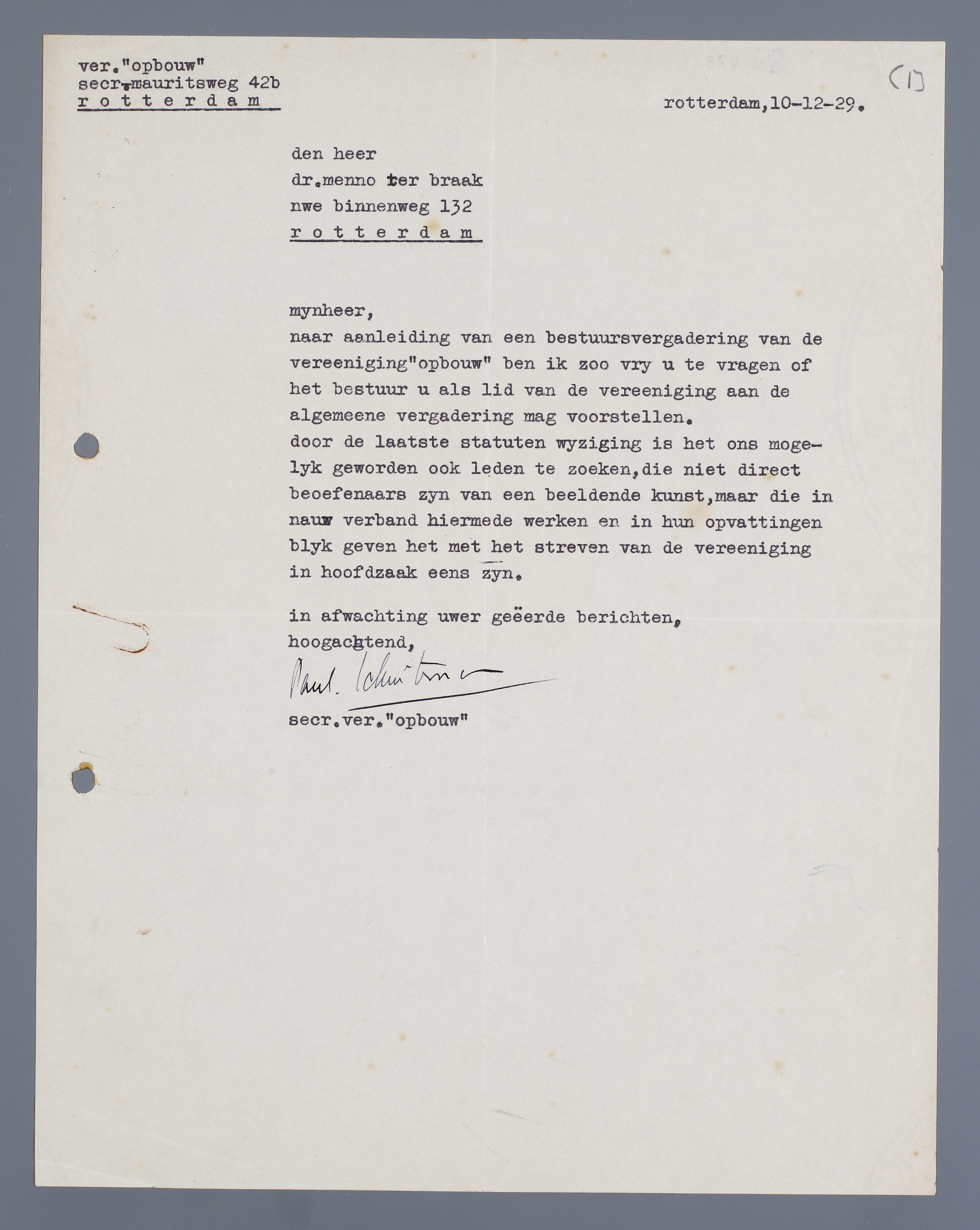 naar aanleiding van een bestuursvergadering van de vereeniging ‘opbouw’ ben ik zoo vrij u te vragen of het bestuur u als lid van de vereeniging aan de algemeene vergadering mag voorstellen.