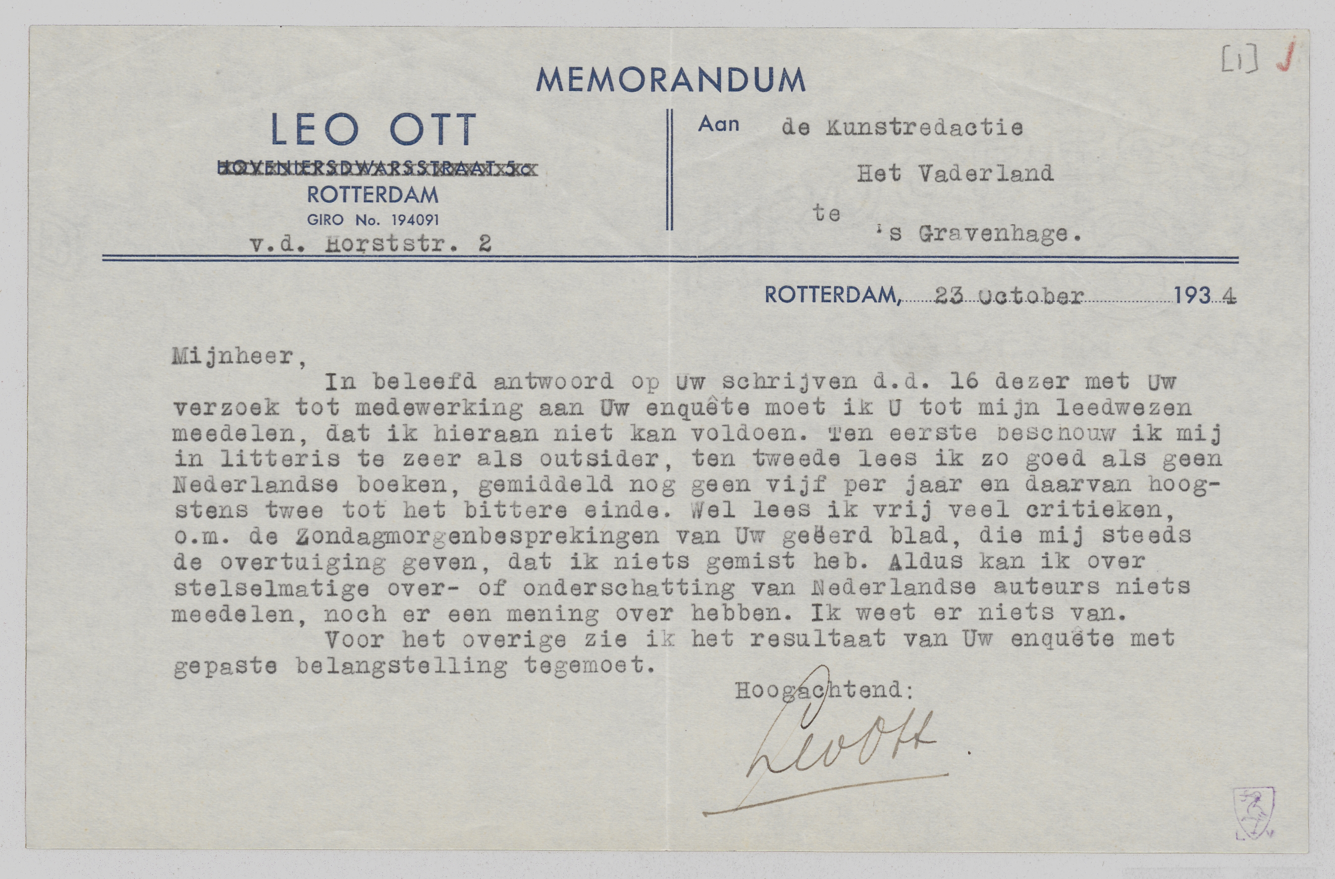 In beleefd antwoord op Uw schrijven d.d. 16 dezer met Uw verzoek tot medewerking aan Uw enquête moet ik U tot mijn leedwezen meedelen, dat ik hieraan niet kan voldoen. Ten eerste beschouw ik mij in litteris te zeer als outsider, ten tweede lees ik zo goed als geen Nederlandse boeken, gemiddeld nog geen vijf per jaar en daarvan hoogstens twee tot het bittere einde. Wel lees ik vrij veel critieken, o.m. de Zondagmorgenbesprekingen van Uw geëerd blad, die mij steeds de overtuiging geven, dat ik niets gemist heb. Aldus kan ik over stelselmatige over- of onderschatting van Nederlandse auteurs niets meedelen, noch er een mening over hebben. Ik weet er niets van.