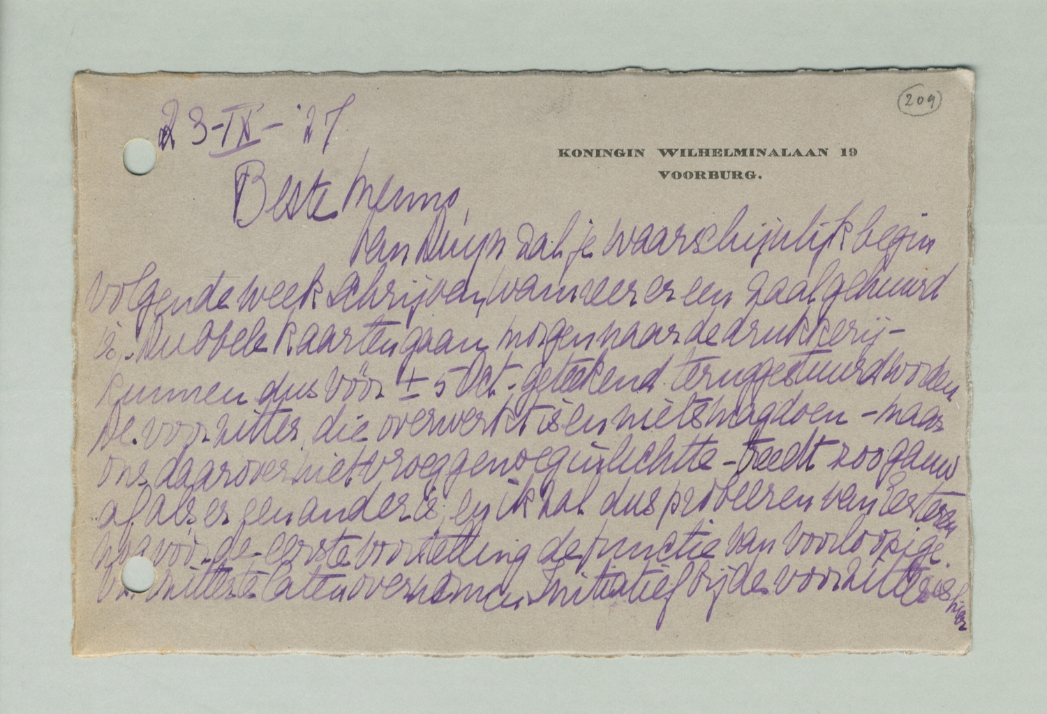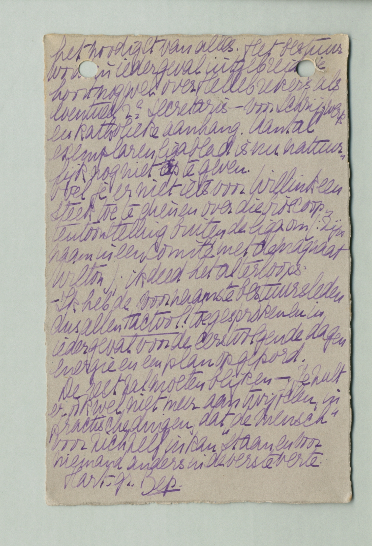 Van Duyn zal je waarschijnlijk begin volgende week schrijven, wanneer er een zaal gehuurd is. Dubbele kaarten gaan morgen naar de drukkerij - kunnen dus vóór plm. 5 Oct. geteekend teruggestuurd worden. De voorzitter die overwerkt is en niets mag doen - maar ons daarover niet vroeg genoeg inlichtte - treedt zoo gauw af als er een ander is, en ik zal dus probeeren van Eesteren nog voor de eerste voorstelling de functie van voorloopige voorzitter te laten overnemen. Initiatief bij de voorzitters is hier het noodigst van alles. Het bestuur wordt in ieder geval uitgebreid en je hoort nog even over Hellebrekers als eventueel 2e secretaris voor schrijfwerk en katholieke aanhang. Aantal exemplaren ligablad is nu natuurlijk nog niet op te geven.