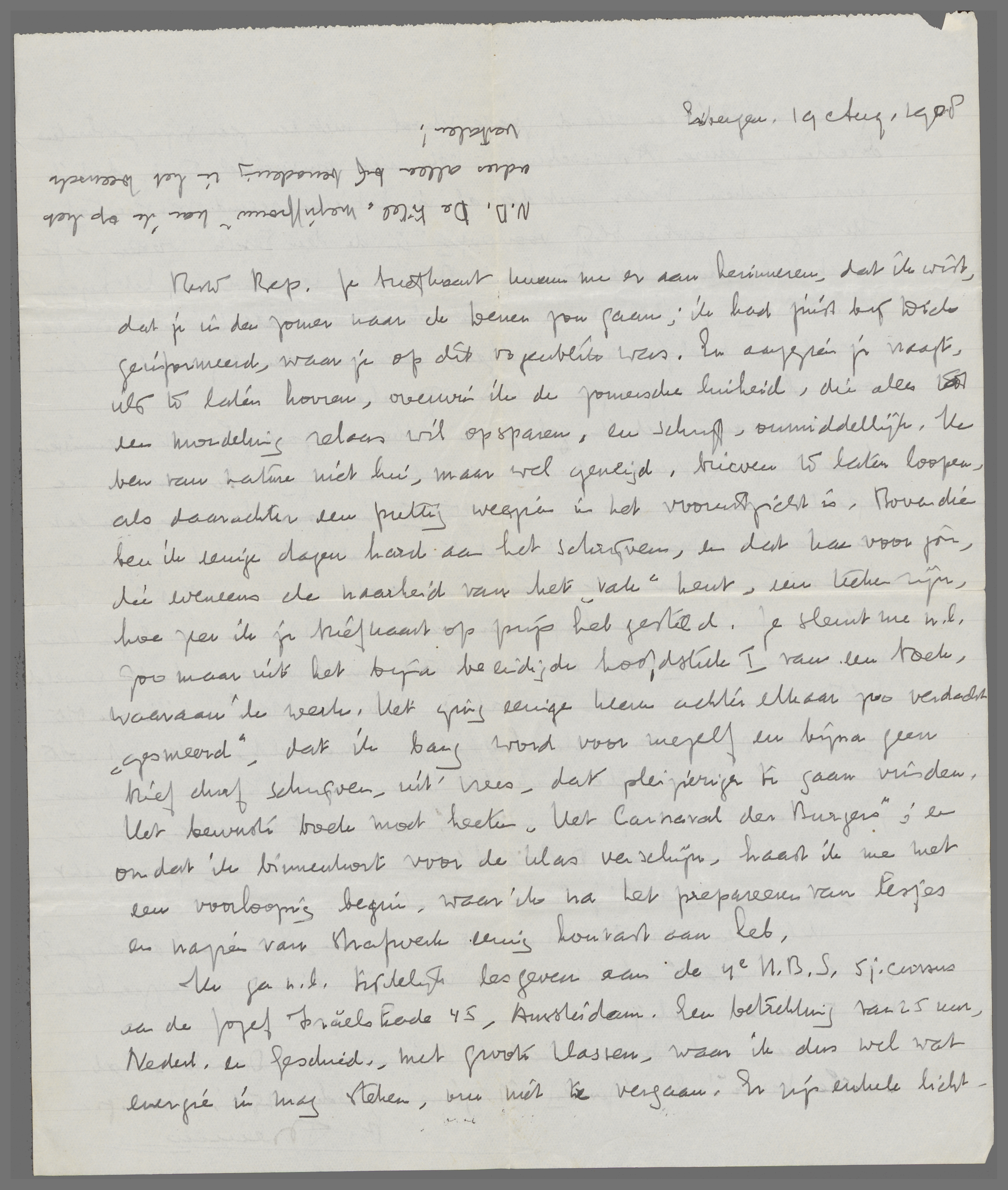 Ik ga n.l. tijdelijk lesgeven aan de 4e H.B.S. 5 j-cursus aan de Jozef Israëlskade 45, Amsterdam. Een betrekking van 25 uur, Nederl. en Geschied., met groote klassen, waar ik dus wel wat energie in mag steken, om niet te vergaan. Er zijn enkele lichtpunten: het is een erkend goede school, met een zeer sympathieke directeur, zekere A. Verschuur. Ook niet onvriendelijk is, dat ik zwaar verdien. Maar met dat al is het een vreemd perspectief. Ik begin 6 Sept., blijf voorloopig in de Den Texstr. wonen. - Je weet toch zeker, dat Dick in Baarn is benoemd aan het Lyceum? A.s. Dinsdag ga ik voor een paar dagen met allerlei wonderlijke populaire boekjes naar Zutfen, waar we dan gezamenlijk een soort plan de campagne zullen opmaken.