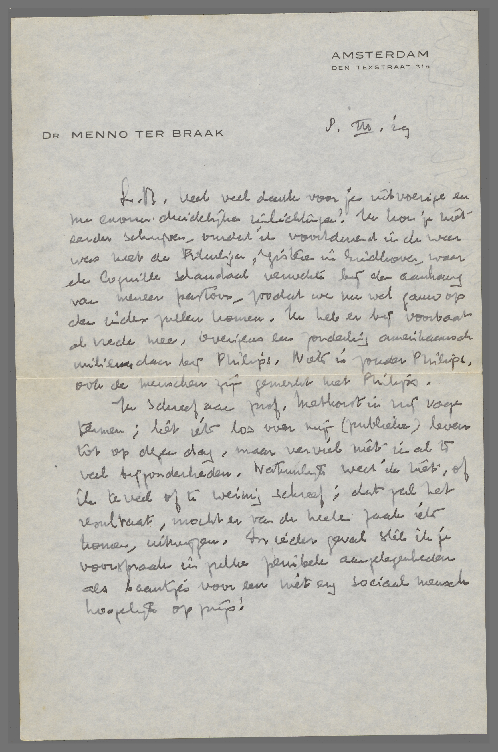 Heel veel dank voor je uitvoerige en nu enorm duidelijke inlichtingen! Ik kon je niet eerder schrijven, omdat ik voortdurend in de weer was met de Filmliga. Gisteren in Eindhoven, waar de Coquille schandaal verwekte bij den aanhang van meneer pastoor, zoodat we nu wel gauw op den index zullen komen. Ik heb er bij voorbaat al vrede mee. Overigens een zonderling amerikaansch milieu daar bij Philips. Niets is zonder Philips, ook de menschen zijn gemerkt met Philips.