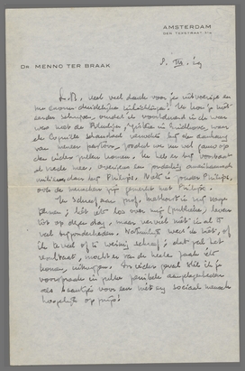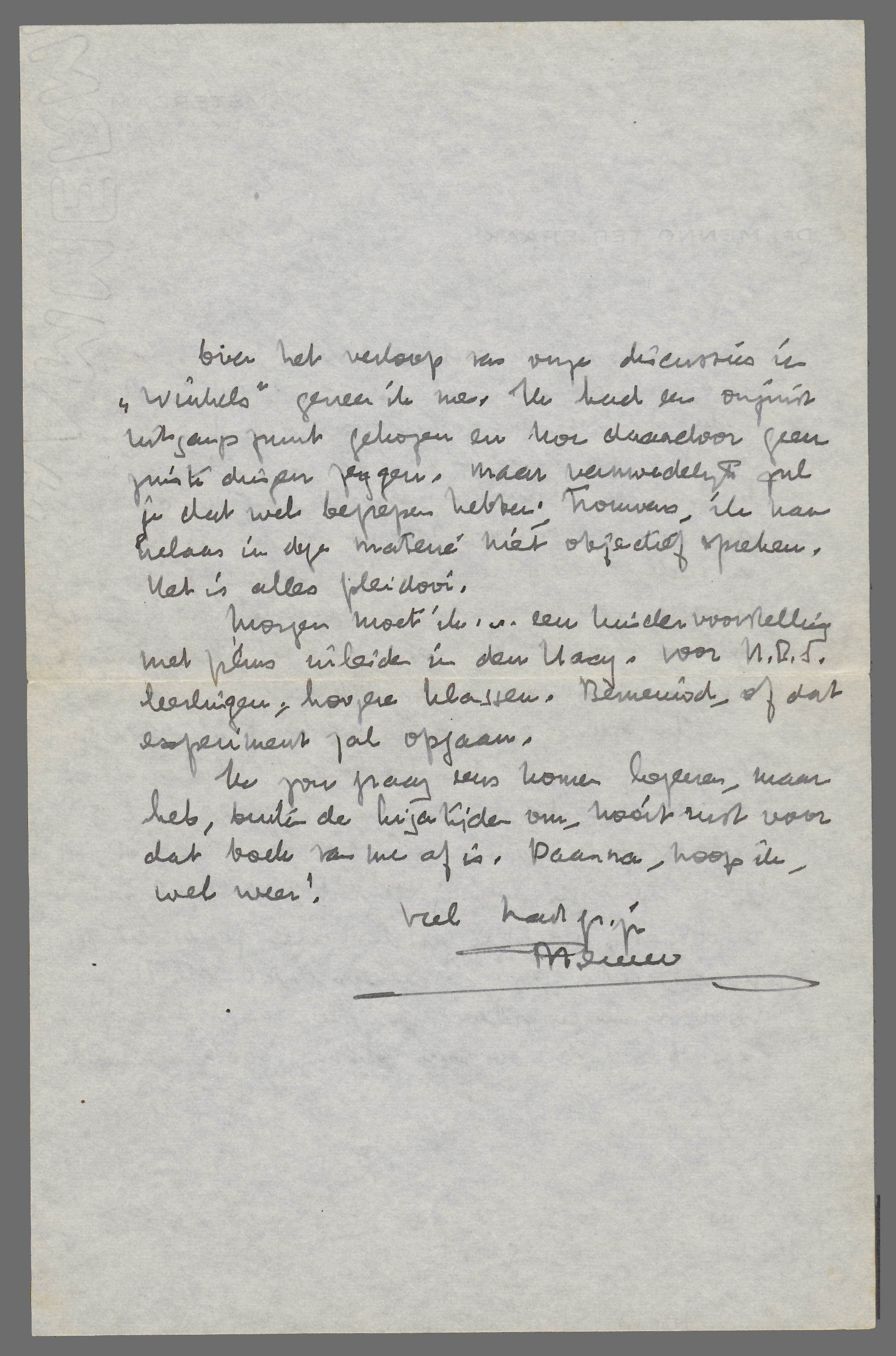 Ik schreef aan prof. Methorst in vrij vage termen; liet iets los over mijn (publieke) leven tot op deze dag, maar verviel niet in al te veel bijzonderheden. Natuurlijk weet ik niet, of ik te veel of te weinig schreef; dat zal het resultaat, mocht er van de heele zaak iets komen, uitwijzen. In ieder geval stel ik je voorspraak in zulke penibele aangelegenheden als baantjes voor een niet erg sociaal mensch hogelijk op prijs!