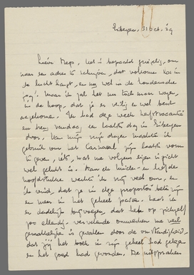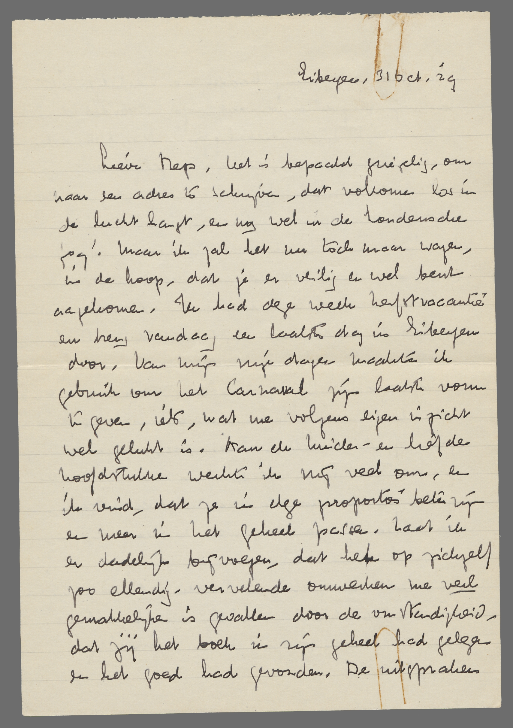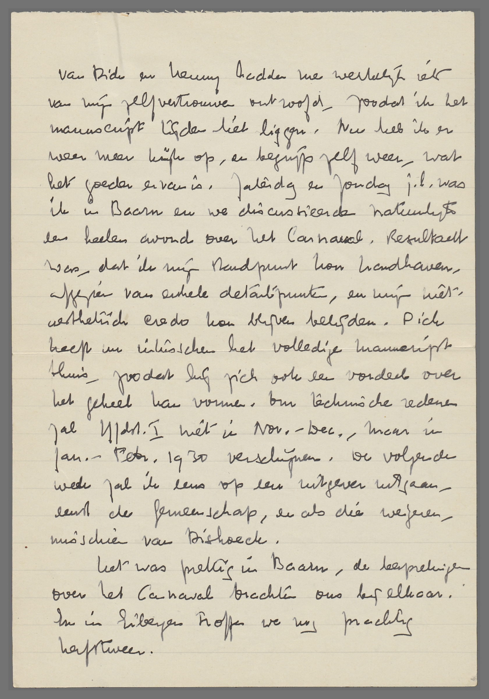 Het is bepaald griezelig, om naar een adres te schrijven, dat volkomen los in de lucht hangt, en nog wel in de Londensche fog! Maar ik zal het nu toch maar wagen, in de hoop, dat je er veilig en wel bent aangekomen. Ik had deze week herfstvacantie en breng vandaag een laatste dag in Eibergen door. Van mijn vrije dagen maakte ik gebruik om het Carnaval zijn laatste vorm te geven, iets, wat me volgens eigen inzicht wel gelukt is. Aan de kinder- en liefde hoofdstukken werkte ik nog veel om, en ik vind, dat ze in deze proporties beter zijn en meer in het geheel passen. Laat ik er dadelijk bijvoegen, dat het op zichzelf zoo ellendig, vervelende omwerken me veel gemakkelijker is gevallen door de omstandigheid, dat jij het boek in zijn geheel had gelezen en het goed had gevonden. De uitspraken van Dick en Henny hadden me werkelijk iets van mijn zelfvertrouwen ontroofd, zoodat ik het manuscript tijden liet liggen. Nu heb ik er weer meer kijk op, en begrijp zelf weer, wat het goede ervan is. Zaterdag en Zondag j.l. was ik in Baarn en we discussieerden natuurlijk een heelen avond over het Carnaval. Resultaat was, dat ik mijn standpunt kon handhaven, afgezien van enkele detailpunten, en mijn niet-aesthetisch credo kon blijven belijden. Dick heeft nu intusschen het volledige manuscript thuis, zoodat hij zich ook een oordeel over het geheel kan vormen. Om technische redenen zal hfdst I niet in Nov.-Dec., maar in Jan.-Febr. 1930 verschijnen. De volgende week zal ik eens op een uitgever uitgaan, eerst de Gemeenschap, en als die weigeren, misschien van Dishoeck.