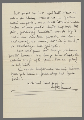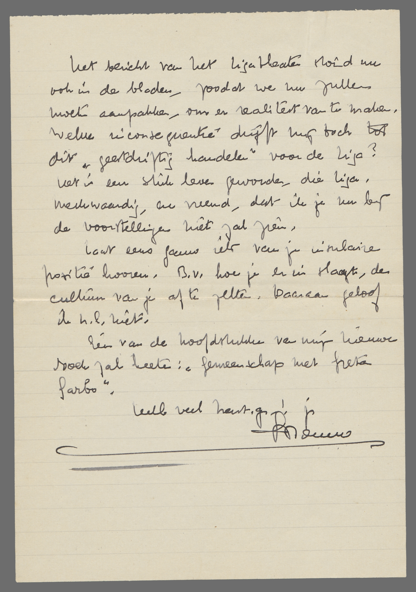 Het bericht van het Ligatheater stond nu ook in de bladen, zoodat we nu zullen moeten aanpakken, om er realiteit van te maken. Welke inconsequentie drijft mij toch tot dit ‘geestdriftig handelen’ voor de Liga? Het is een stuk leven geworden, die Liga. Merkwaardig, en vreemd, dat ik je nu bij de voorstellingen niet zal zien.