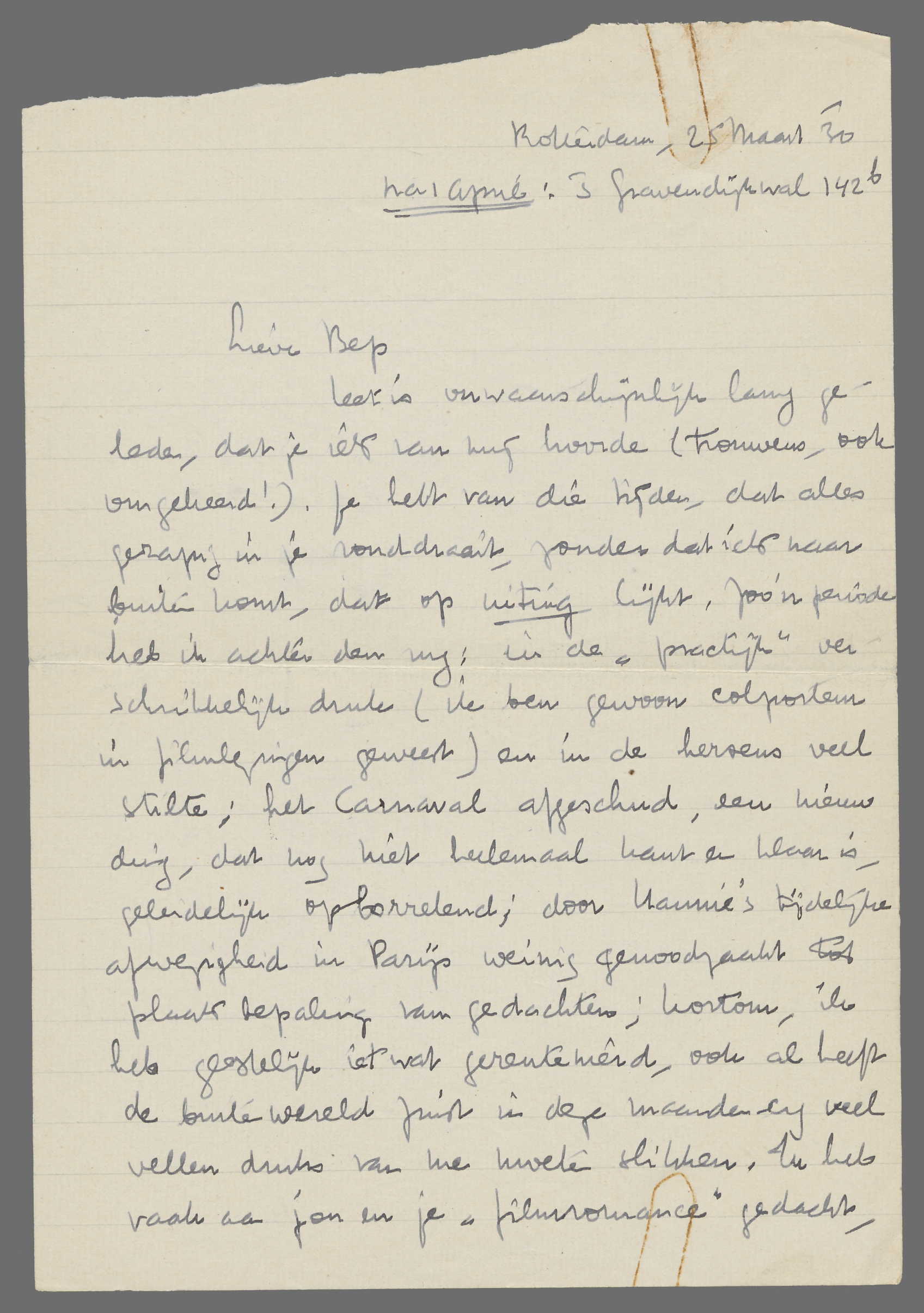 Het is onwaarschijnlijk lang geleden, dat je iets van mij hoorde (trouwens, ook omgekeerd!). Je hebt van die tijden, dat alles gezapig in je ronddraait, zonder dat iets naar buiten komt, dat op uiting lijkt. Zoo'n periode heb ik achter den rug: in de ‘practijk’ verschrikkelijk druk (ik ben gewoon colporteur in filmlezingen geweest) en in de hersens veel stilte; het Carnaval afgeschud, een nieuw ding, dat nog niet heelemaal klaar is, geleidelijk opborrelend; door Hannie's tijdelijke afwezigheid in Parijs weinig genoodzaakt tot plaatsbepaling van gedachten; kortom, ik heb geestelijk ietwat gerentenierd, ook al heeft de buitenwereld juist in deze maanden erg veel vellen druks van me moeten slikken. Ik heb vaak aan jou en je ‘filmromance’ gedacht, maar zonder de ware schrijf-energie. Hoe gaat het nu met jou? Kom je tegen Paschen weer terug?