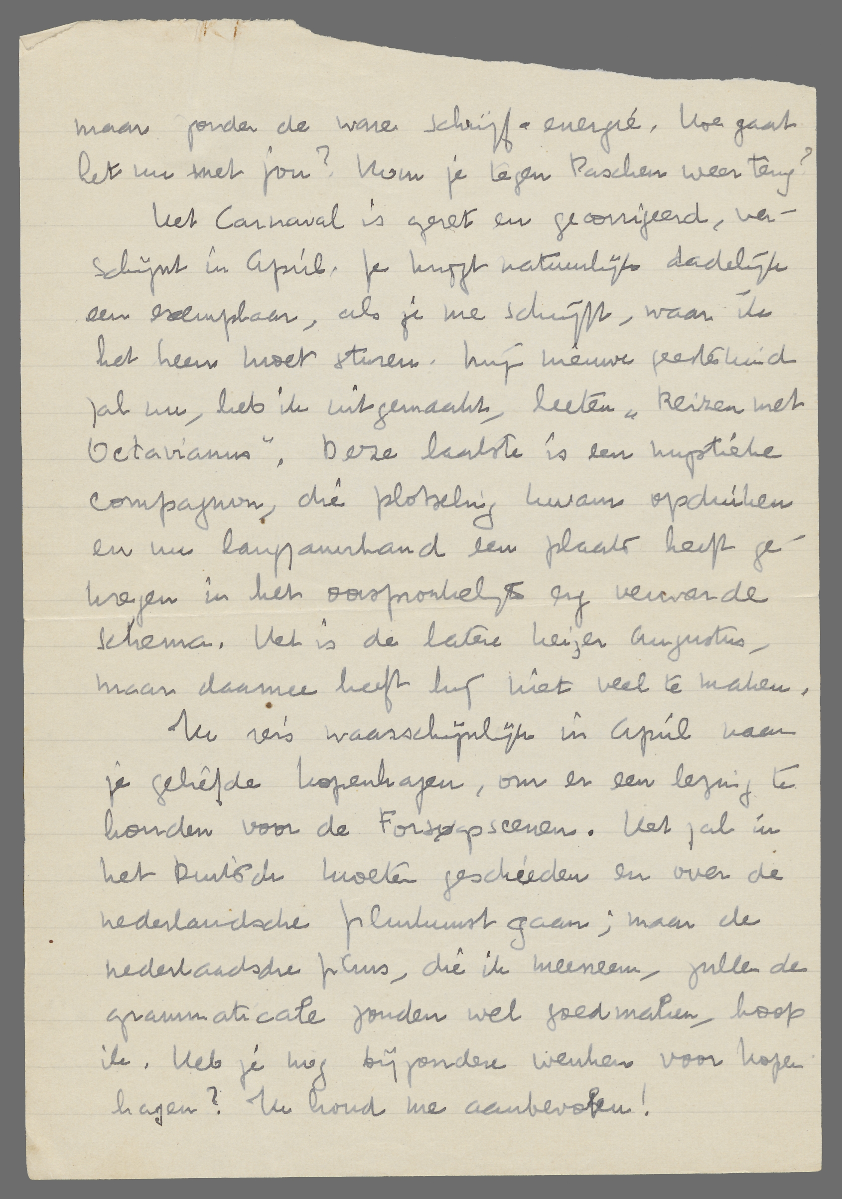 Het Carnaval is gezet en gecorrigeerd, verschijnt in April. Je krijgt natuurlijk dadelijk een exemplaar, als je me schrijft, waar ik het heen moet sturen. Mijn nieuwe geesteskind zal nu, heb ik uitgemaakt, heeten ‘Reizen met Octavianus’. Deze laatste is een mystieke compagnon, die plotseling kwam opduiken en nu langzamerhand een plaats heeft gekregen in het oorspronkelijk erg verwarde schema. Het is de latere keizer Augustus, maar daarmee heeft hij niet veel te maken.