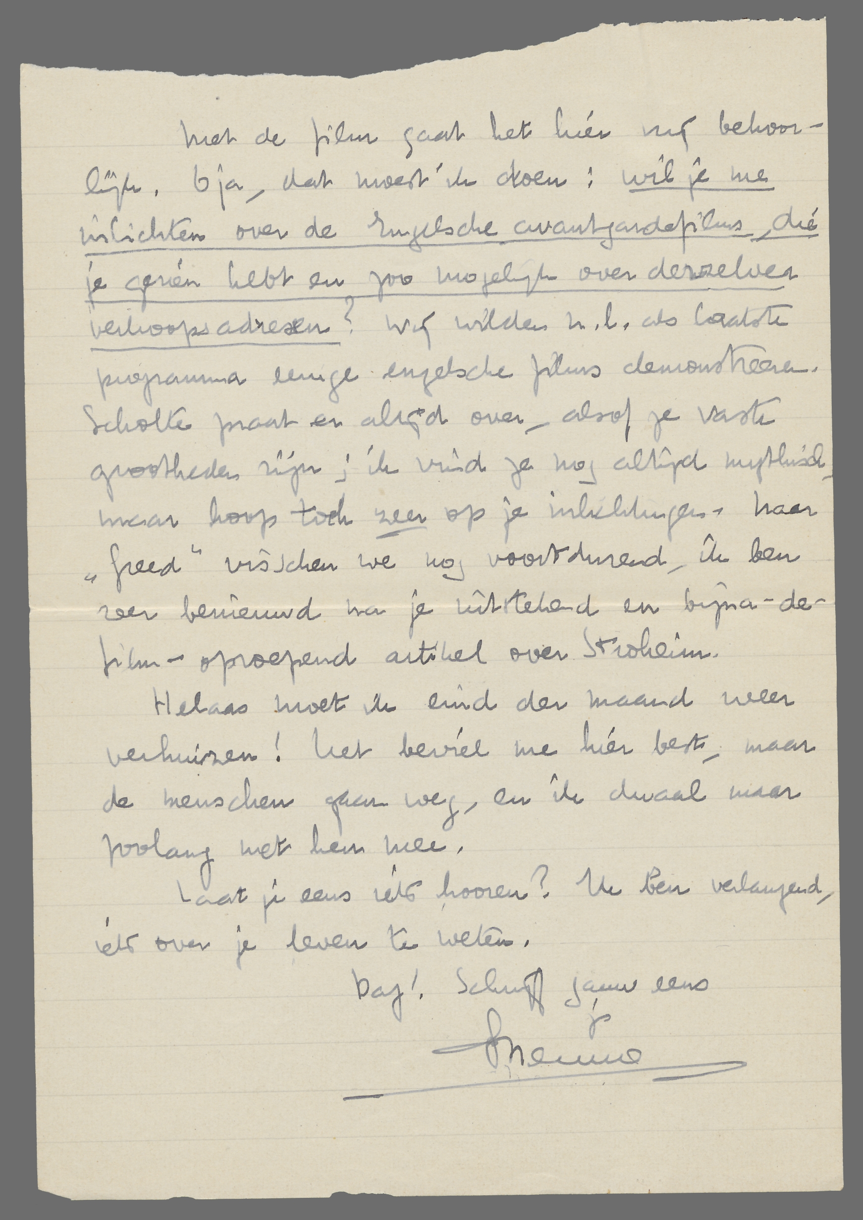 Met de film gaat het hier nog behoorlijk. O ja, dat moest ik doen: wil je me inlichten over de engelsche avantgardefilms, die je gezien hebt en zoo mogelijk over derzelven verkoopsadressen? Wij wilden n.l. als laatste programma eenige engelsche films demonstreeren. Scholte praat er altijd over, alsof ze vaste grootheden zijn; ik vind ze nog altijd mythisch, maar hoop toch zeer op je inlichtingen. Naar Greed visschen we nog voortdurend, ik ben zeer benieuwd na je uitstekend en bijna-de-film-oproepend artikel over Stroheim.