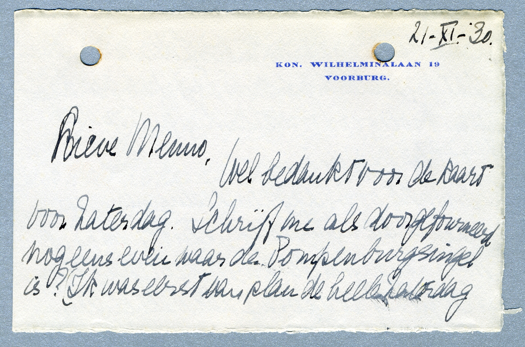 Wel bedankt voor de kaart voor Zaterdag. Schrijf me als doorgefourneerd nog eens even waar de Pompenburgsingel is? (Ik was eerst van plan de heele Zaterdag in R'dam aan ‘visites’ te besteden, maar doe dat bij nader inzien niet.) Ik kan me haast geen bioscoop voorstellen die niet op de Coolsingel zou zijn.