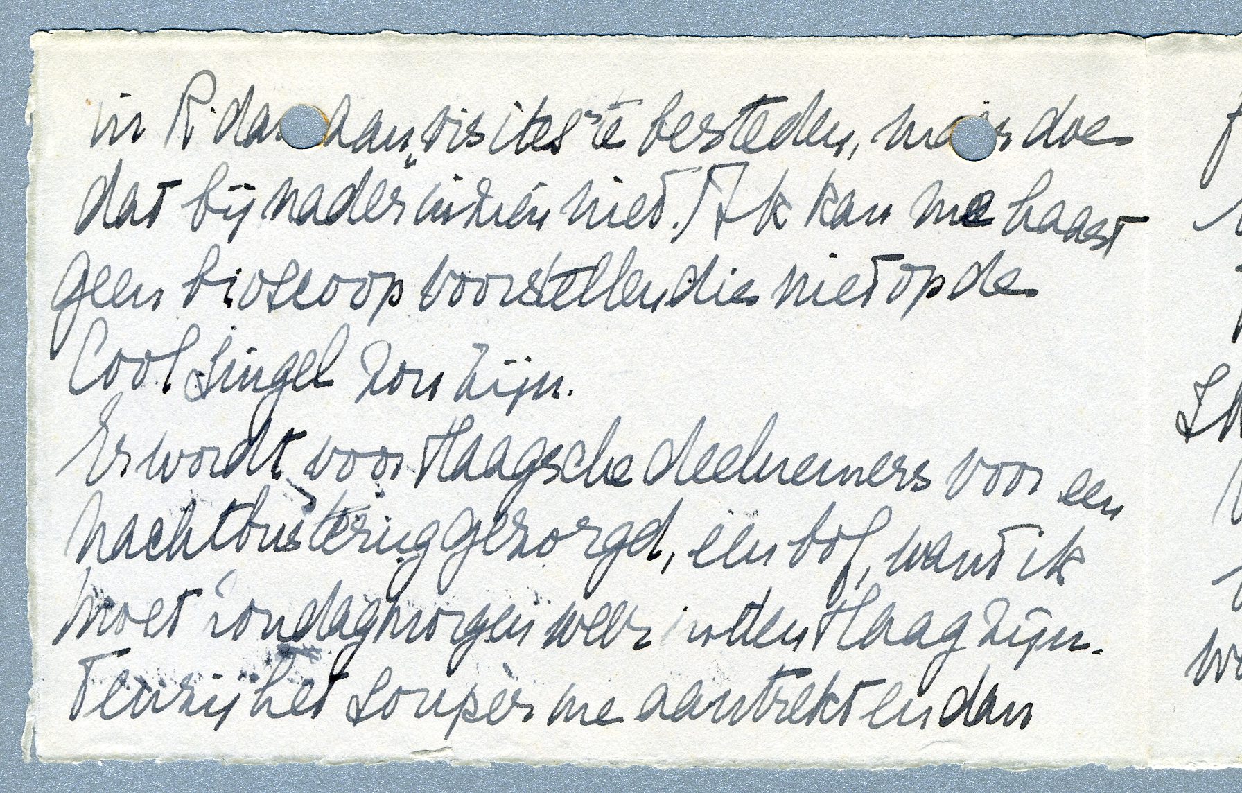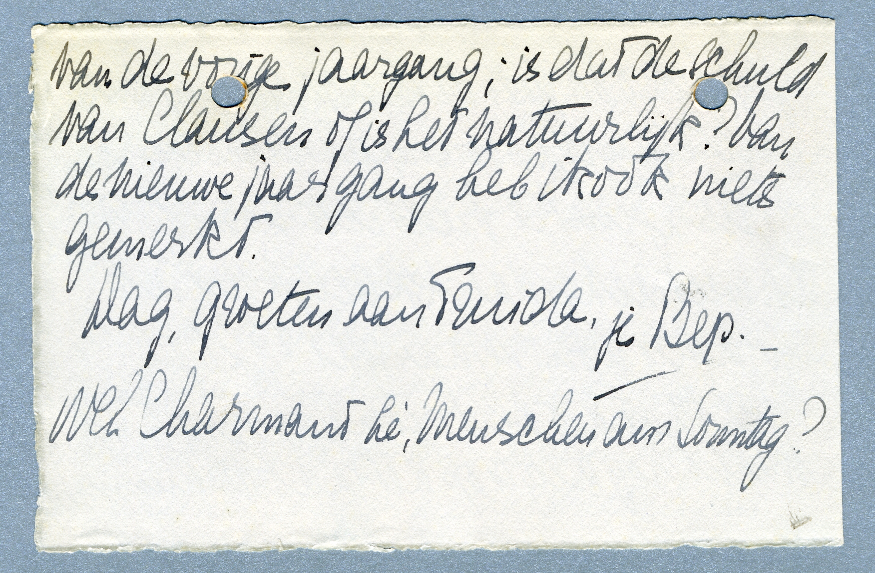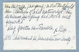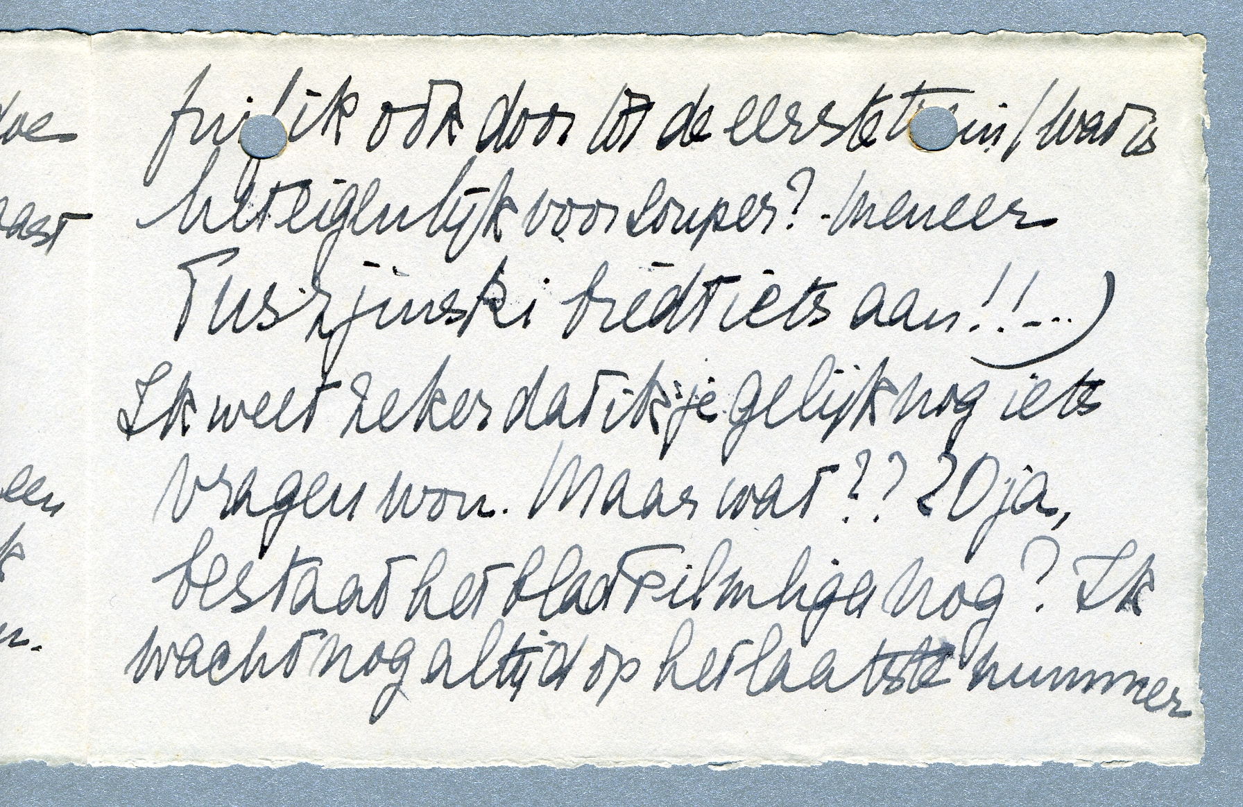 Er wordt voor Haagsche deelnemers voor een nachtbus terug gezorgd, een bof, want ik moet Zondagmorgen weer in den Haag zijn. Tenzij het Souper me aantrekt en dan fuif ik ook door tot de eerste trein (wat is het eigenlijk voor souper? Meneer Tuszjinski biedt iets aan!!...) Ik weet zeker dat ik je gelijk nog iets vragen wou. Maar wat??? O, ja, bestaat het blad Filmliga nog? Ik wacht nog altijd op het laatste nummer van de vorige jaargang; is dat de schuld van Clausen of is het natuurlijk? Van de nieuwe jaargang heb ik ook niets gemerkt.