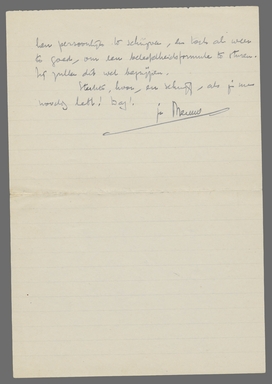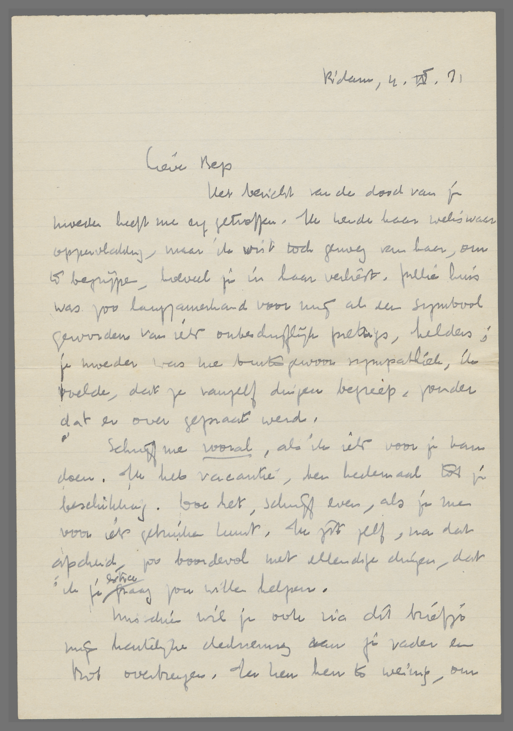 Het bericht van de dood van je moeder heeft me erg getroffen. Ik kende haar weliswaar oppervlakkig, maar ik wist toch genoeg van haar, om te begrijpen, hoeveel je in haar verliest. Jullie huis was zoo langzamerhand voor mij al een symbool geworden van iets onbeschrijflijk prettigs, helders; je moeder was me buitengewoon sympathiek, ik voelde, dat ze vanzelf dingen begreep, zonder dat er over gepraat werd.