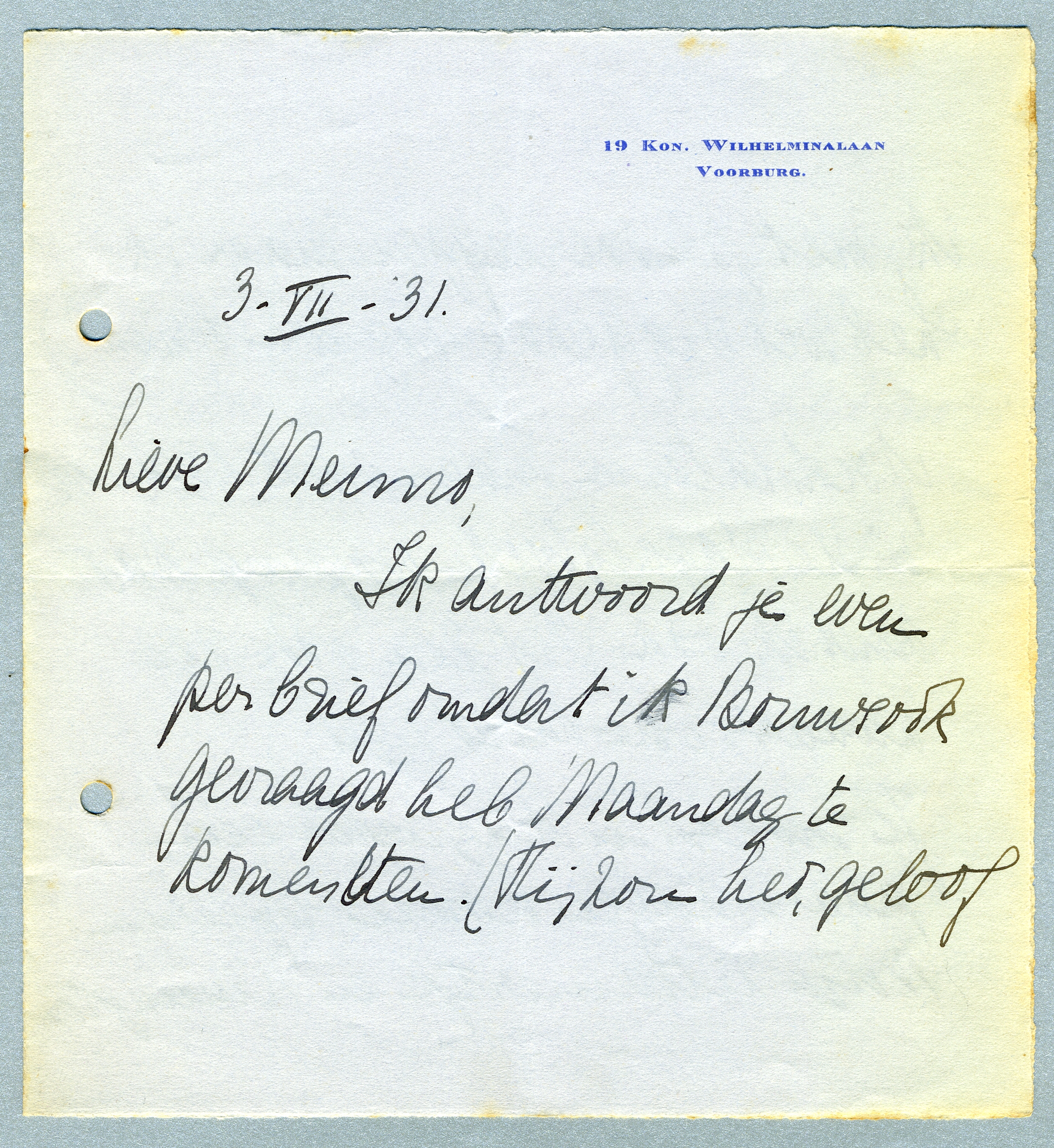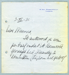 Ik antwoord je even per brief omdat ik Bouws ook gevraagd heb Maandag te komen eten. (Hij zou het, geloof ik, met jou overleggen, maar ik heb wel erg graag nog even bericht.)
