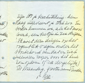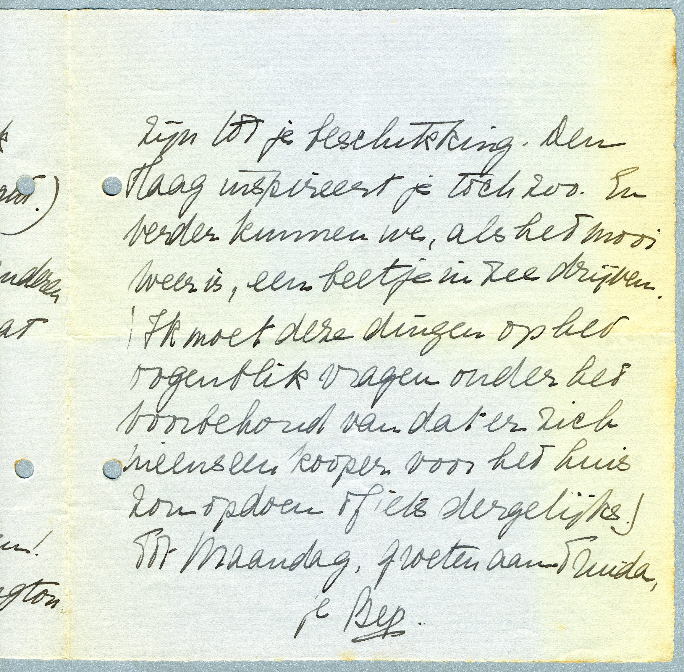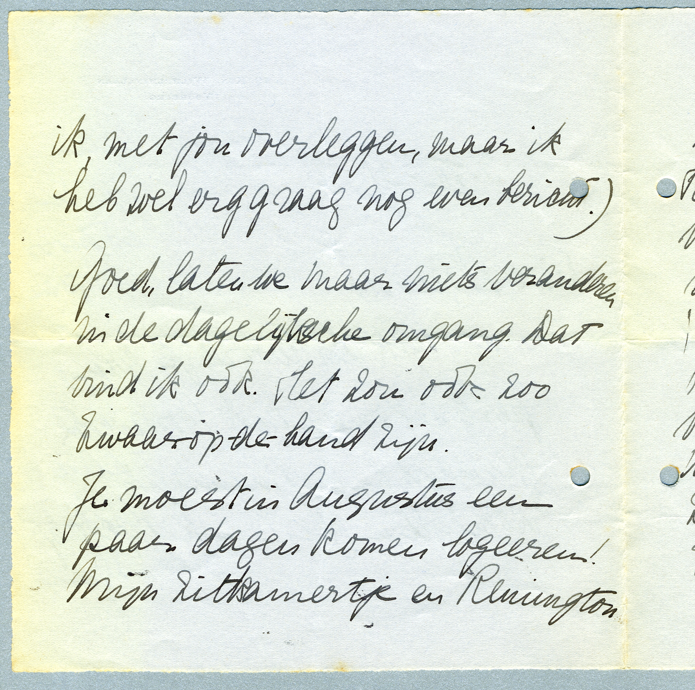 Je moest in Augustus een paar dagen komen logeeren! Mijn zitkamertje en Remington zijn tot je beschikking. Dan Haag inspireert je toch zoo. En verder kunnen we, als het mooi weer is, een beetje in zee drijven. Ik moet deze dingen op het oogenblik vragen onder het voorbehoud van dat er zich ineens een kooper voor het huis zou opdoen of iets dergelijks.)