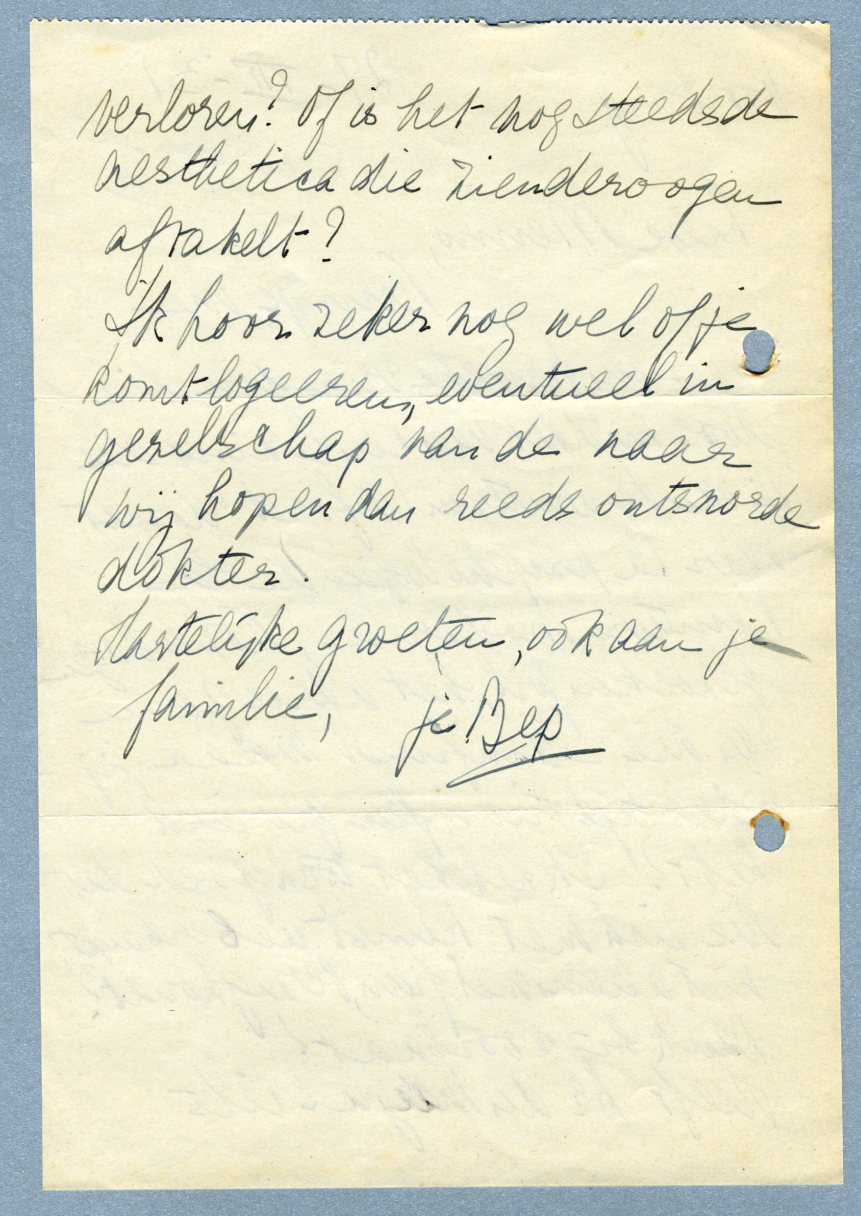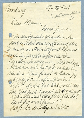 Kun je me voor een fransche vriendin die door middel van een lezing die ze van de winter in Oxford houdt over La psychologie de la Peinture moderne, Kopenhagen bezoeken wil, het adres geven van die Samfund waar jij indertijd triomfen gevierd hebt? Ik heb het toch goed dat die zich met kunst ueberhaupt, niet alleen met film, bezighoudt?