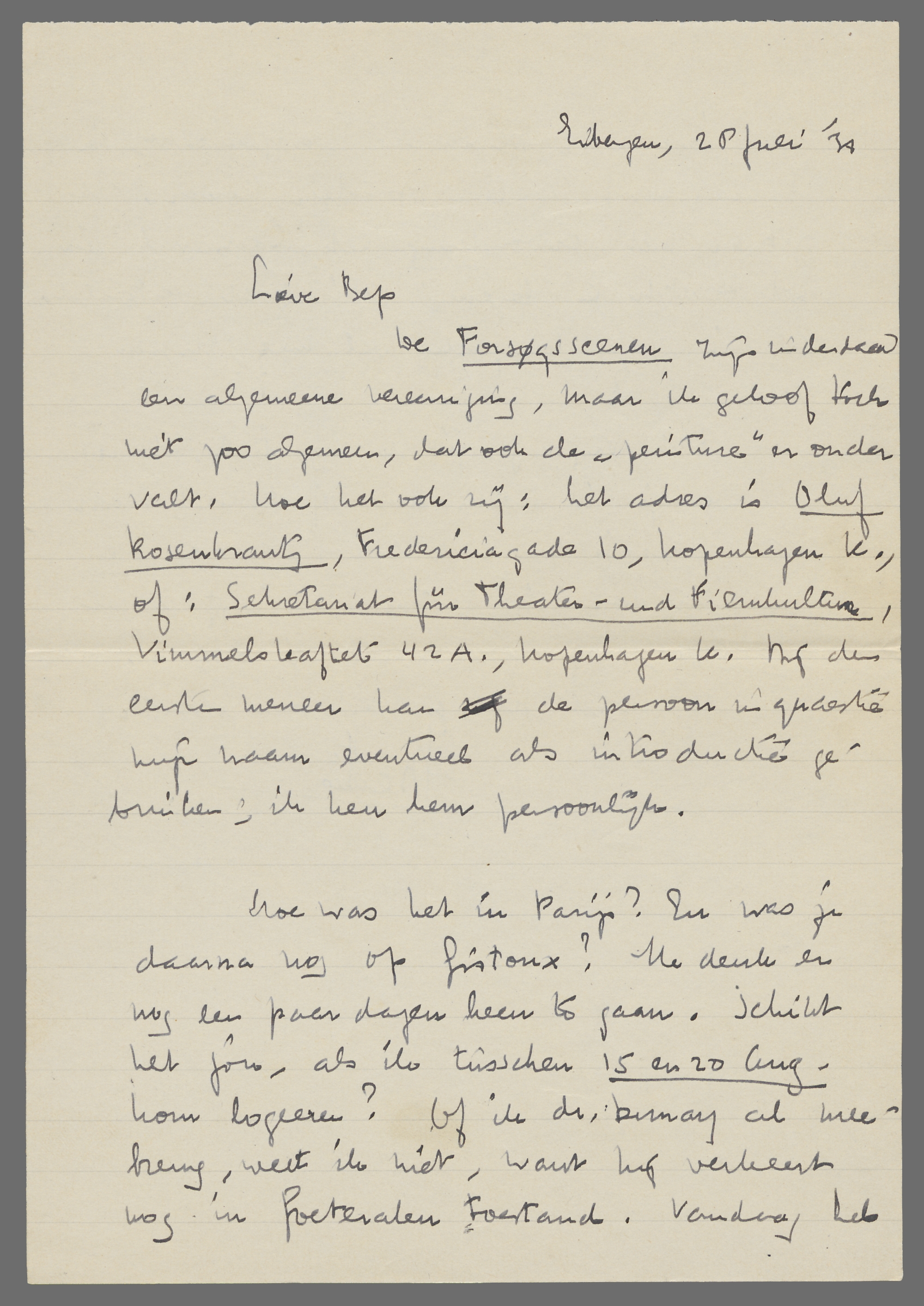 De Forsøgsscenen zijn inderdaad een algemeene vereeniging, maar ik geloof toch niet zoo algemeen, dat ook de ‘peinture’ er onder valt. Hoe het ook zij: het adres is Olaf Rosenkrantz, Fredericiagade 10, Kopenhagen K., of: Sekretariat für Theater- und Filmkulture, Vimmelskaftet 42A., Kopenhagen K. Bij den eersten meneer kan de persoon in quaestie mijn naam eventueel als introductie gebruiken; ik ken hem persoonlijk.
