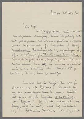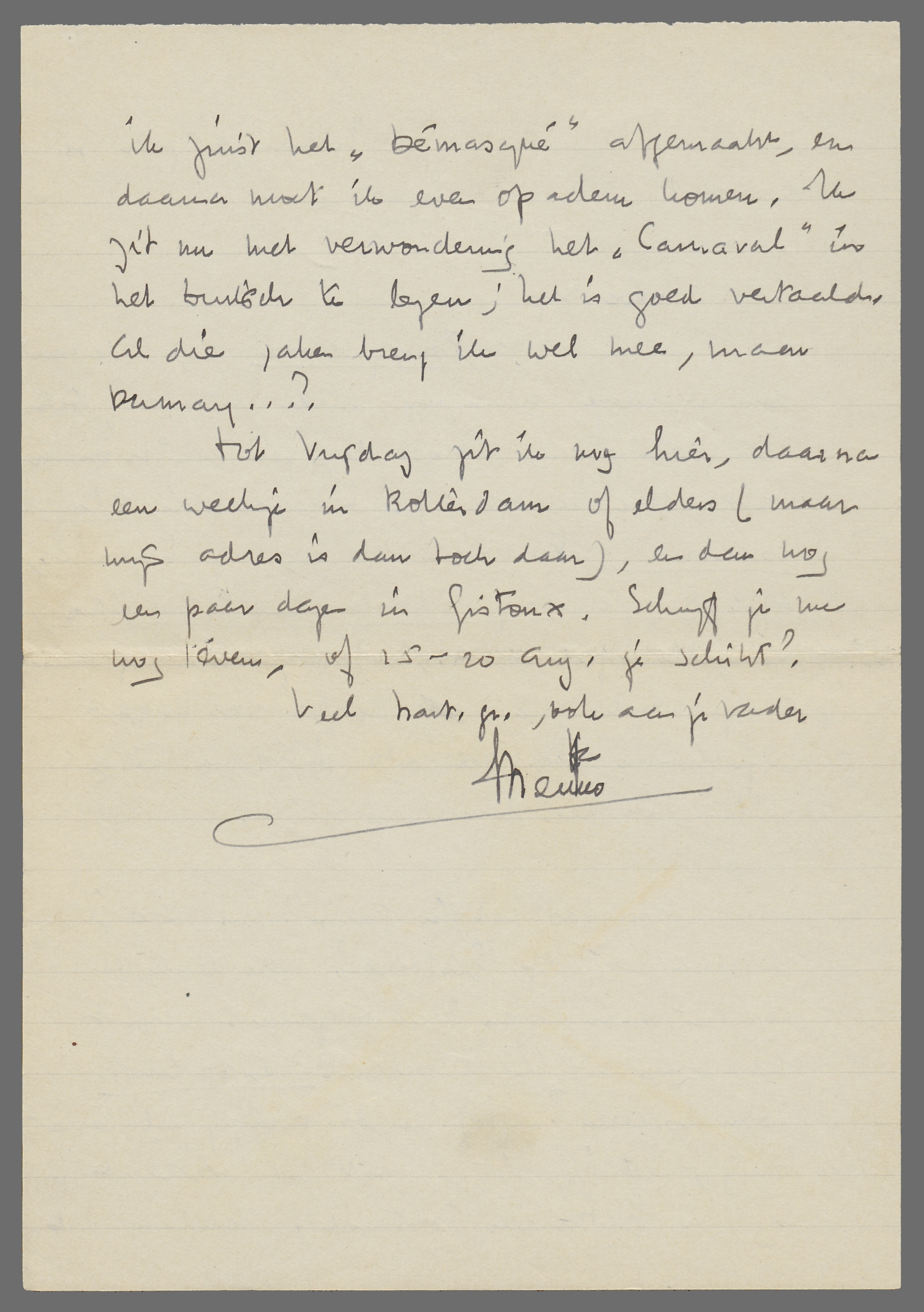 Hoe was het in Parijs? En was je daarna nog op Gistoux? Ik denk er nog een paar dagen heen te gaan. Schikt het jou, als ik tusschen 15 en 20 Aug. kom logeeren? Of ik Dr. Dumay al meebreng, weet ik niet, want hij verkeert nog in foeteralen toestand. Vandaag heb ik juist het Démasqué afgemaakt, en daarna moet ik even op adem komen. Ik zit nu met verwondering het Carnaval in het Duitsch te lezen; het is goed vertaald. Al die zaken breng ik wel mee, maar Dumay...?