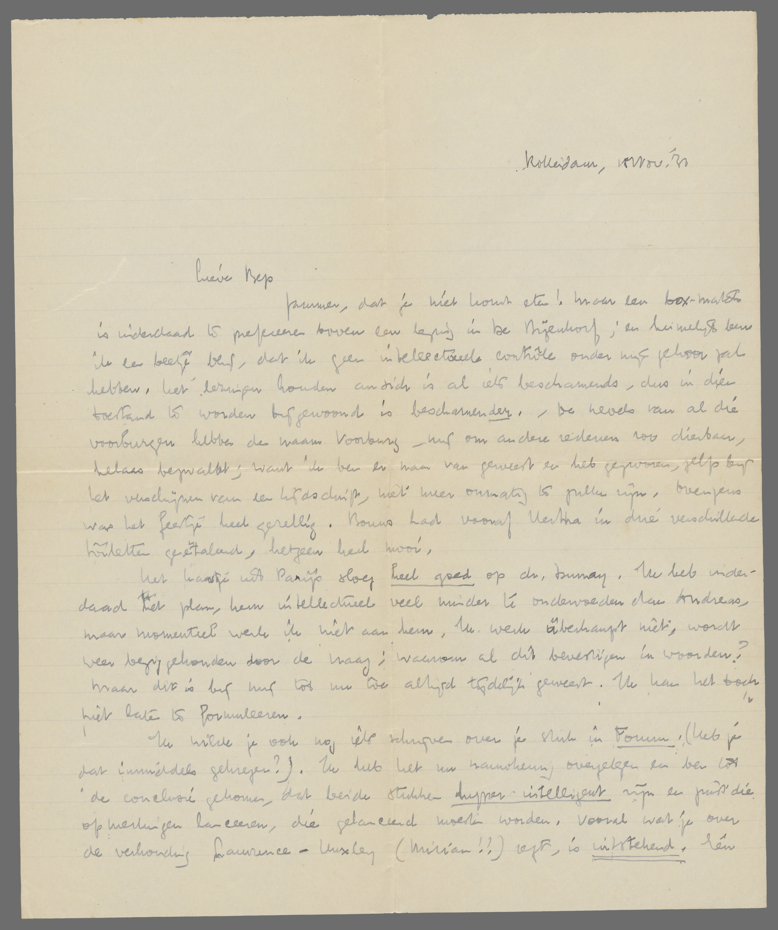 Jammer, dat je niet komt eten! Maar een box-match is inderdaad te prefereeren boven een lezing in De Bijenkorf; en heimelijk ben ik een beetje blij, dat ik geen intellectueele controle onder mijn gehoor zal hebben. Het lezingen houden an sich is al iets beschamends, dus in dien toestand te worden bijgewoond is beschamender. - De nevels van al die voorburgen hebben den naam Voorburg, mij om andere redenen zoo dierbaar, helaas bezwalkt; want ik ben er naar van geweest en heb gezworen, zelfs bij het verschijnen van een liefdesduif, niet meer onmatig te zullen zijn. Overigens was het feestje heel gezellig. Bouws had vooraf Hertha in drie verschillende toiletten geëtaleerd, hetgeen heel mooi.