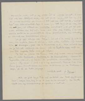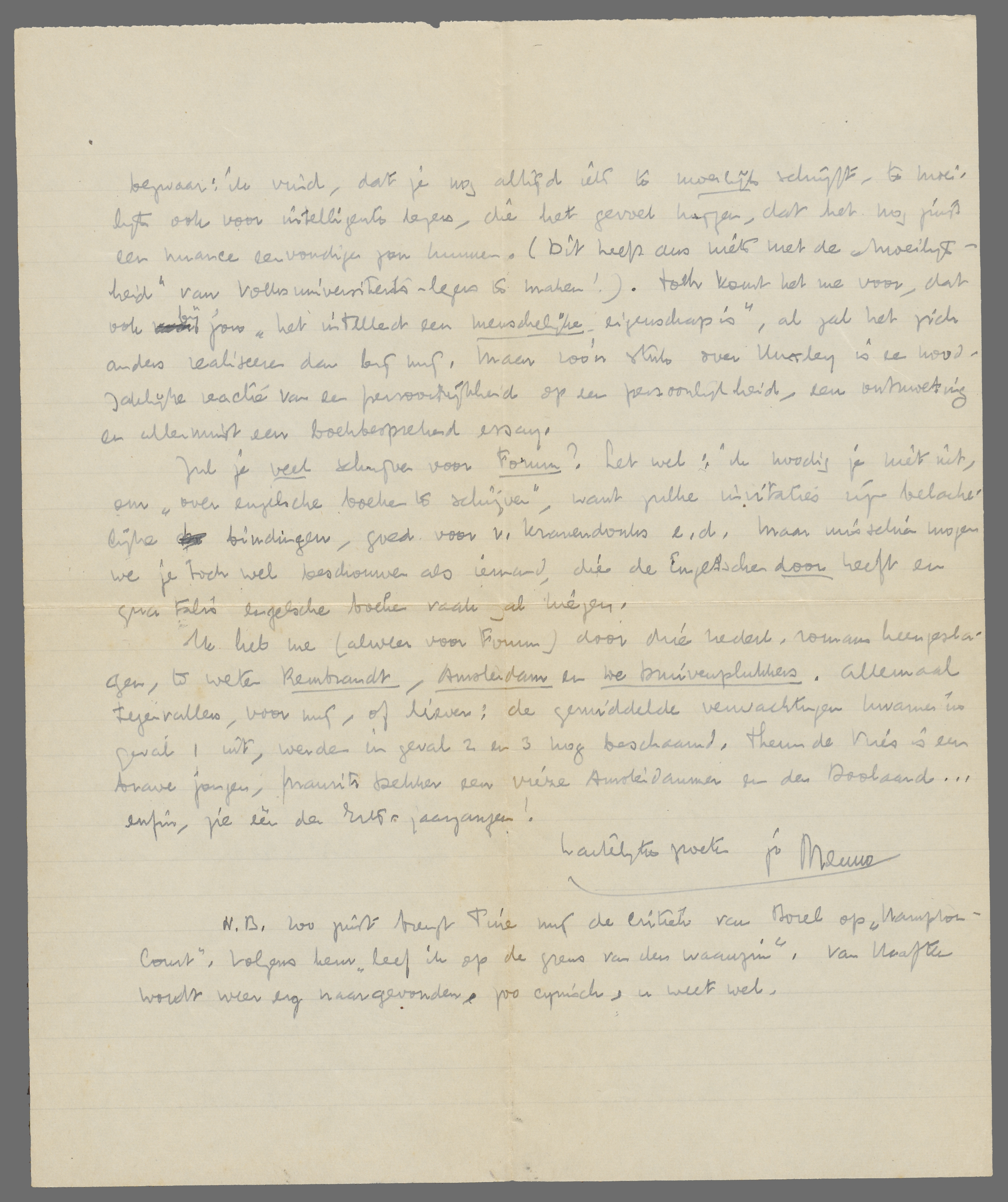 Ik wilde je ook nog iets schrijven over je stuk in Forum. (Heb je dat inmiddels gekregen?) Ik heb het nu nauwkeurig overgelezen en ben tot de conclusie gekomen, dat beide stukken hyper-intelligent zijn en juist die opmerkingen lanceeren, die gelanceerd moesten worden. Vooral wat je over de verhouding Lawrence - Huxley (Miriam!!) zegt, is uitstekend. Eén bezwaar: ik vind, dat je nog altijd iets te moeilijk schrijft, te moeilijk ook voor intelligente lezers, die het gevoel krijgen, dat het nog juist een nuance eenvoudiger zou kunnen. (Dit heeft dus niets met de ‘moeilijkheid’ van Volksuniversiteits-lezers te maken!) Toch komt het me voor, dat ook bij jou ‘het intellect een menschelijke eigenschap is’, al zal het zich anders realiseeren dan bij mij. Maar zoo'n stuk over Huxley is een noodzakelijke reactie van een persoonlijkheid op een persoonlijkheid, een ontmoeting en allerminst een boekbesprekend essay.