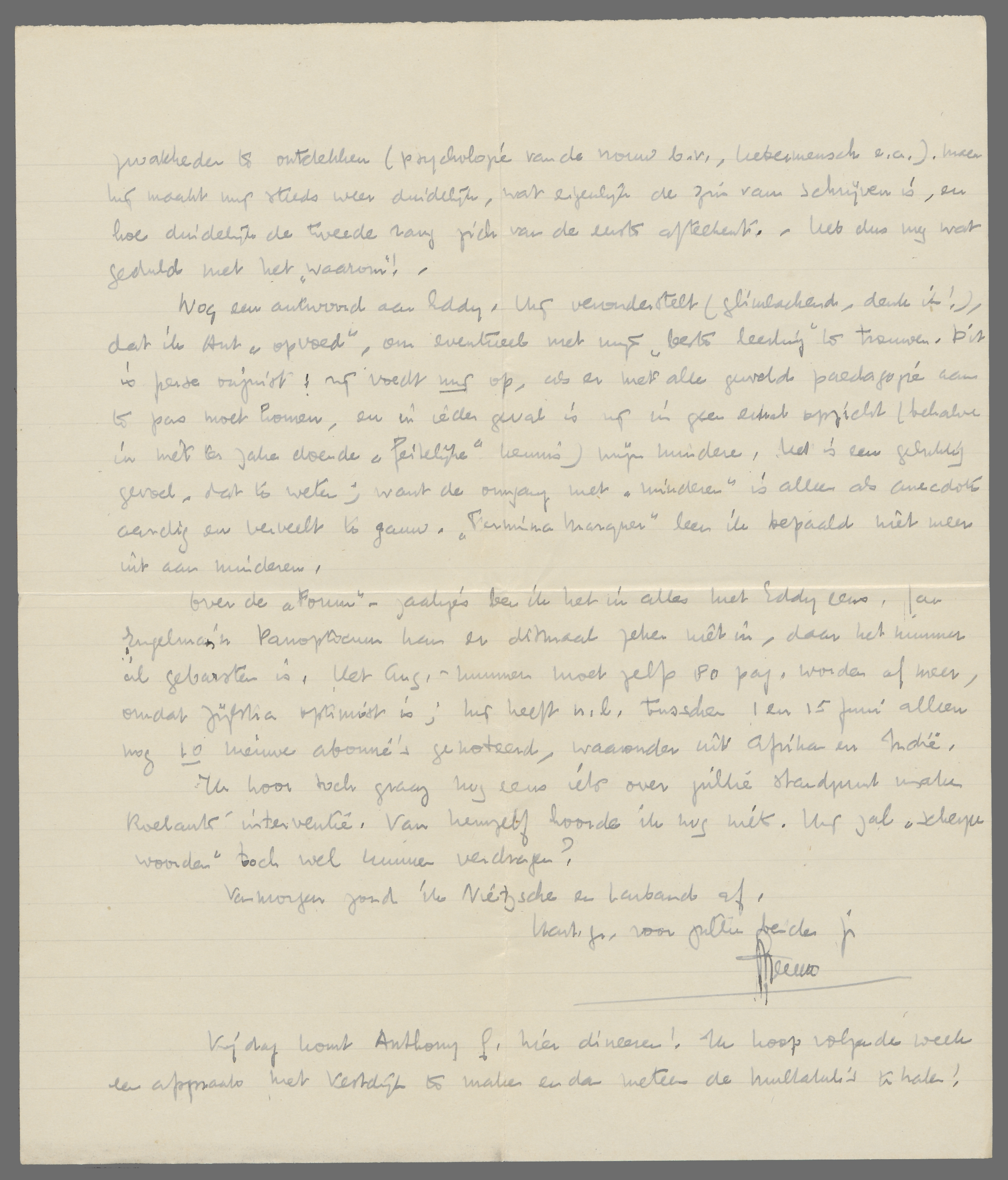 Over de Forum-zaakjes ben ik het in alles met Eddy eens. Jan Engelman's Panopticum kan er ditmaal zeker niet in, daar het nummer al gebarsten is. Het Aug.-nummer moet zelfs 80 pag. worden of meer, omdat Zijlstra optimist is; hij heeft n.l. tusschen 1 en 15 Juni alleen nog 10 nieuwe abonné's genoteerd, waaronder uit Afrika en Indië.