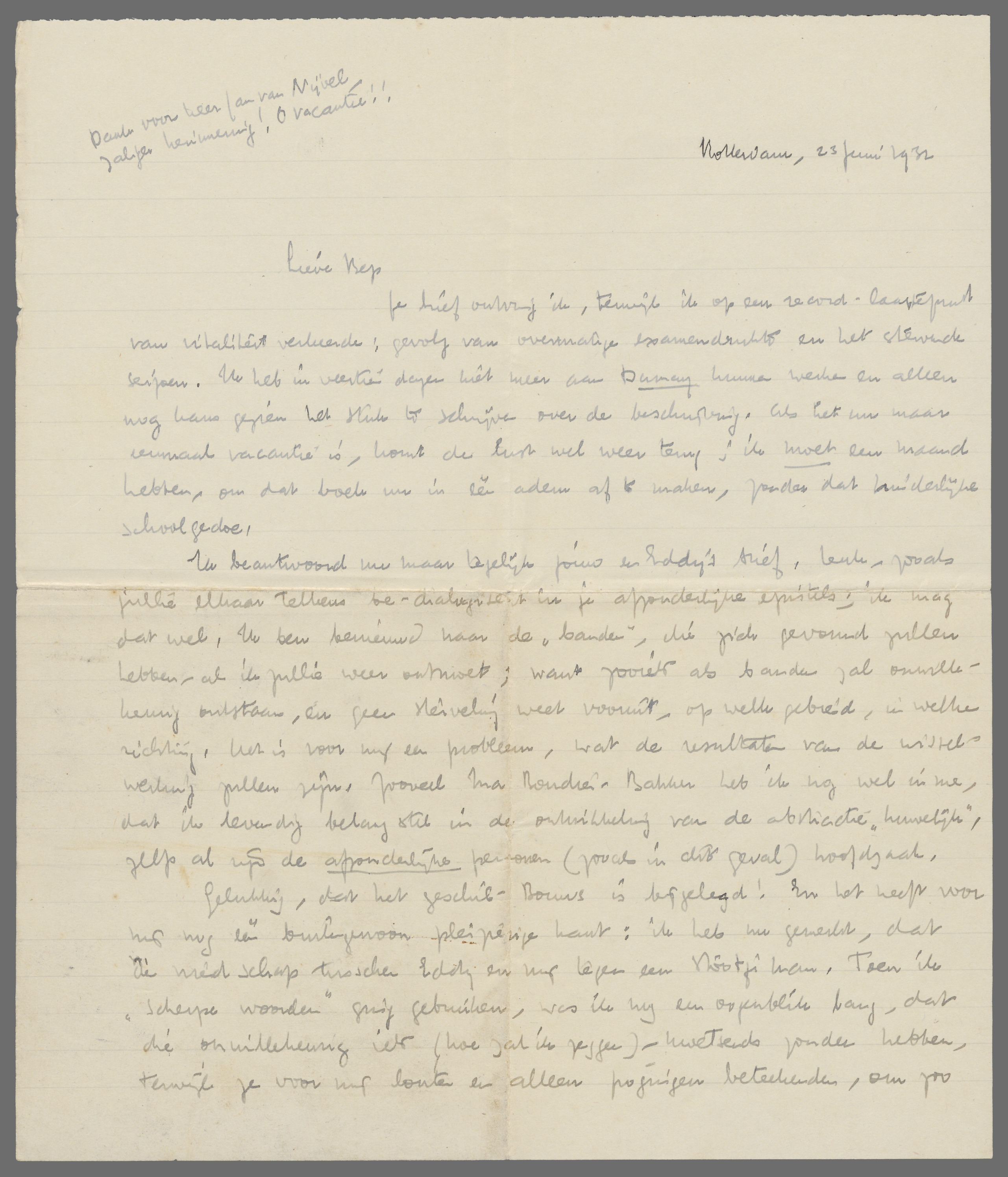 Ik beantwoord nu maar tegelijk jouw en Eddy's brief. Leuk, zooals jullie elkaar telkens be-dialogiseert in je afzonderlijke epistels; ik mag dat wel. Ik ben benieuwd naar de ‘banden’, die zich gevormd zullen hebben, als ik jullie weer ontmoet; want zooiets als banden zal onwillekeurig ontstaan, en geen sterveling weet vooruit, op welk gebied, in welke richting. Het is voor mij een probleem, wat de resultaten van de wisselwerking zullen zijn. Zooveel Ina Boudier-Bakker heb ik nog wel in me, dat ik levendig belang stel in de ontwikkeling van de abstractie ‘huwelijk’, zelfs al zijn de afzonderlijke personen (zooals in dit geval) hoofdzaak.