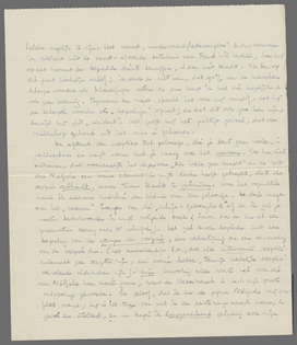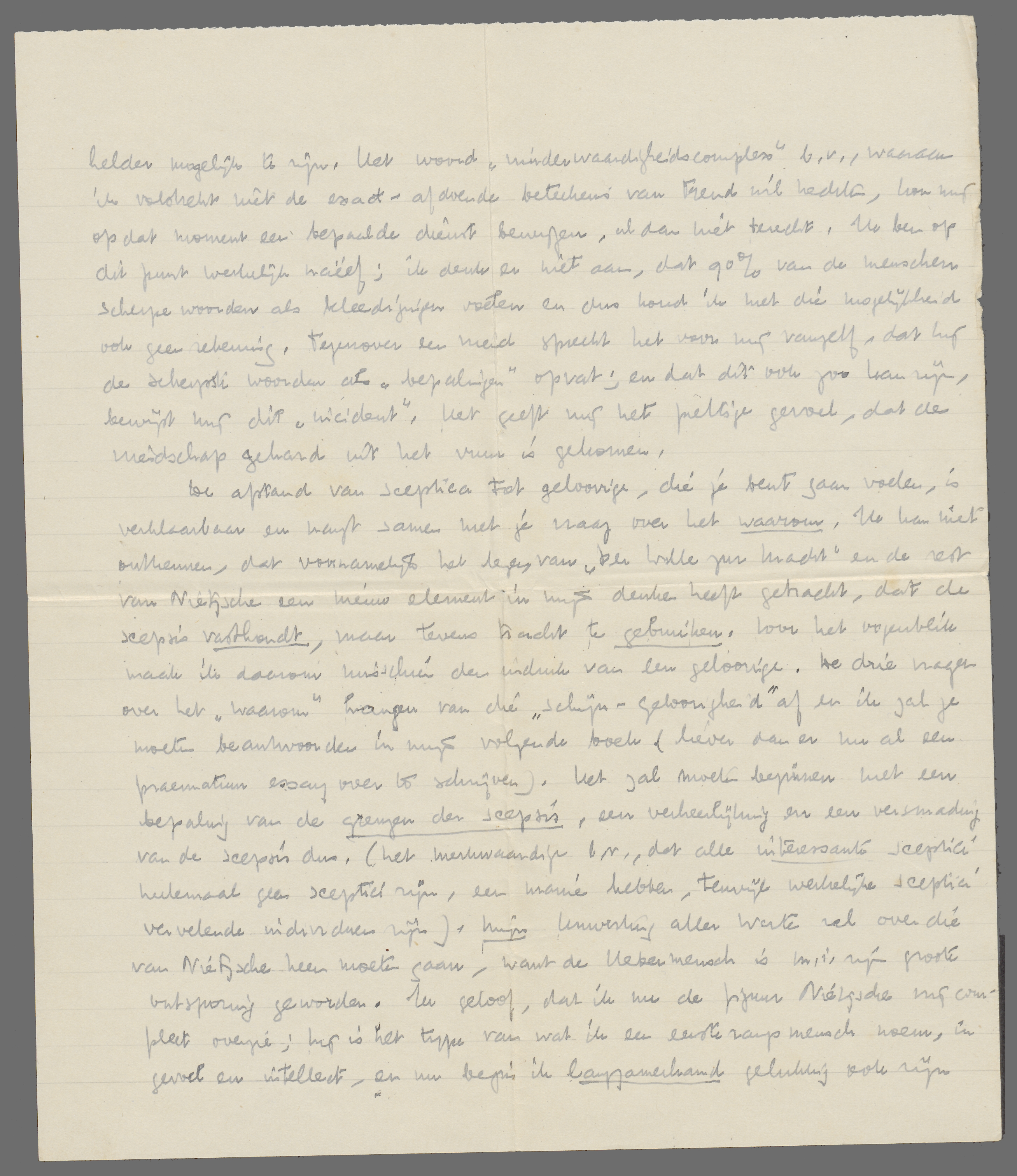 De afstand van sceptica tot geloovige, die je bent gaan voelen, is verklaarbaar en hangt samen met je vraag over het waarom. Ik kan niet ontkennen, dat voornamelijk het lezen van Der Wille zur macht en de rest van Nietzsche een nieuw element in mijn denken heeft gebracht, dat de scepsis vasthoudt, maar tevens tracht te gebruiken. Voor het oogenblik maak ik daarom misschien den indruk van een geloovige. De drie vragen over het ‘waarom’ hangen van die ‘schijn-geloovigheid’ af en ik zal ze moeten beantwoorden in mijn volgende boek (liever dan er nu al een praematuur essay over te schrijven). Het zal moeten beginnen met een bespreking van de grenzen der scepsis, een verheerlijking en een versmading van de scepsis dus. (het merkwaardige b.v., dat alle interessante sceptici heelemaal geen sceptici zijn, een manie hebben, terwijl werkelijke sceptici vervelende individuen zijn). Mijn Umwertung aller Werte zal over die van Nietzsche heen moeten gaan, want de Uebermensch is m.i. zijn groote ontsporing geworden. Ik geloof, dat ik nu de figuur Nietzsche vrij compleet overzie; hij is het type van wat ik een eersterangs mensch noem, in gevoel en intellect, en nu begin ik langzamerhand gelukkig ook zijn zwakheden te ontdekken (psychologie van de vrouw b.v., Uebermensch e.a.). Maar hij maakt mij steeds weer duidelijk, wat eigenlijk de zin van schrijven is, en hoe duidelijk de tweede rang zich van de eerste afteekent. - Heb dus nog wat geduld met het ‘waarom’! -