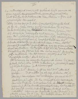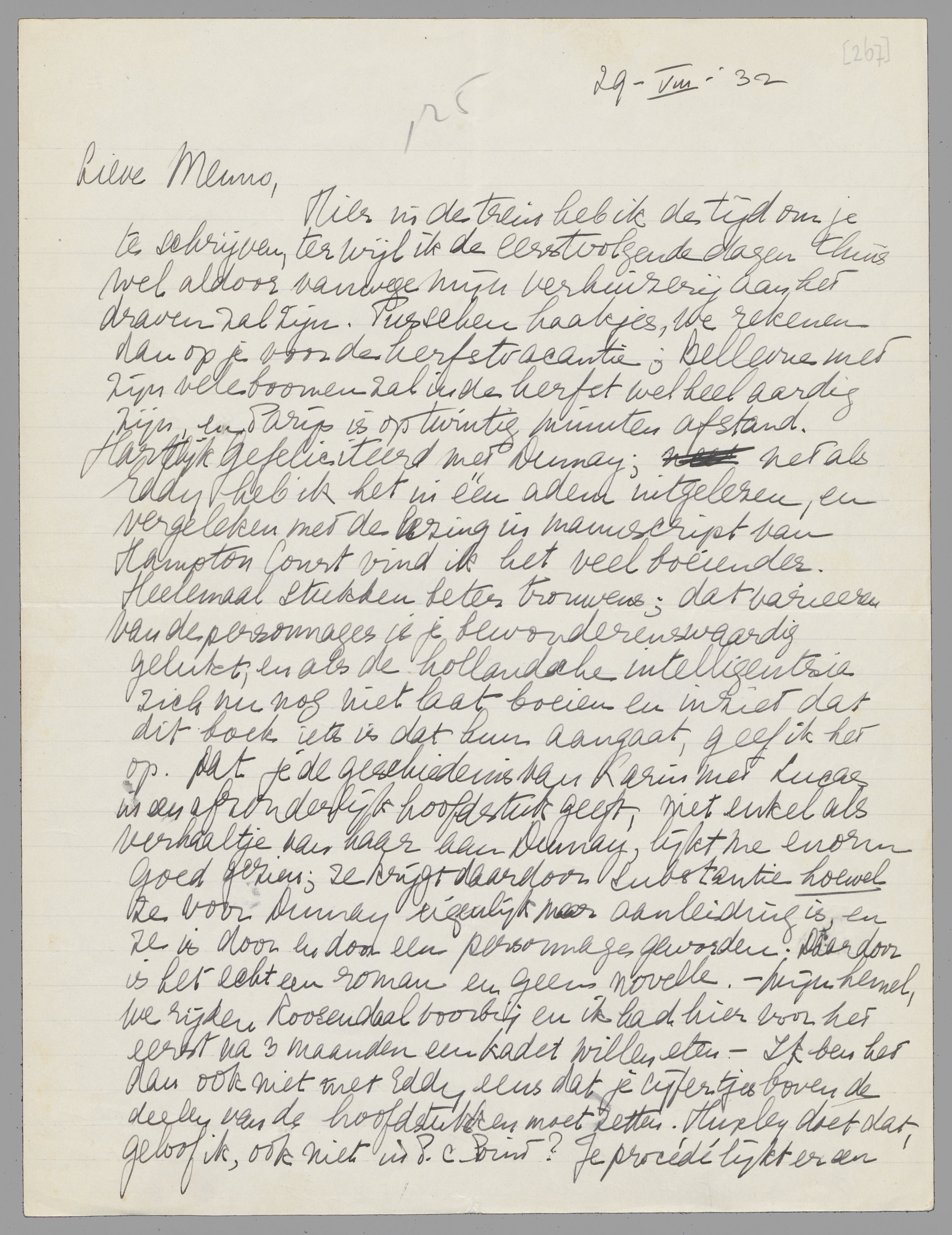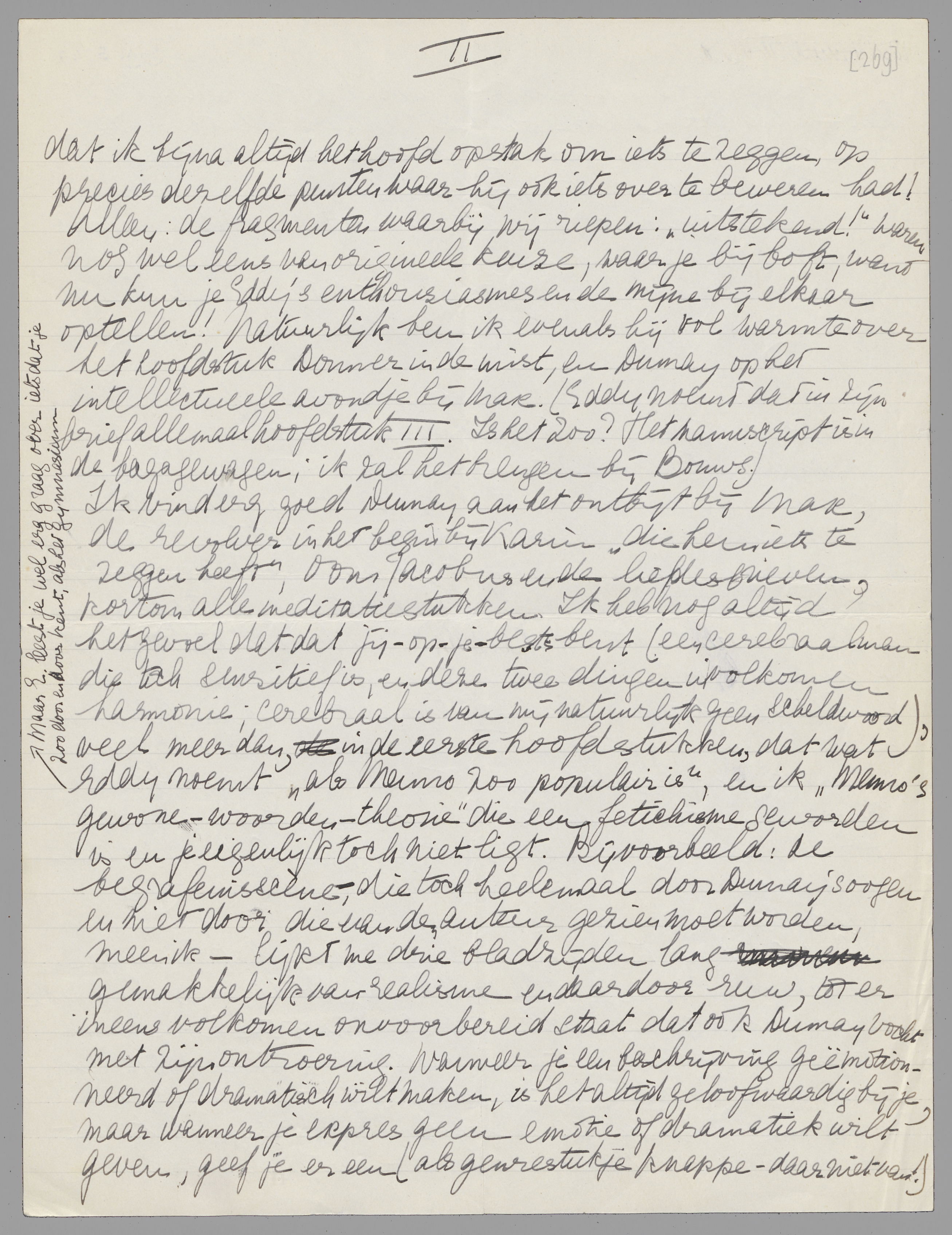 Ik zei daarnet ‘hollandsche intelligentsia’ omdat ik dit boek van je even typisch voor de hollandsche intelligentie vind als P.c.P voor de engelsche. Met Hampton Court was dat minder het geval, omdat je daar zoo in de eerste plaats over probleemen schreef, die voor een ander misschien veel minder problematisch waren terwijl het nu werkelijk om een karakter gaat. Je schreef overigens in een brief dat er zooveel zelfsatire in te vinden was, maar Eddy en ik vinden beiden dat het met de satire zoo'n vaart niet loopt, want dat Dumay een sympathieke figuur is. Andreas was veel meer hollandsch student in de bepèrkende zin van ‘hollandsch’.
