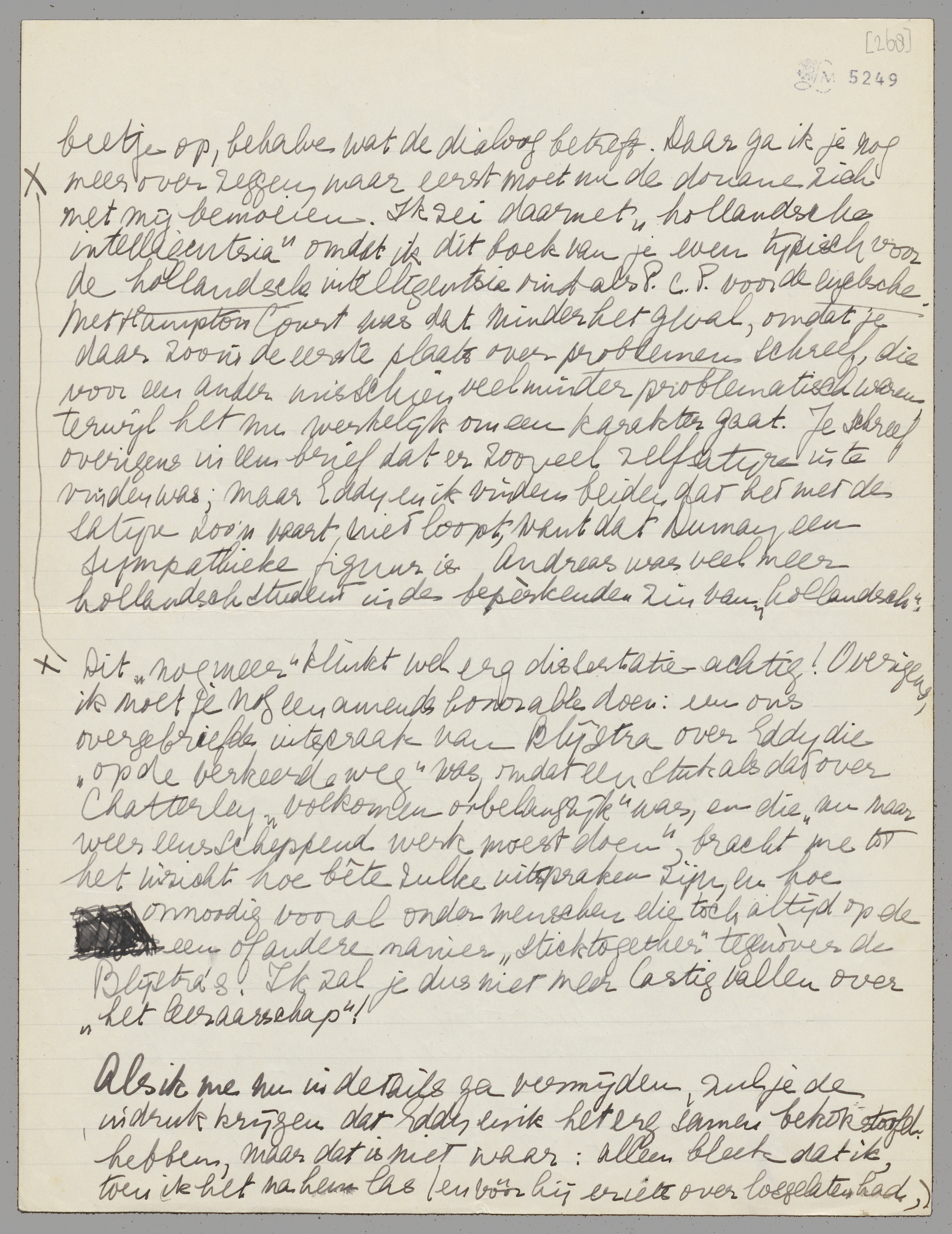 Dit ‘nog meer’ klinkt wel erg dissertatie-achtig! Overigens, ik moet je nog een amende honorable doen: een ons overgebriefde uitspraak van Blijstra over Eddy die ‘op de verkeerde weg’ was, omdat een stuk als dat over Chatterley ‘volkomen onbelangrijk’ was, en die ‘nu maar weer eens scheppend werk moest doen’, bracht me tot het inzicht hoe bête zulke uitspraken zijn, en hoe onnoodig vooral onder menschen die toch altijd op de een of andere manier ‘stick together’ tegenover de Blijstra's. Ik zal je dus niet meer lastig vallen over ‘het leraarschap’!