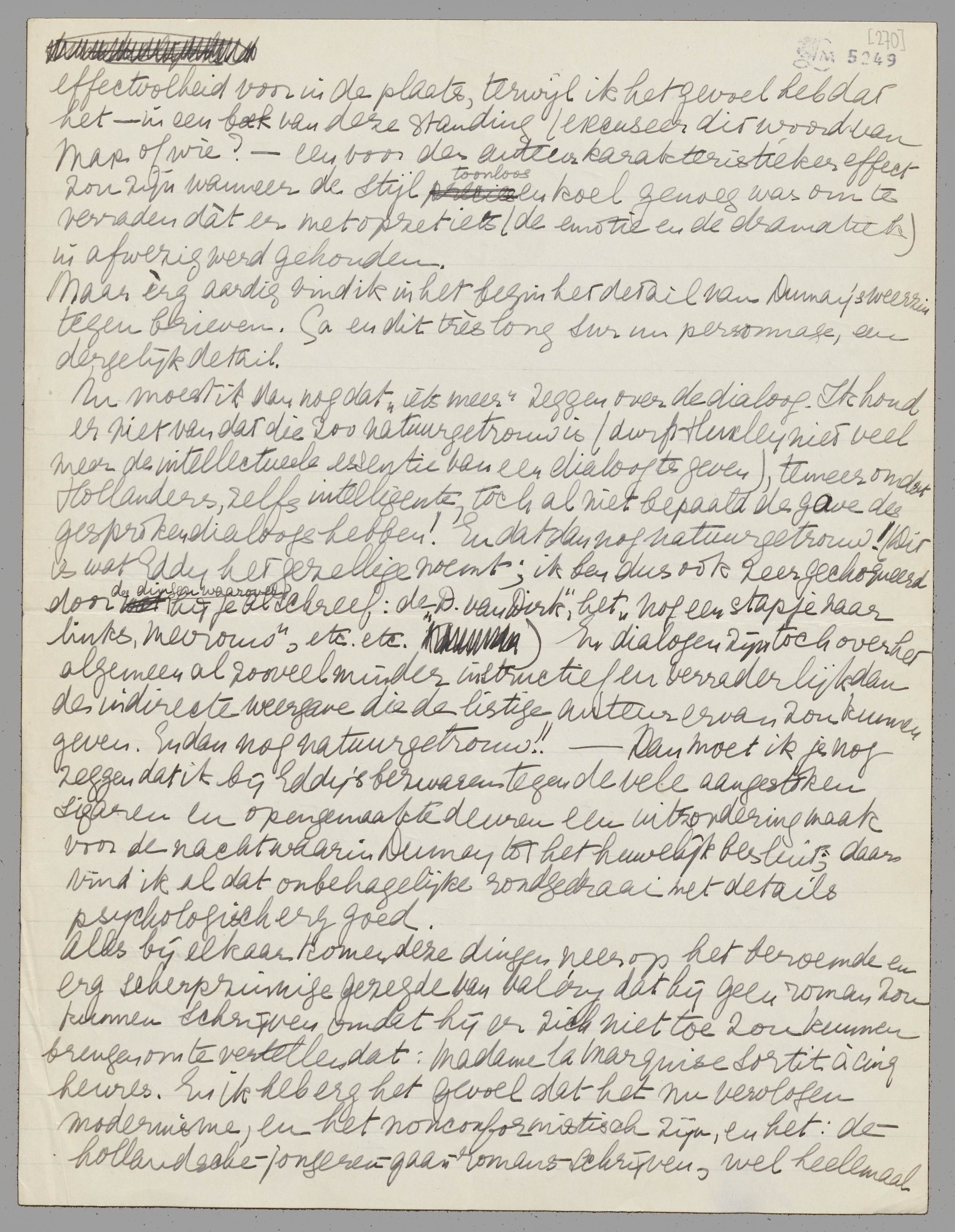 Nu moet ik dan nog dat ‘iets meer’ zeggen over de dialoog. Ik houd er niet van dat die zoo natuurgetrouw is (durft Huxley niet veel meer de intellectueele essentie van een dialoog te geven), temeer omdat Hollanders, zelfs intelligente, toch al niet bepaald de gave des gesproken dialoogs hebben! En dat dan nog natuurgetrouw! (Dit is wat Eddy het gezellige noemt; ik ben dus ook zeer gechoqueerd door de dingen waarover hij je al schreef: de ‘D. van Dirk’, het ‘nog een stapje naar links, mevrouw’, etc. etc.) En dialogen zijn toch over het algemeen al zooveel minder instructief en verraderlijk dan de indirecte weergave die de listige auteur ervan zou kunnen geven. En dan nog natuurgetrouw!! - Dan moet ik je nog zeggen dat ik bij Eddy's bezwaren tegen de vele aangestoken sigaren en opengemaakte deuren een uitzondering maak voor de nacht waarin Dumay tot het huwelijk besluit; daar vind ik al dat onbehagelijke rondgedraai met details psychologisch erg goed.