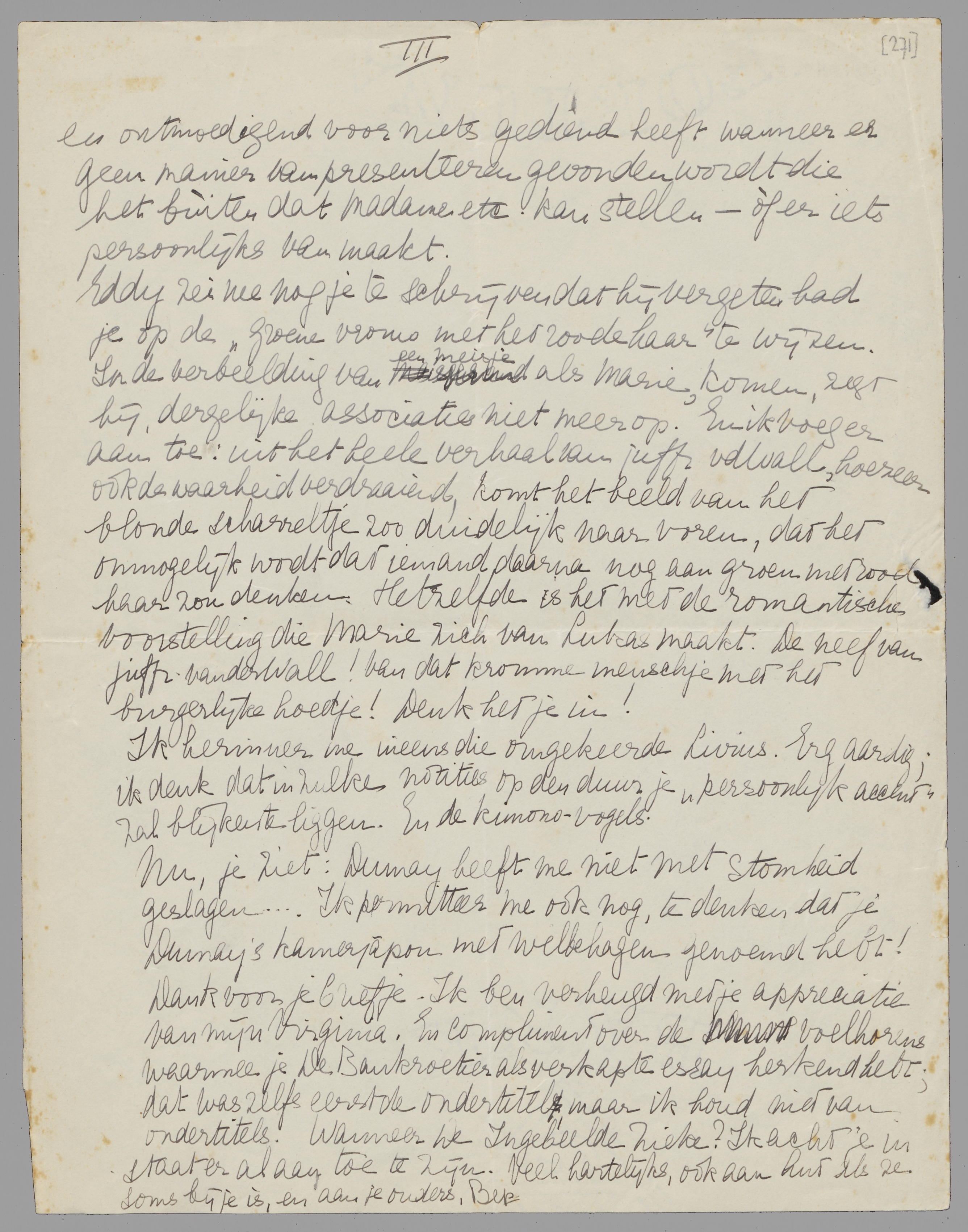 Eddy zei me nog je te schrijven dat hij vergeten had je op de ‘groene vrouw met het roode haar’ te wijzen. In de verbeelding van een meisje als Marie, komen, zegt hij, dergelijke associaties niet meer op. En ik voeg er aan toe: uit het heele verhaal van juffr. vdWall, hoezeer ook de waarheid verdraaiend, komt het beeld van het blonde scharreltje zoo duidelijk naar voren, dat het onmogelijk wordt dat iemand daarna nog aan groen met rood haar zou denken. Hetzelfde is het met de romantische voorstelling die Marie zich van Lucas maakt. De neef van juffr. vanderWall! Van dat kromme menschje met dat burgerlijke hoedje! Denk het je in!