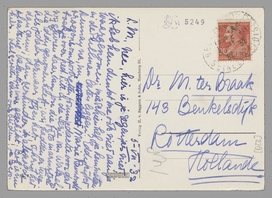 Nee, hier is je regenjas niet; ik heb hem dunkt me ook niet aan je waargenomen: misschien heb je hem meteen in de Pullman laten liggen? Eddy kijkt Dumay na, nu. Marie Ramondt vroeg ons om portretten forumredactie voor dat boekje over Ned. Litt. in de serie van Walzel. Wij sturen haar van jou die foto in armstoel die Eddy genomen heeft; wij hadden er twee. Als je daar bezwaar tegen hebt, schrijf het dan gauw; dan verhinder ik alsnog de plaatsing. Valentijn was geschikt. Bob is nu hier. Veel groeten van ons beiden!