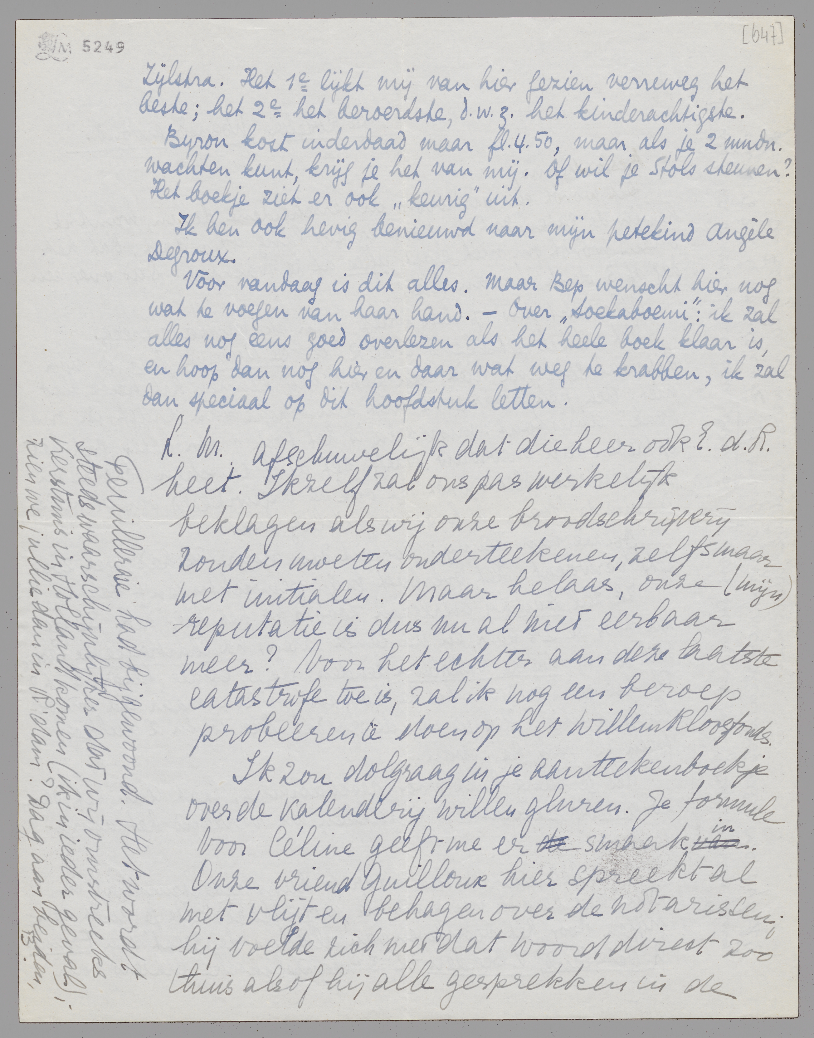 Afschuwelijk dat die heer ook E.d.R. heet. Ikzelf zal ons pas werkelijk beklagen als wij onze broodschrijverij zouden moeten onderteekenen, zelfs maar met initialen. Maar helaas, onze (mijn) reputatie is dus nu al niet eerbaar meer? Voor het echter aan deze laatste catastrofe toe is, zal ik nog een beroep probeeren te doen op het Willem Kloosfonds. Ik zou dolgraag in je aanteekenboekje over de kalenderij willen gluren. Je formule voor Céline geeft me er smaak in. Onze vriend Guilloux hier spreekt al met vlijt en behagen over de notarissen; hij voelde zich met dat woord direct zoo thuis alsof hij alle gesprekken in de Feuilleraie had bijgewoond. Het wordt steeds waarschijnlijker dat wij omstreeks Kerstmis in Holland komen (ik in ieder geval); zien we jullie dan in R'dam? Dag aan beiden.