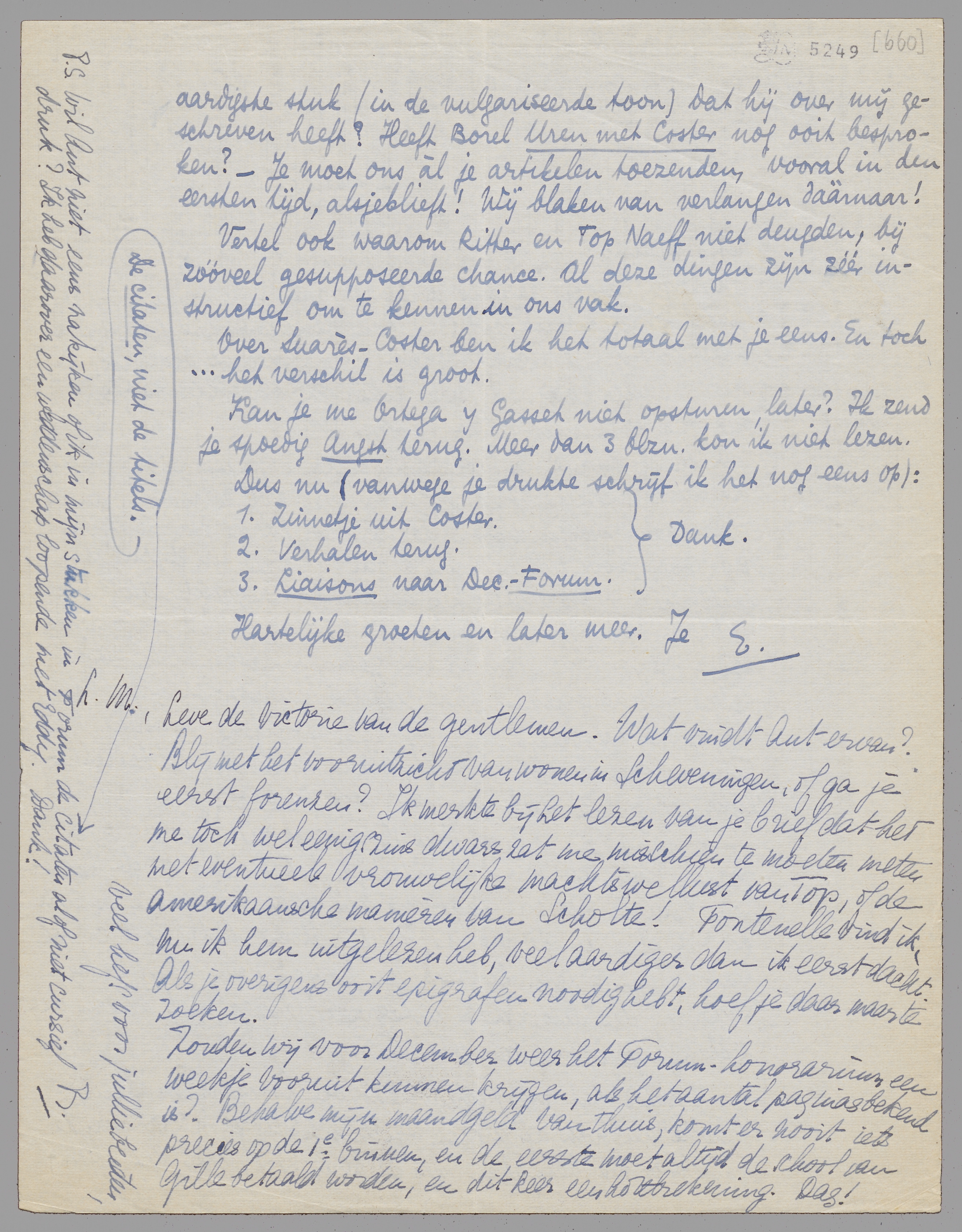 Leve de victorie van de gentlemen. Wat vindt Ant ervan? Blij met het vooruitzicht van wonen in Scheveningen, of ga je eerst forenzen? Ik merkte bij het lezen van je brief dat het me toch wel eenigszins dwars zat me misschien te moeten meten met eventueele vrouwelijke machtswellust van Top, of de Amerikaansche manieren van Scholte! Fontenelle vind ik, nu ik hem uitgelezen heb, veel aardiger dan ik eerst dacht. Als je overigens ooit epigrafen noodig hebt, hoef je daar maar te zoeken.