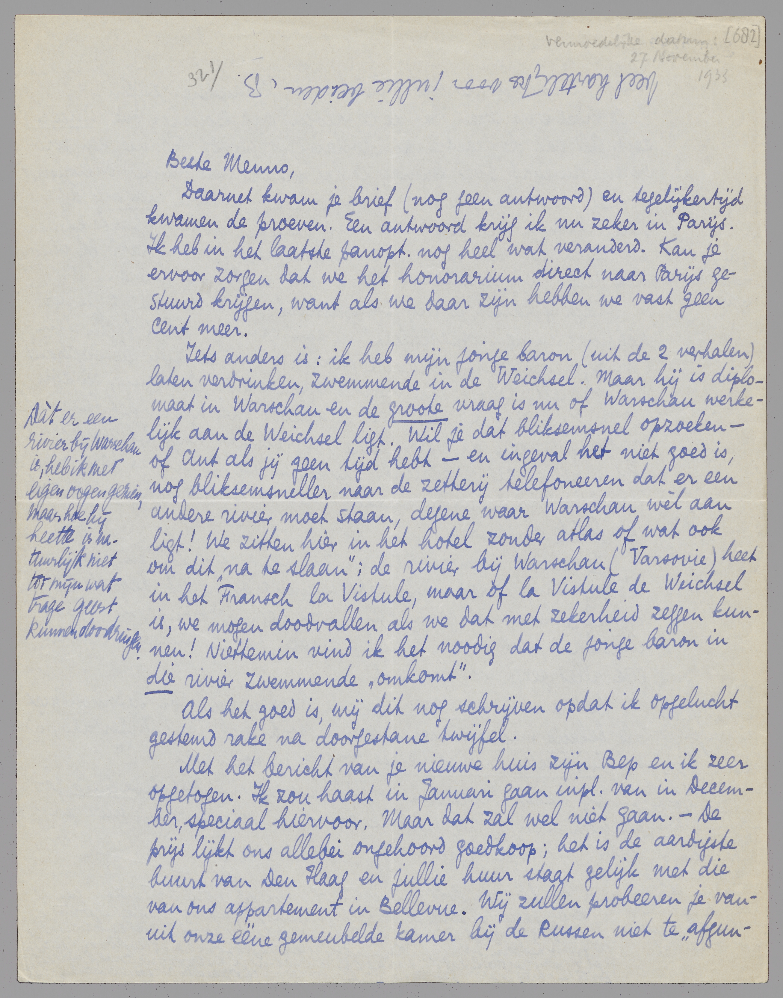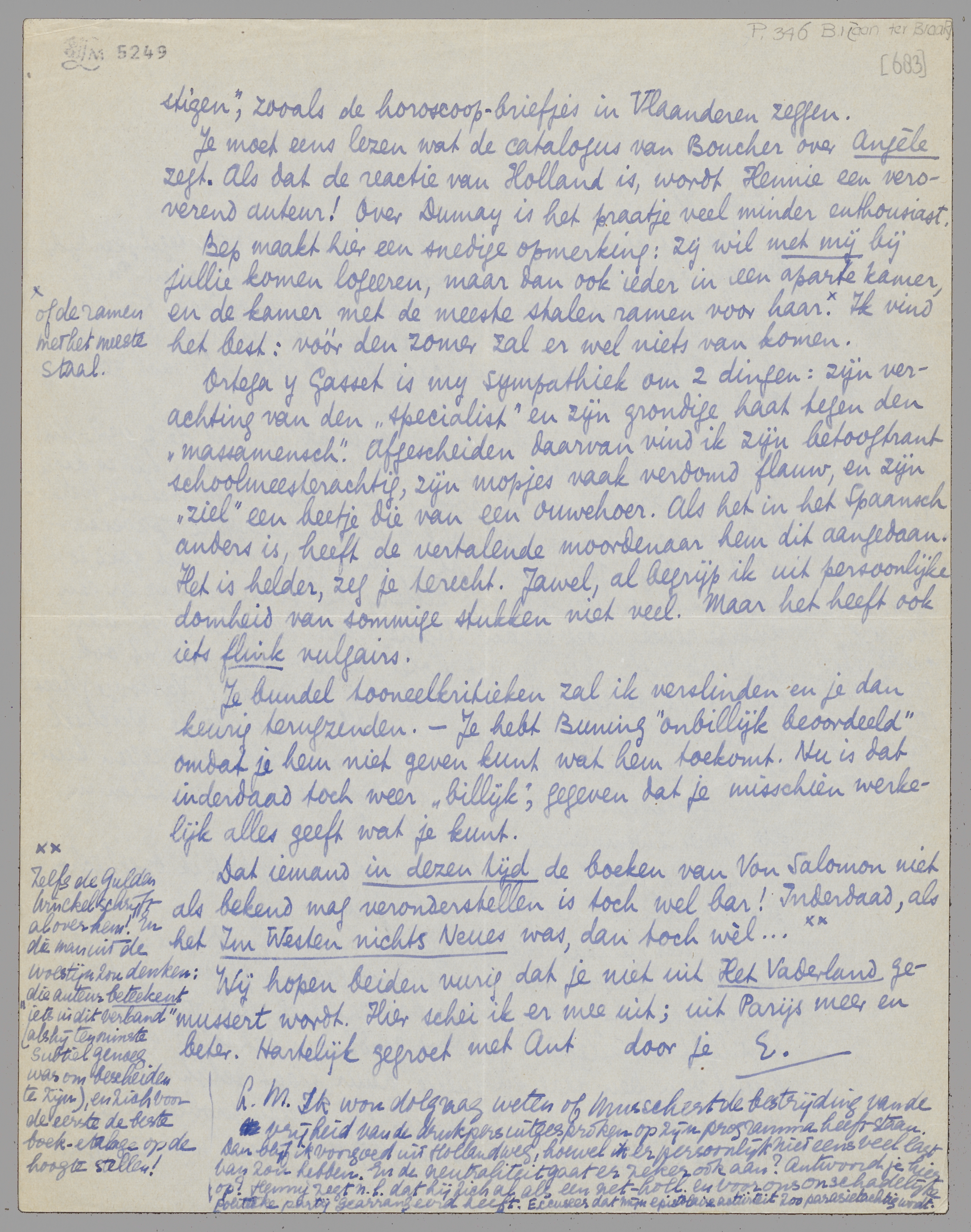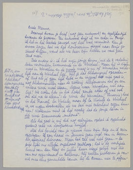 Ik wou dolgraag weten of Musschert de bestrijding van de vrijheid van de drukpers uitgesproken op zijn programma heeft staan. Dan blijf ik voorgoed uit Holland weg, hoewel ik er persoonlijk niet eens veel last van zou hebben. En de neutraliteit gaat er zeker ook aan? Antwoord je hier op? Henny zegt n.l. dat hij zich al als een net-holl. en voor ons onschadelijke politieke partij gearrangeerd heeft. Excuseer dat mijn epistolaire activiteit zoo parasietachtig wordt.