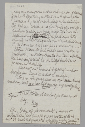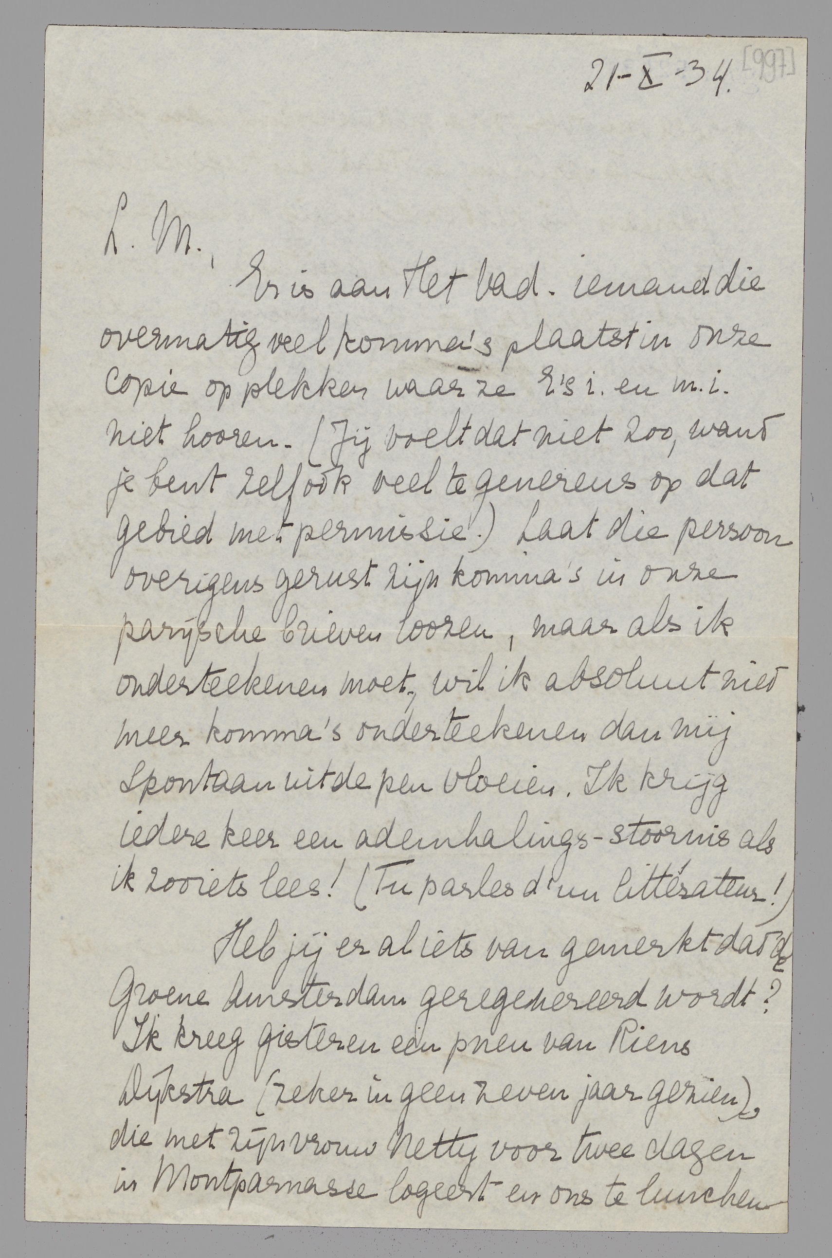 Er is aan Het Vad. iemand die overmatig veel komma's plaatst in onze copie op plekken waar ze E.'s i. en m.i. niet horen. (Jij voelt dat niet zoo, want je bent zelf ook veel te genereus op dat gebied met permissie.) Laat die persoon overigens gerust zijn komma's in onze parijsche brieven loozen, maar als ik onderteekenen moet, wil ik absoluut niet meer komma's onderteekenen dan mij spontaan uit de pen vloeien. Ik krijg iedere keer een ademhalings-stoornis als ik zoiets lees! (Tu parles d'un littérateur!)