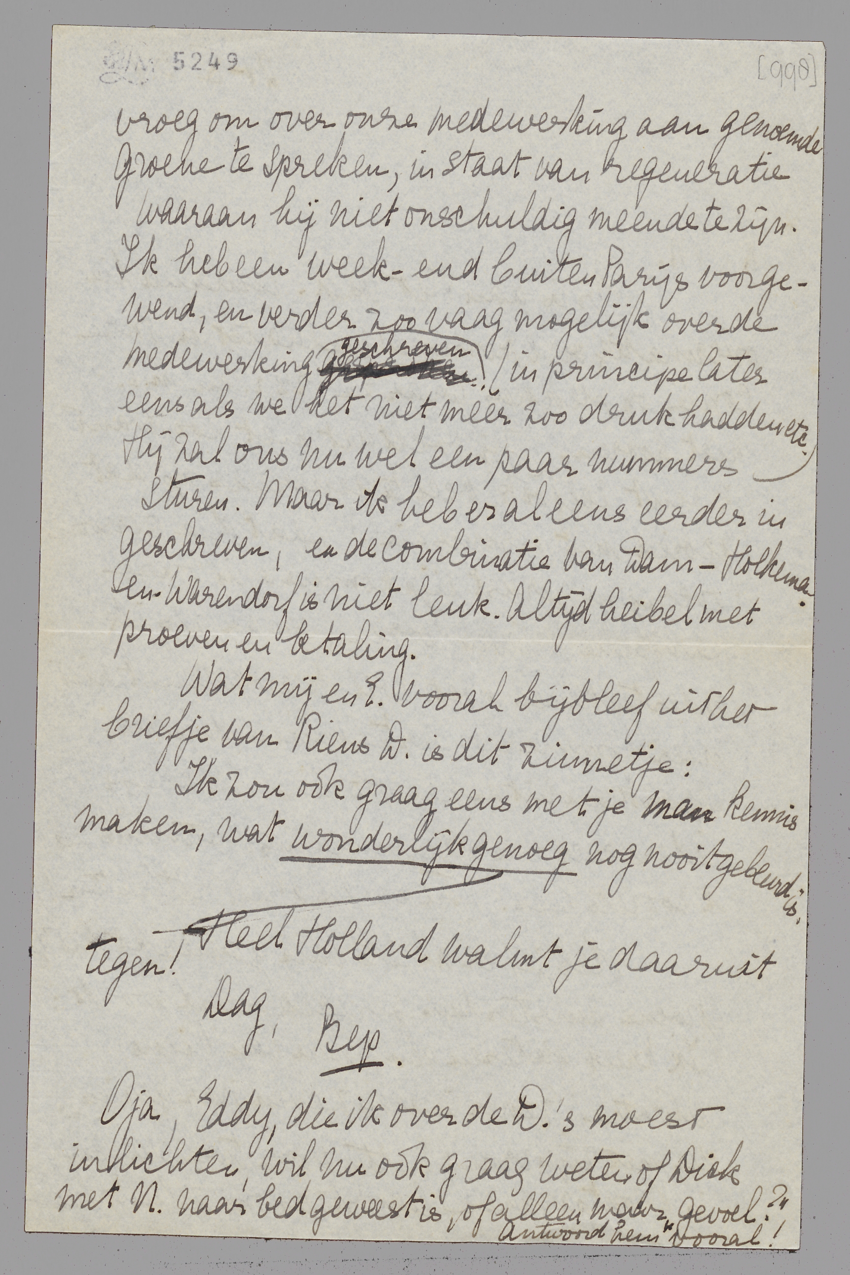 Heb jij er al iets van gemerkt dat de Groene Amsterdam geregenereerd wordt? Ik kreeg gisteren een pneu van Rients Dijkstra (zeker in geen zeven jaar gezien), die met zijn vrouw Netty voor twee dagen in Montparnasse logeert en ons te lunchen vroeg om over onze medewerking aan genoemde Groene te spreken, in staat van regeneratie waaraan hij niet onschuldig meende te zijn. Ik heb een week-end buiten Parijs voorgewend, en verder zoo vaag mogelijk over de medewerking geschreven (in principe later eens als we het niet meer zoo druk hadden etc.). Hij zal ons nu wel een paar nummers sturen. Maar ik heb er al eens eerder in geschreven, en de combinatie van Dam-Holkema en Warendorf is niet leuk. Altijd heibel met proeven en betaling.