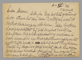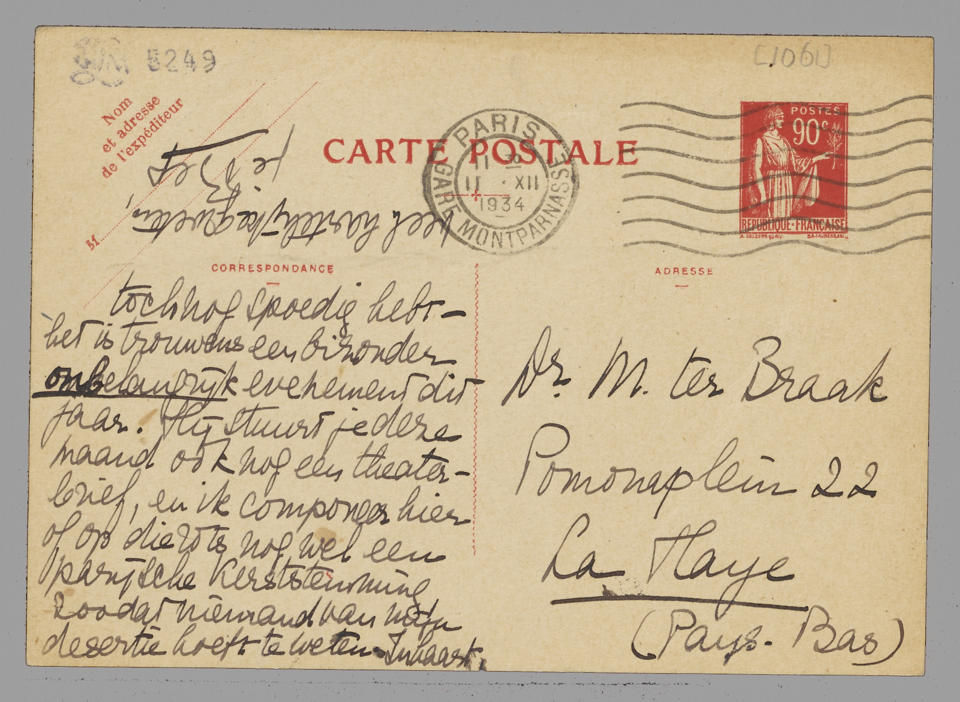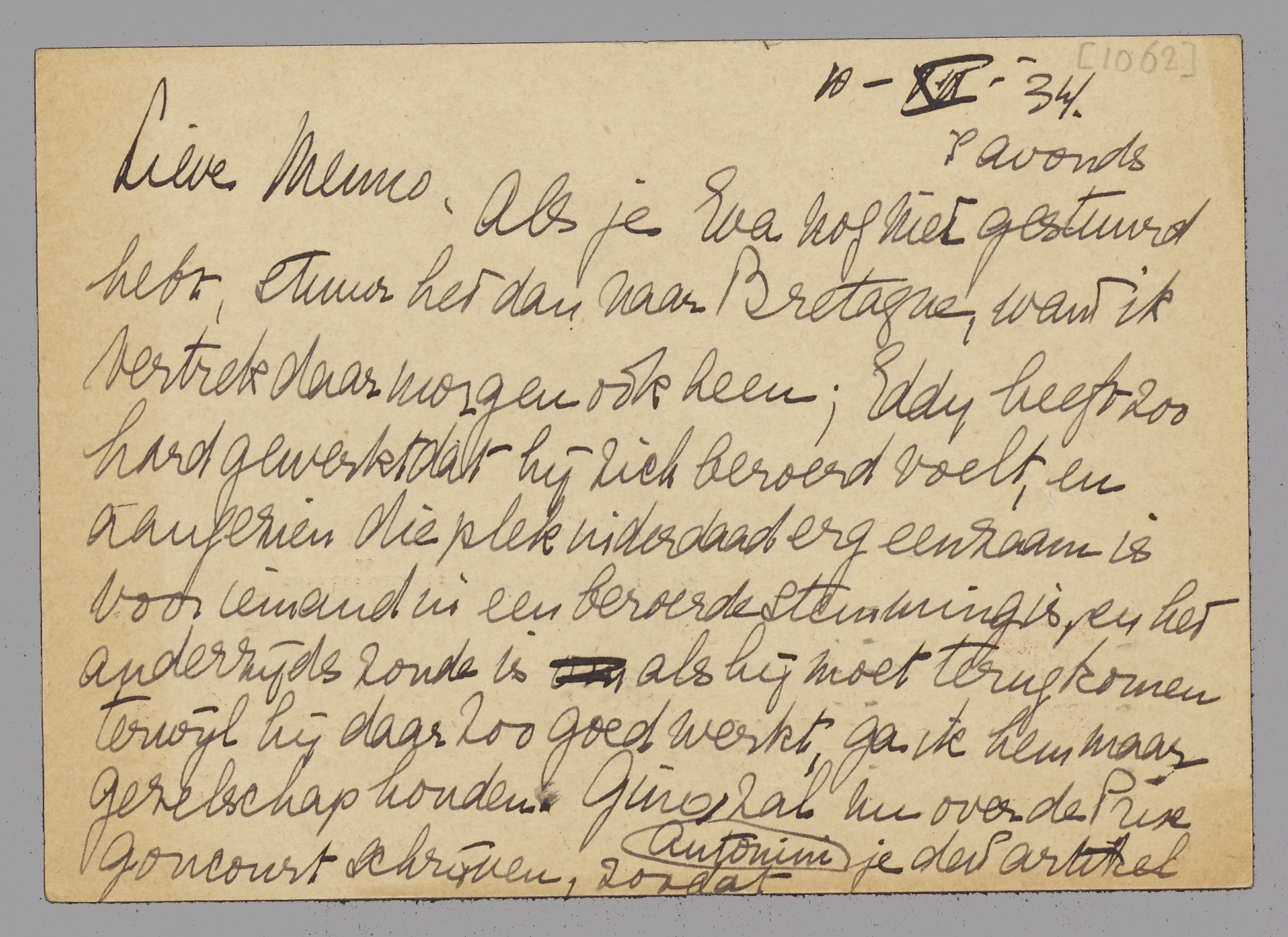 Als je Eva nog niet gestuurd hebt, stuur het dan naar Bretagne, want ik vertrek daar morgen ook heen; Eddy heeft zoo hard gewerkt dat hij zich beroerd voelt, en aangezien die plek inderdaad erg eenzaam is voor iemand in een beroerde stemming, en het anderzijds zonde is als hij moet terugkomen terwijl hij daar zoo goed werkt, ga ik hem maar gezelschap houden. Gino Antonini zal nu over de Prix Goncourt schrijven, zoodat je dat artikel toch nog spoedig hebt - het is trouwens een bizonder onbelangrijk evenement dit jaar. Hij stuurt je deze maand ook nog een theaterbrief en ik componeer hier of op die rots nog wel een parijsche kerststemming, zoodat niemand van mijn desertie hoeft te weten.