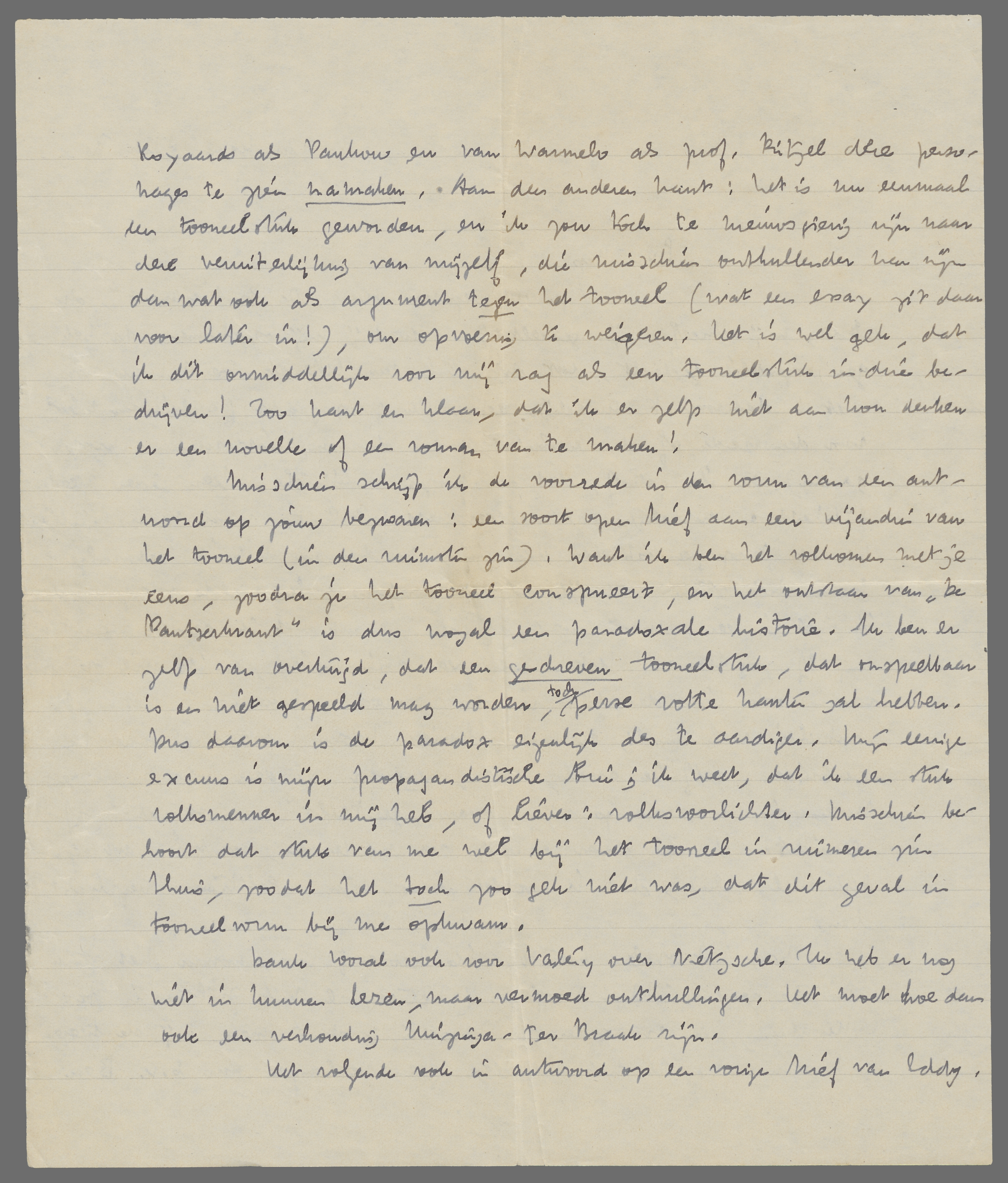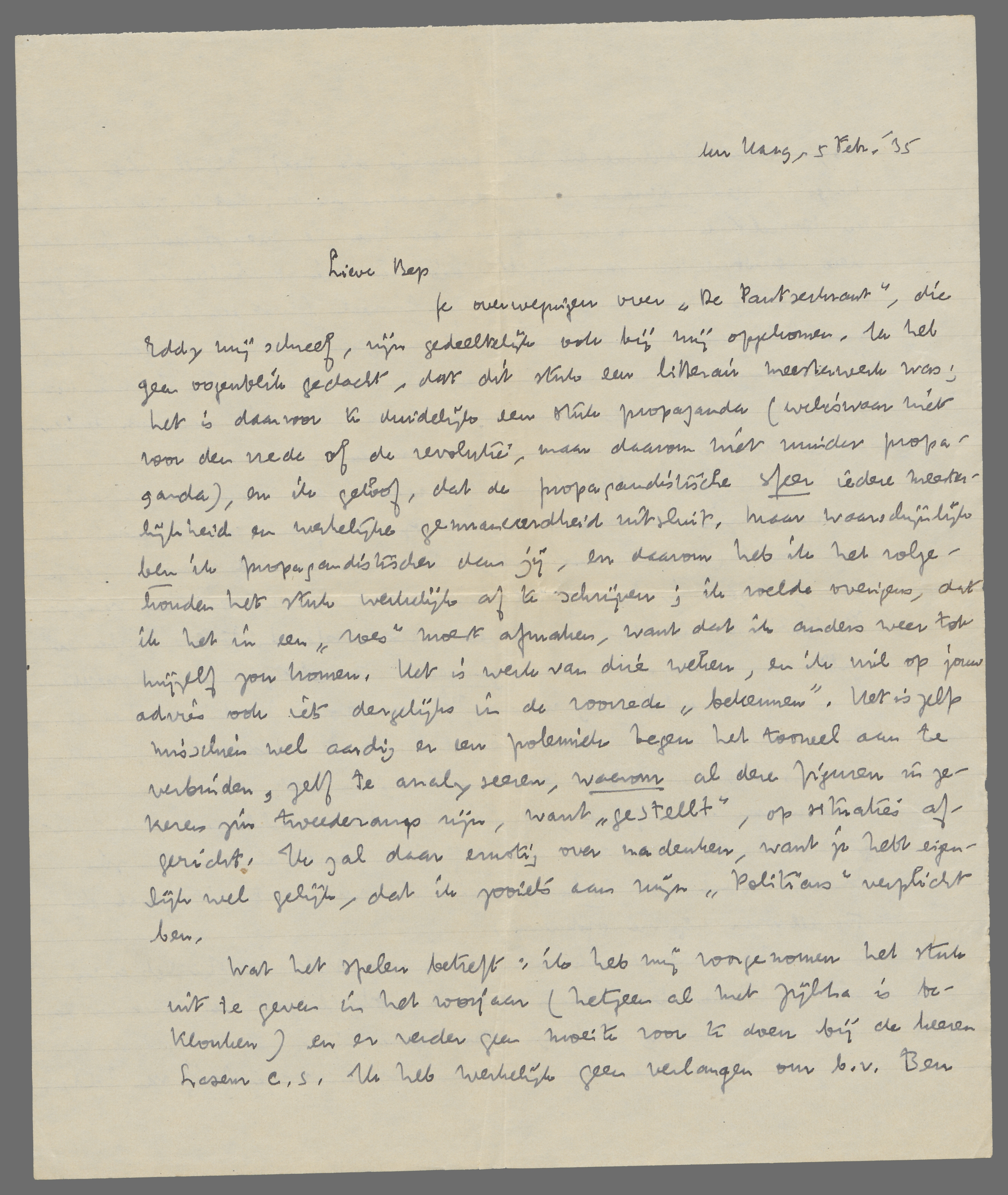 Je overwegingen over De Pantserkrant, die Eddy mij schreef, zijn gedeeltelijk ook bij mij opgekomen. Ik heb geen oogenblik gedacht, dat dit stuk een litterair meesterwerk was; het is daarvoor te duidelijk een stuk propaganda (weliswaar niet voor den vrede of de revolutie, maar daarom niet minder propaganda), en ik geloof, dat de propagandistische sfeer iedere meesterlijkheid en werkelijke genuanceerdheid uitsluit, maar waarschijnlijk ben ik propagandistischer dan jij, en daarom heb ik het volgehouden het stuk werkelijk af te schrijven; ik voelde overigens, dat ik het in een ‘roes’ moest afmaken, want dat ik anders weer tot mijzelf zou komen. Het is werk van drie weken, en ik wil op jouw advies ook iets dergelijks in de voorrede ‘bekennen’. Het is zelfs misschien wel aardig om er een polemiek tegen het tooneel aan te verbinden, zelf te analyseeren, waarom al deze figuren in zekeren zin tweederangs zijn, want ‘gestellt’, op situaties afgericht. Ik zal daar ernstig over nadenken, want je hebt eigenlijk wel gelijk, dat ik zooiets aan mijn Politicus verplicht ben.