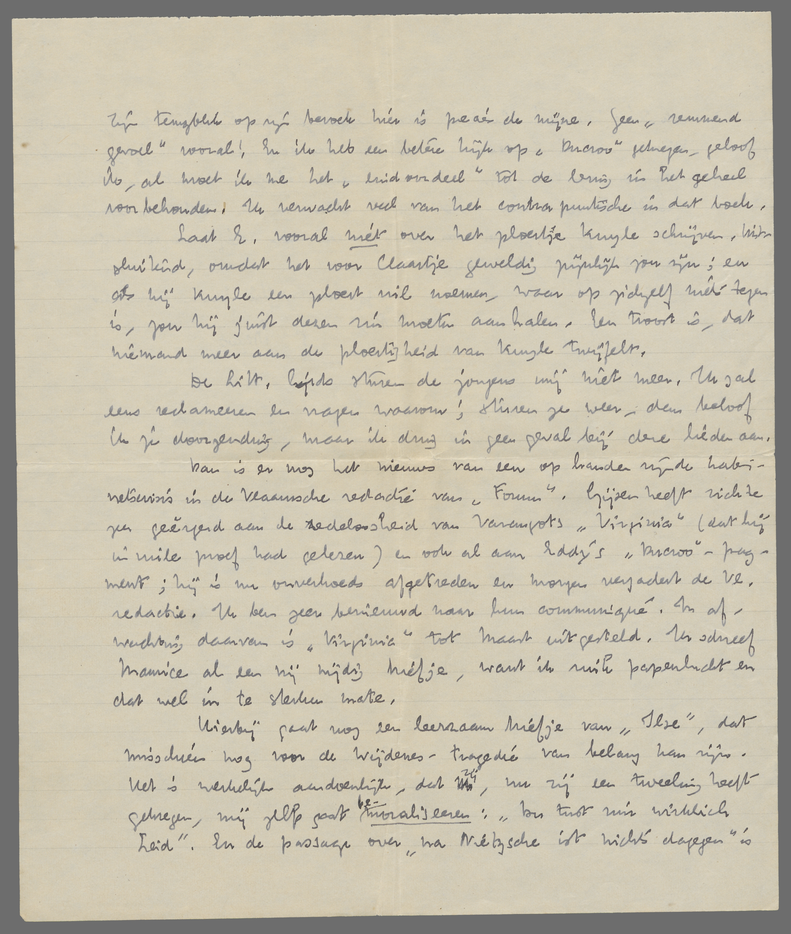 Dan is er nog het nieuws van een op handen zijnde kabinetscrisis in de Vlaamsche redactie van Forum. Gijsen heeft zich te zeer geërgerd aan de zedeloosheid van Varangots Virginia (dat hij in vuile proef had gelezen) en ook al aan Eddy's ‘Ducroo’-fragment; hij is nu onverhoeds afgetreden en morgen vergadert de Vl. redactie. Ik ben zeer benieuwd naar hun communiqué. In afwachting daarvan is Virginia tot Maart uitgesteld. Ik schreef Maurice al een vrij nijdig briefje, want ik ruik papenlucht en dat wel in te sterken mate.