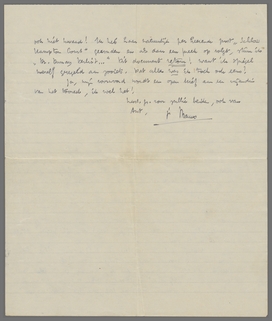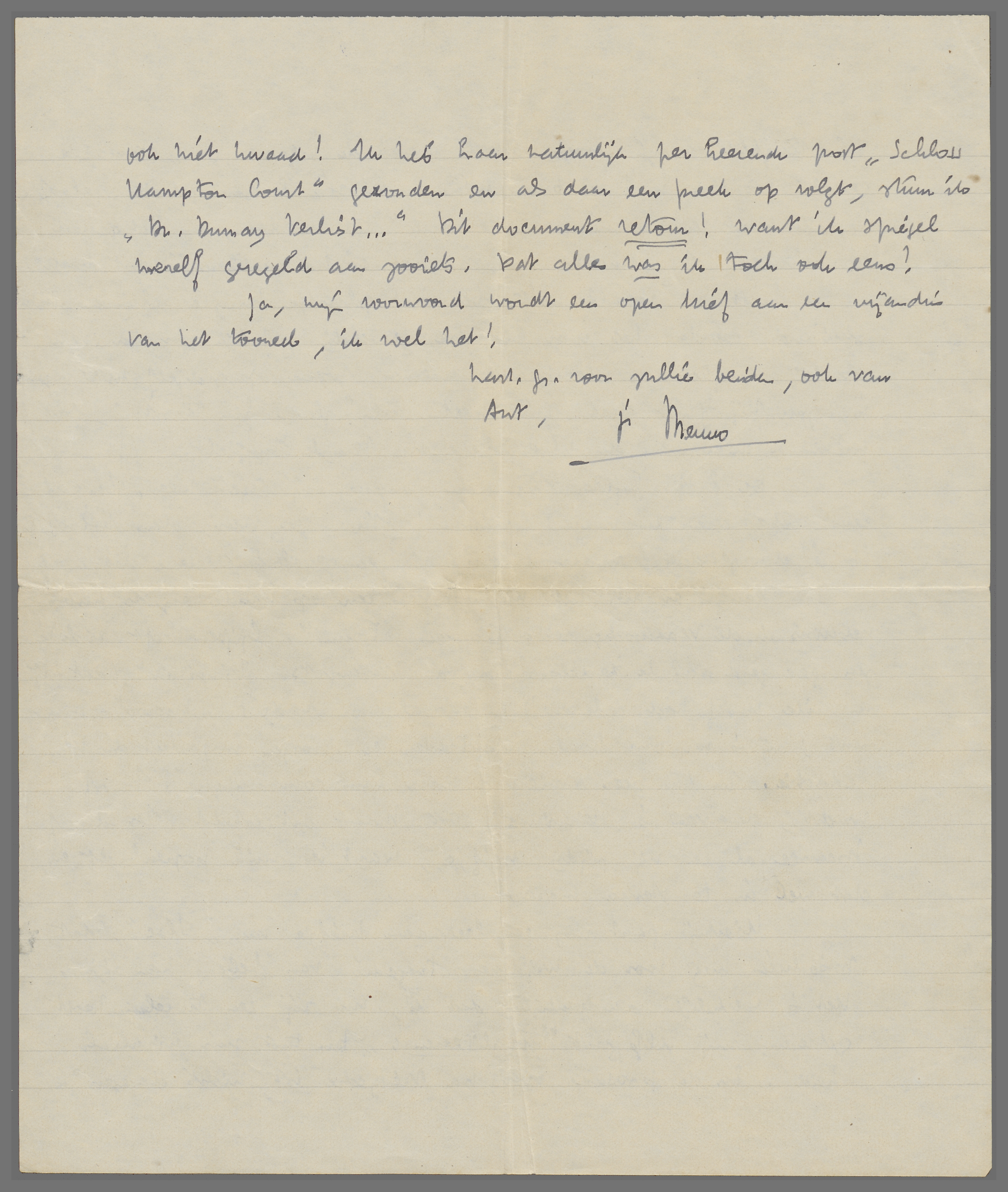 Hierbij gaat nog een leerzaam briefje van ‘Ilse’, dat misschien nog voor de Wijdenes-tragedie van belang kan zijn. Het is werkelijk aandoenlijk, dat zij, nu zij een tweeling heeft gekregen, mij zelfs gaat bemoraliseeren: ‘Du tust mir wirklich Leid.’ En de passage over ‘na Nietzsche ist nichts dagegen’ is ook niet kwaad! Ik heb haar natuurlijk per keerende post ‘Schloss Hampton Court’ gezonden en als daar een preek op volgt, stuur ik Dr. Dumay verliest... Dit document retour! want ik spiegel mezelf geregeld aan zooiets. Dat alles was ik toch ook eens?