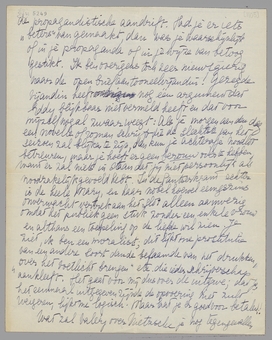 Dat stuk van Jany over die ‘toestellen’ heb ik maar in me gerefouleerd. Ik vind het uitstekend - om Jany - dat je het geplaatst hebt en ik ben het met de beste bedoelingen gaan lezen, maar het is wel de strafste lullax die ik in tijden ontmoet heb. Lang heb ik erover nagedacht wat de ‘kentrek’ eigenlijk is in dit zinnetje ‘Zijn kentrek gaat zich spannen en dan ten volle uitvieren’ - dat mij wel erg Janyaansch voorkomt, maar dat ik misschien toch te lichtvaardig vereenzelvig met den ‘geschoren gorgel’ van Persius. Hoe het zij, als je bedenkt dat dit proza misschien de sublimeering is van wat Jany's kentrek - zal ik maar zeggen - in ‘gewonere’ dagen elders placht uit te gieten, dan kan ik mij weer voorstellen dat je het dierlijke boven het intellectueele gaat verkiezen!