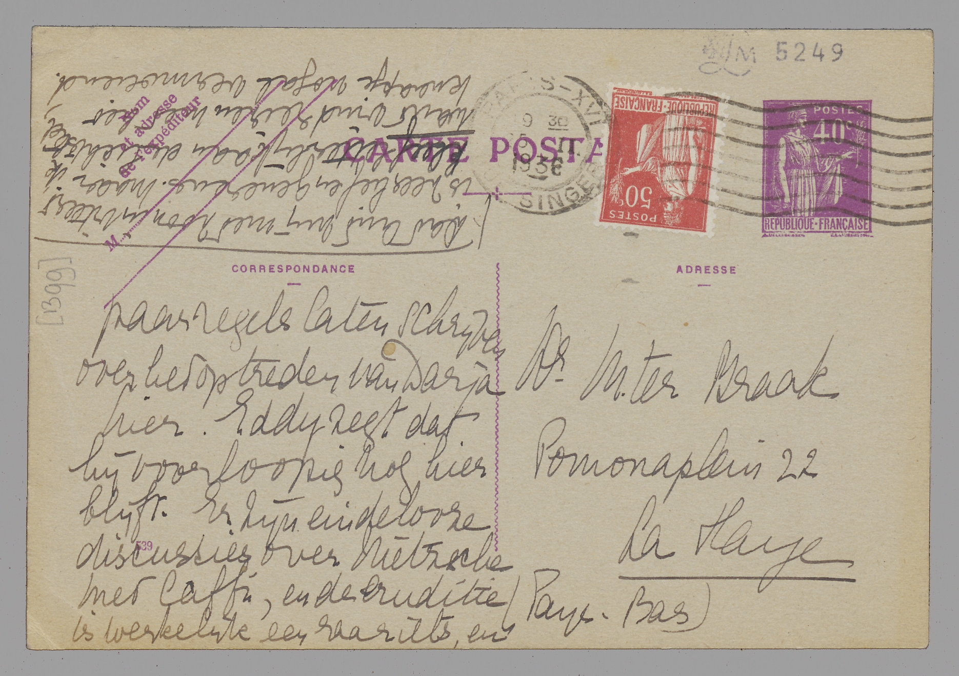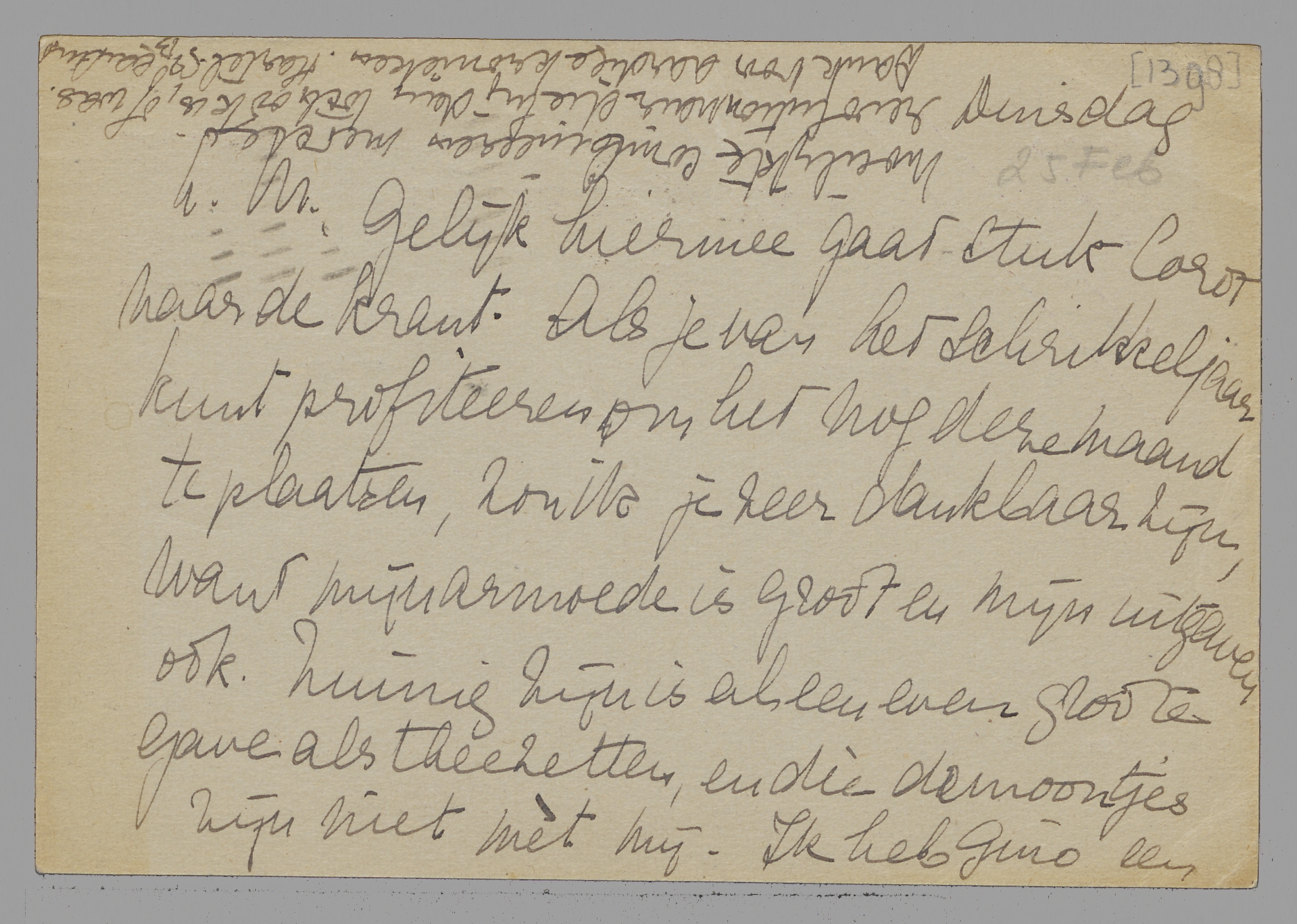 Gelijk hiermee gaat stuk Corot naar de krant. Als je van het schrikkeljaar kunt profiteeren om het nog deze maand te plaatsen, zou ik je zeer dankbaar zijn, want mijn armoede is groot en mijn uitgaven ook. Zuinig zijn is al een even groote gave als theezetten, en die demoontjes zijn niet mèt mij. Ik heb Gino een paar regels laten schrijven over het optreden van Darja hier. Eddy zegt dat hij voorloopig nog hier blijft. Er zijn eindelooze discussies over Nietzsche met Caffi, en de eruditie is werkelijk een raar iets, en moeilijk te combineeren met de revolutionnair die hij dan toch ook is, of was.
