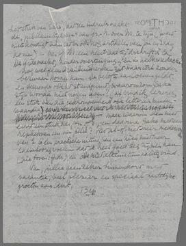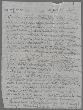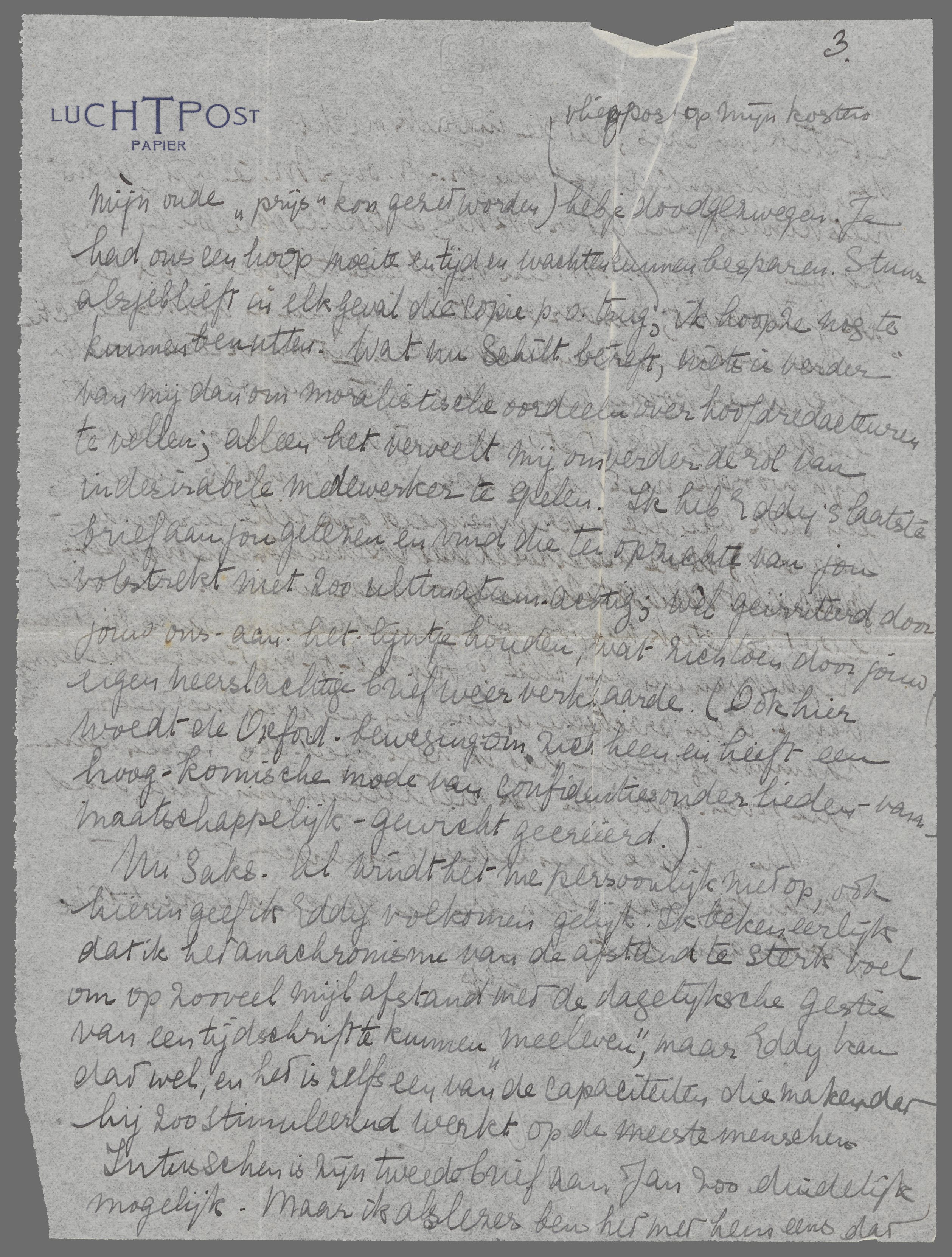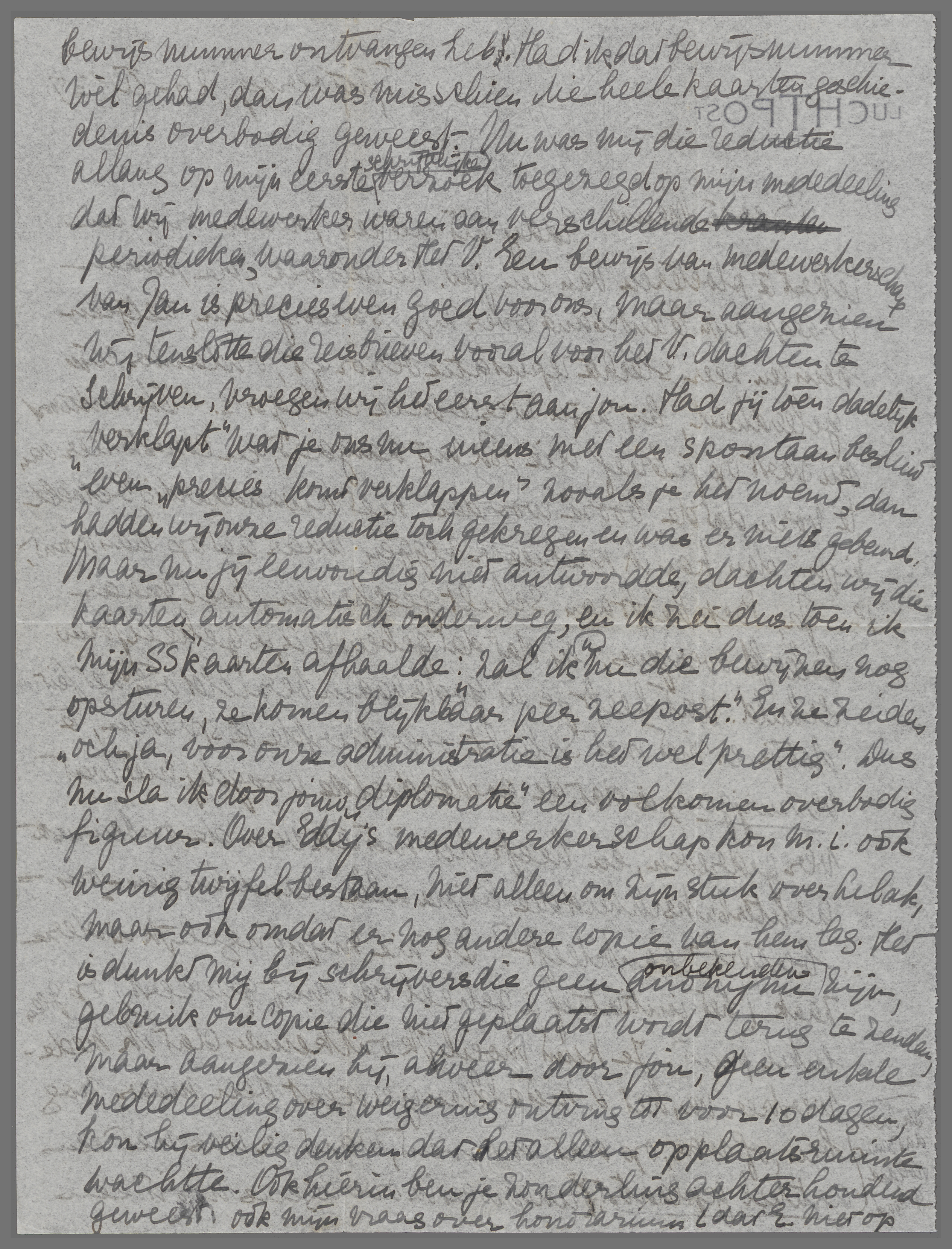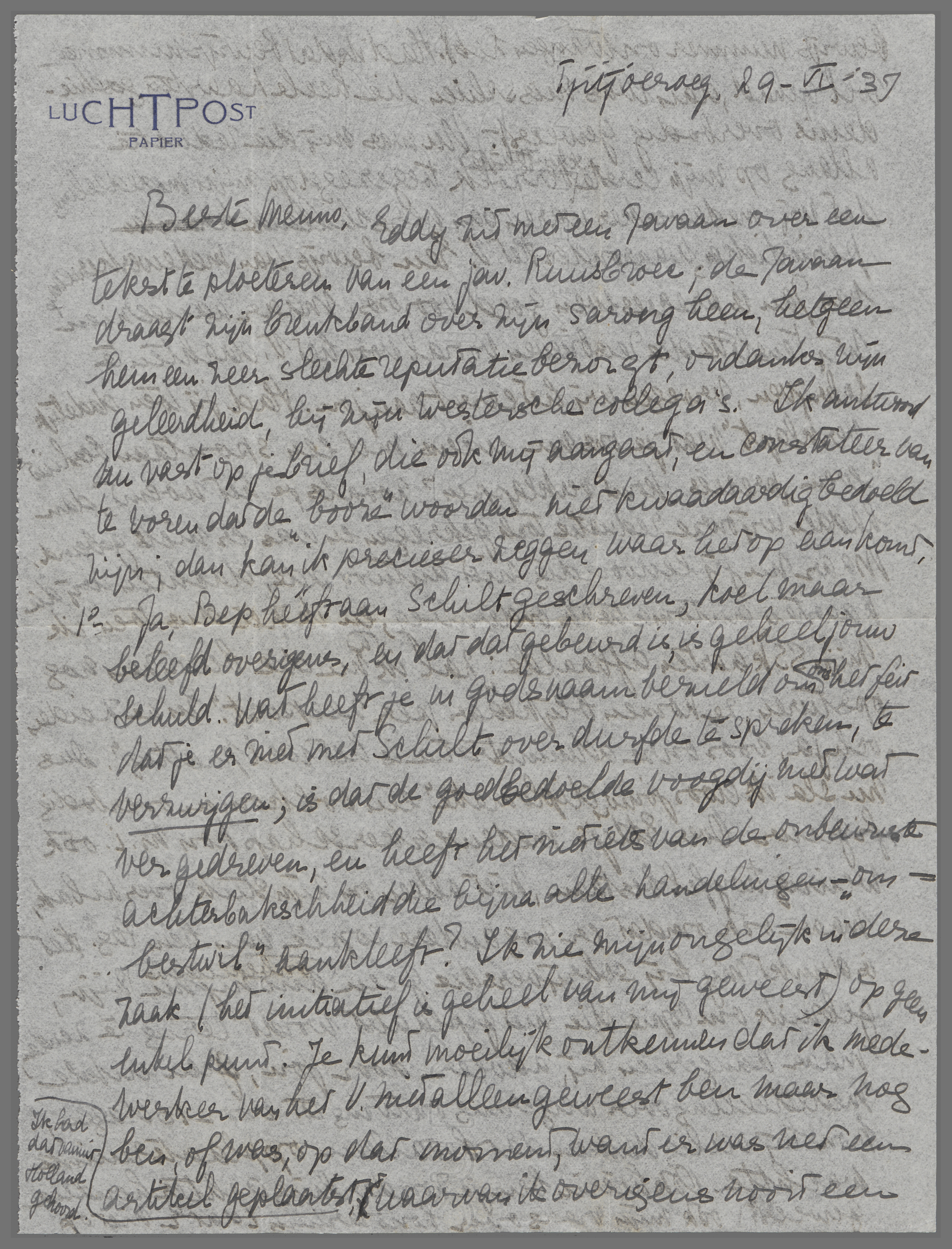 Eddy zit met een Javaan over een tekst te ploeteren van een jav. Ruusbroec; de Javaan draagt zijn breukband over zijn sarong heen, hetgeen hem een zeer slechte reputatie bezorgt, ondanks zijn geleerdheid, bij zijn westersche collega's. Ik antwoord nu vast op je brief, die ook mij aangaat, en constateer van te voren dat de ‘booze’ woorden niet kwaadaardig bedoeld zijn; dan kan ik precieser zeggen waar het op aankomt. 1) Ja, Bep hééft aan Schilt geschreven, koel maar beleefd overigens, en dat dat gebeurd is, is geheel jouw schuld. Wat heeft je in godsnaam bezield om ons het feit dat je er niet met Schilt over durfde te spreken, te verzwijgen; is dat de goedbedoelde voogdij niet wat ver gedreven, en heeft het niet iets van de onbewuste achterbakschheid die bijna alle handelingen-‘om-bestwil’ aankleeft? Ik zie mijn ongelijk in deze zaak (het initiatief is geheel van mij geweest) op geen enkel punt. Je kunt moeilijk ontkennen dat ik medewerker van het V. niet alleen geweest ben maar nog ben, of was, op dat moment, want er was net een artikel geplaatst (ik had dat vanuit Holland gehoord), waarvan ik overigens nooit een bewijsnummer ontvangen heb. Had ik dat bewijsnummer wèl gehad, dan was misschien die heele kaartengeschiedenis overbodig geweest. Nu was mij die reductie allang op mijn eerste schriftelijke verzoek toegezegd op mijn mededeeling dat wij medewerkers waren aan verschillende periodieken, waaronder Het V. Een bewijs van medewerkerschap van Jan is precies even goed voor ons, maar aangezien wij tenslotte die reisbrieven vooral voor het V. dachten te schrijven, vroegen wij het eerst aan jou. Had jij toen dadelijk ‘verklapt’ wat je ons nu ineens met een spontaan besluit even ‘precies komt verklappen’ zooals je het noemt, dan hadden wij onze reductie toch gekregen en was er niets gebeurd. Maar nu jij eenvoudig niet antwoordde, dachten wij die kaarten automatisch onderweg, en ik zei dus toen ik mijn SS kaarten afhaalde: ‘zal ik nu die bewijzen nog opsturen, ze komen blijkbaar per zeepost.’ En ze zeiden ‘och ja, voor onze administratie is het wel prettig’. Dus nu sla ik door jouw ‘diplomatie’ een volkomen overbodig figuur. Over Eddy's medewerkerschap kon m.i. ook weinig twijfel bestaan, niet alleen om zijn stuk over Lebak, maar ook omdat er nog andere copie van hem lag. Het is dunkt mij bij schrijvers die geen onbekenden anonymen zijn, gebruik om copie die niet geplaatst wordt terug te zenden, maar aangezien hij, alweer door jou, geen enkele mededeeling over weigering ontving tot voor 10 dagen, kon hij veilig denken dat het alleen op plaatsruimte wachtte. Ook hierin ben je zonderling achterhoudend geweest: ook mijn vraag over honorarium (dat E. niet op mijn oude ‘prijs’ kon gezet worden) heb je doodgezwegen. Je had ons een hoop moeite en tijd en wachten kunnen besparen. Stuur alsjeblieft in elk geval die copie p.o. terug (vliegpost op mijn kosten); ik hoop ze nog te kunnen benutten. Wat nu Schilt betreft, niets is verder van mij dan om moralistische oordeelen over hoofdredacteuren te vellen; alleen het verveelt mij om verder de rol van indesirabele medewerker te spelen. Ik heb Eddy's laatste brief aan jou gelezen en vind die ten opzichte van jou volstrekt niet zoo ultimatum-achtig; wèl geïrriteerd door jouw ons-aan-het-lijntje-houden, wat zich toen door jouw eigen neerslachtige brief weer verklaarde. (Ook hier woedt die Oxford-beweging om zich heen en heeft een hoog-komische mode van confidenties onder lieden-van-maatschappelijk-gewicht gecreëerd.)