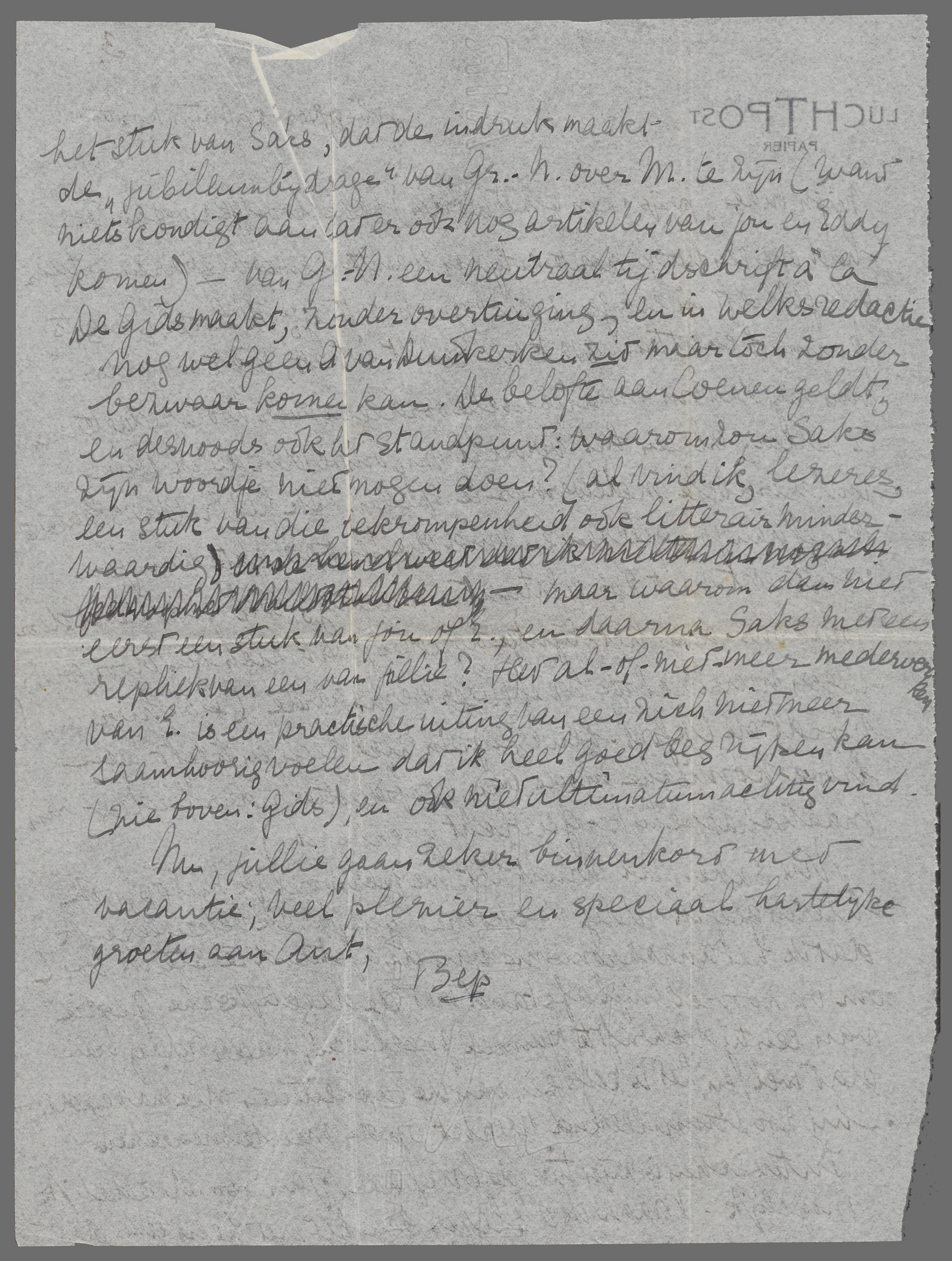 Nu Saks. Al windt het me persoonlijk niet op, ook hierin geef ik Eddy volkomen gelijk. Ik beken eerlijk dat ik het anachronisme van de afstand te sterk voel om op zooveel mijl afstand met de dagelijksche gestie van een tijdschrift te kunnen ‘meeleven’, maar Eddy kan dat wel, en het is zelfs een van de capaciteiten die maken dat hij zoo stimuleerend werkt op de meeste menschen. Intusschen is zijn tweede brief aan Jan zoo duidelijk mogelijk. Maar ik als lezer ben het met hem eens dat het stuk van Saks, dat de indruk maakt de ‘jubileumbijdrage’ van Gr. N. over M. te zijn (want niets kondigt aan dat er ook nog artikelen van jou en Eddy komen) - van G.N. een neutraal tijdschrift à la De Gids maakt, zonder overtuiging, en in welks redactie nog wel geen A. van Duinkerken zit maar toch zonder bezwaar komen kan. De belofte aan Coenen geldt, en desnoods ook het standpunt: waarom zou Saks zijn woordje niet mogen doen? (Al vind ik, lezeres, een stuk van die bekrompenheid ook litterair minderwaardig) - maar waarom dan niet eerst een stuk van jou of E., en daarna Saks met een repliek van een van jullie? Het al-of-niet-meer-medewerken van E. is een practische uiting van een zich niet meer saamhoorig voelen dat ik heel goed begrijpen kan (zie boven: Gids), en ook niet ultimatumachtig vind.