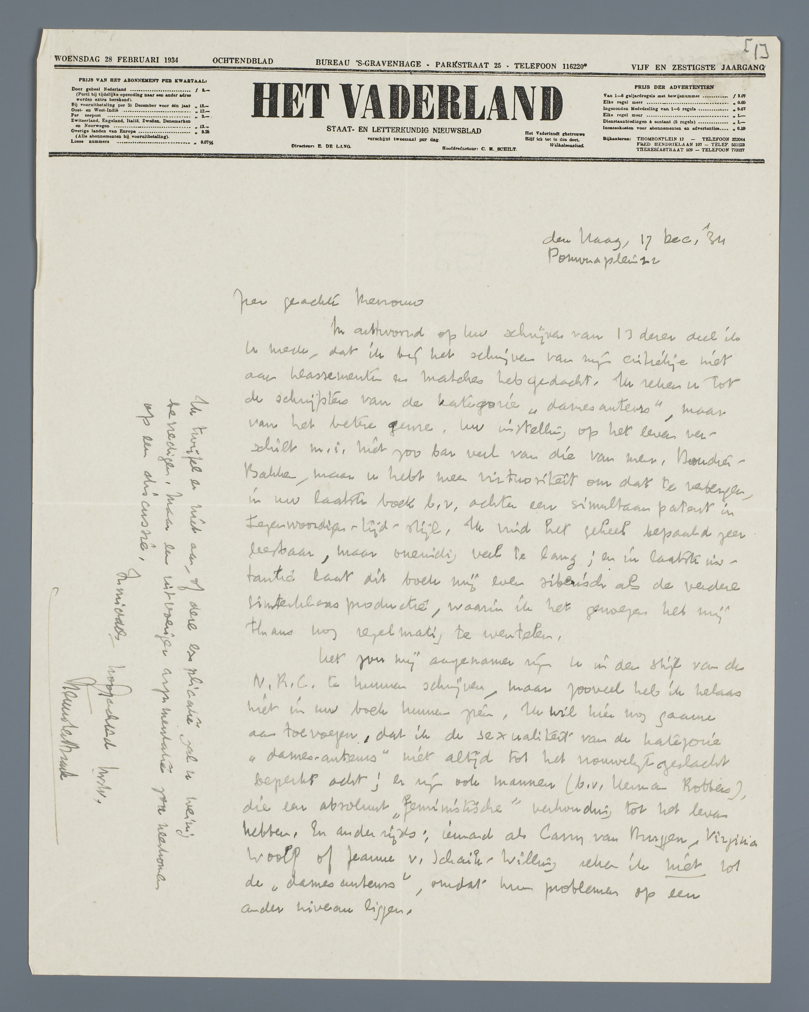 In antwoord op uw schrijven van 13 dezer deel ik u mede, dat ik bij het schrijven van mijn critiekje niet aan klassementen en matches heb gedacht. Ik reken u tot de schrijfsters van de kategorie ‘damesauteurs’, maar van het betere genre. Uw instelling op het leven verschilt m.i. niet zoo bar veel van die van mevr. Boudier-Bakker, maar u hebt meer virtuositeit om dat te verbergen, in uw laatste boek b.v. achter een simultaan patent in tegenwoordige-tijd-stijl. Ik vind het geheel bepaald zeer leesbaar, maar oneindig veel te lang; en in laatste instantie laat dit boek mij even siberisch als de verdere sinterklaasproductie, waarin ik het genoegen heb mij thans nog regelmatig te wentelen.