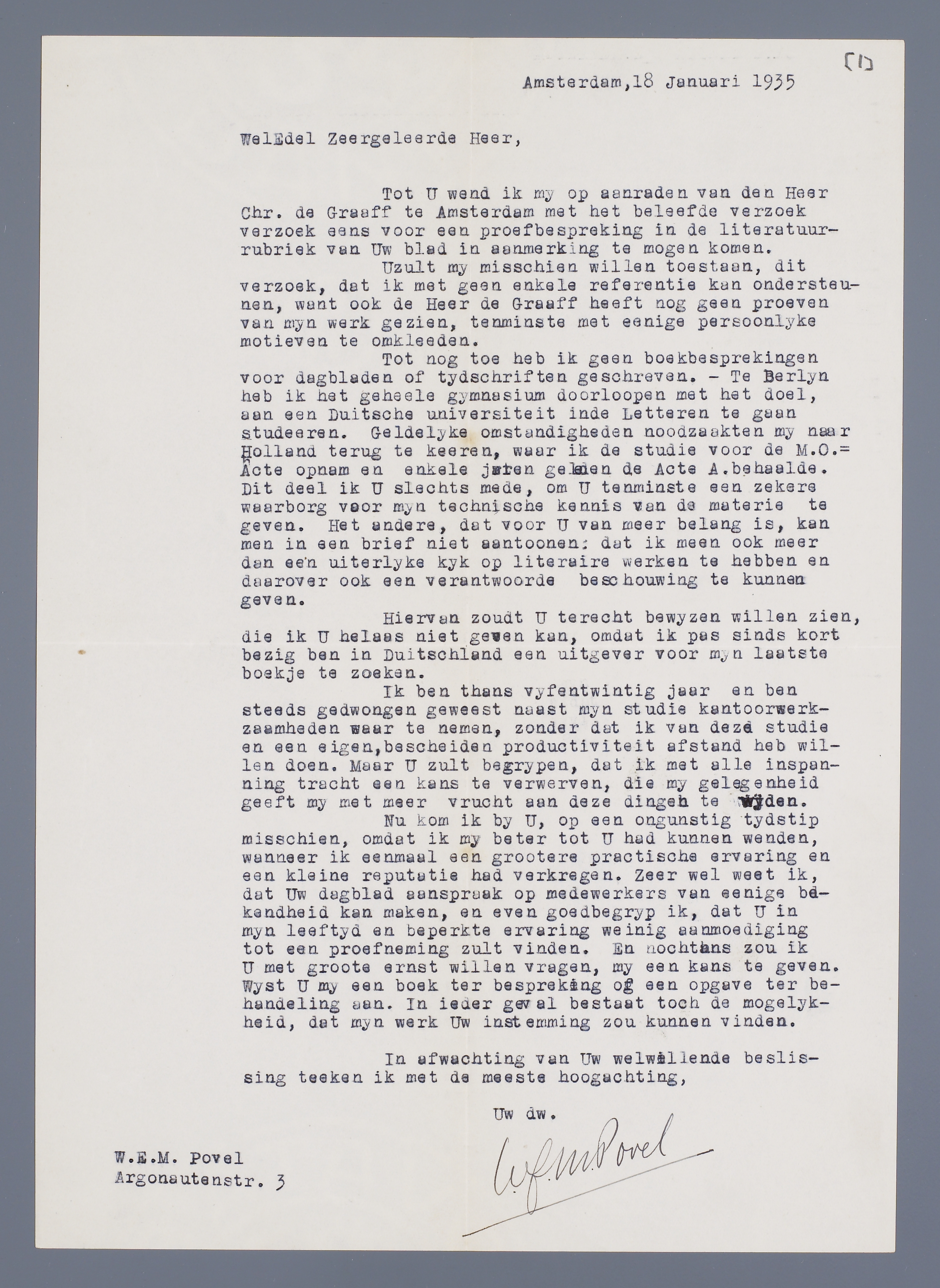 Nu kom ik by U, op een ongunstig tydstip misschien, omdat ik my beter tot U had kunnen wenden, wanneer ik eenmaal een grootere practische ervaring en een kleine reputatie had verkregen. Zeer wel weet ik, dat Uw dagblad aanspraak op medewerkers van eenige bekendheid kan maken, en evengoed begryp ik, dat U in myn leeftyd en beperkte ervaring weinig aanmoediging tot een proefneming zult vinden. En nochtans zou ik U met groote ernst willen vragen, my een kans te geven. Wyst U my een boek ter bespreking of een opgave ter behandeling aan. In ieder geval bestaat toch de mogelykheid, dat myn werk Uw instemming zou kunnen vinden.