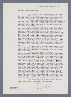 Ik ben thans vyfentwintig jaar en ben steeds gedwongen geweest naast myn studie kantoorwerkzaamheden waar te nemen, zonder dat ik van deze studie en een eigen, bescheiden productiviteit afstand heb willen doen. Maar U zult begrypen, dat ik met alle inspanning tracht een kans te verwerven, die my gelegenheid geeft my met meer vrucht aan deze dingen te wyden.