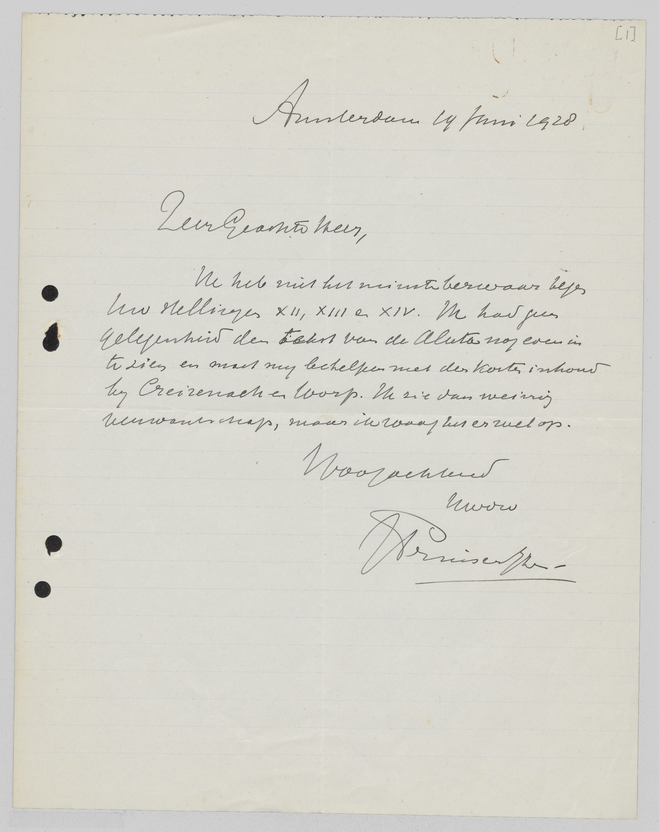 Ik heb niet het minste bezwaar tegen uw stellingen XII, XIII en XIV. Ik had geen gelegenheid den tekst van de [Aluta] nog even in te zien en moet mij behelpen met den korten inhoud bij Creizenach en Worp. Ik zie dan weinig verwantschap, maar ik waag het er wel op.