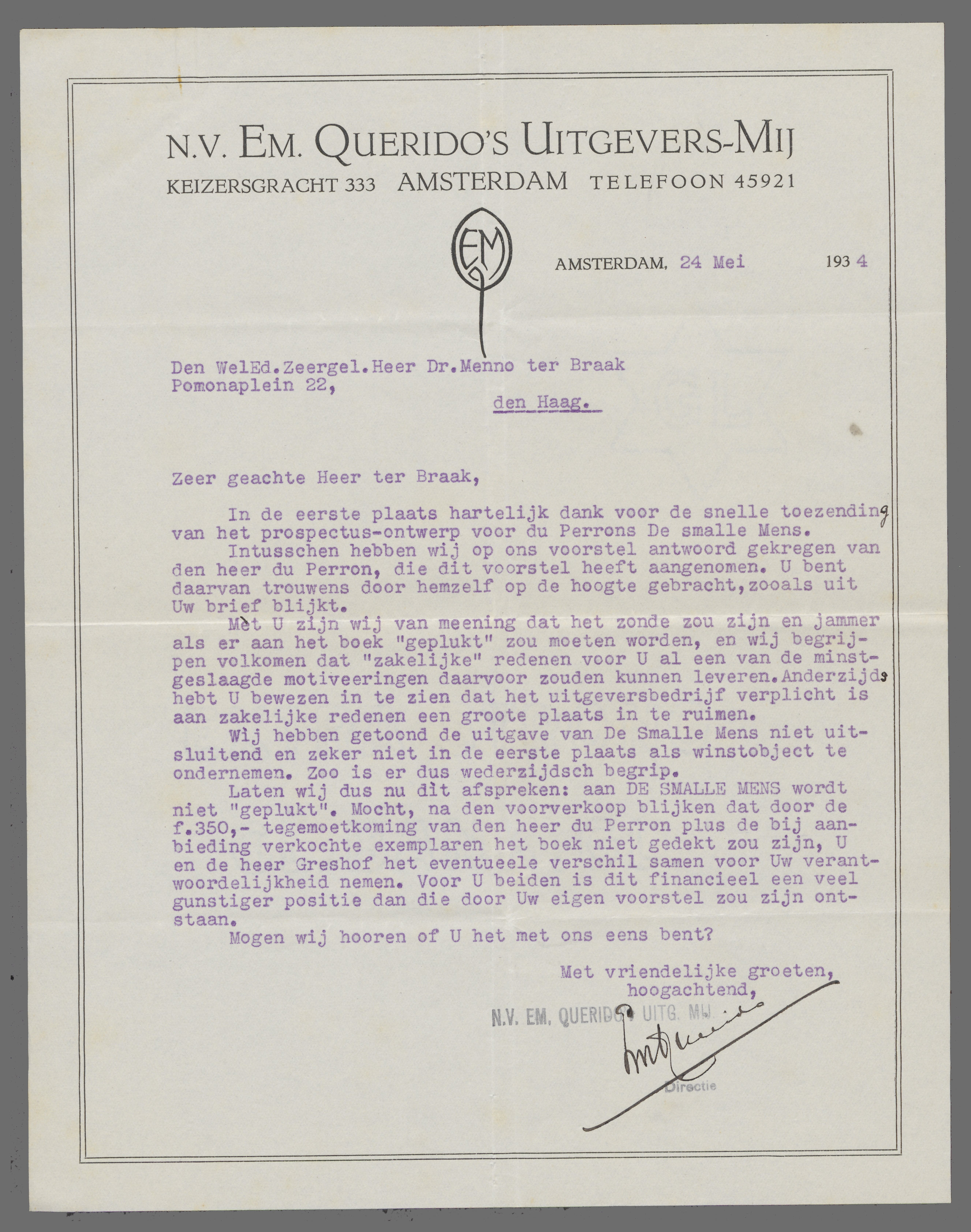 Laten wij dus nu dit afspreken: aan DE SMALLE MENS wordt niet ‘geplukt’. Mocht, na den voorverkoop blijken dat door de f.350,- tegemoetkoming van den heer du Perron plus de bij aanbieding verkochte exemplaren het boek niet gedekt zou zijn, U en de heer Greshof het eventueele verschil samen voor Uw verantwoordelijkheid nemen. Voor U beiden is dit financieel een veel gunstiger positie dan die door Uw eigen voorstel zou zijn ontstaan.