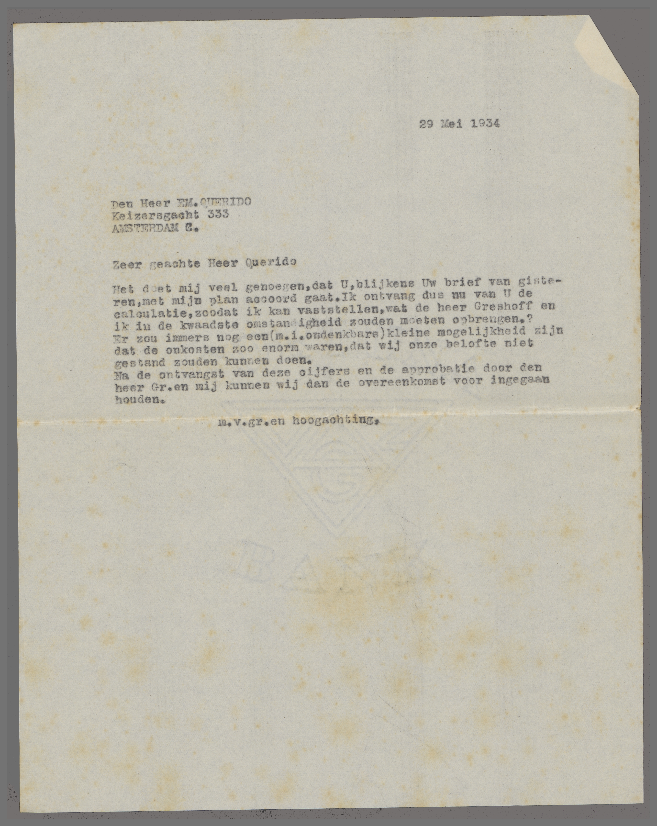 Het doet mij veel genoegen, dat U, blijkens Uw brief van gisteren, met mijn plan accoord gaat. Ik ontvang dus nu van U de calculatie, zoodat ik kan vaststellen, wat de heer Greshoff en ik in de kwaadste omstandigheid zouden moeten opbrengen? Er zou immers nog een (m.i. ondenkbare) kleine mogelijkheid zijn dat de onkosten zoo enorm waren, dat wij onze belofte niet gestand zouden kunnen doen.