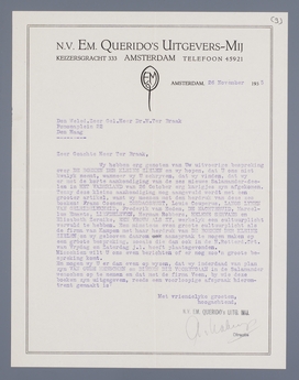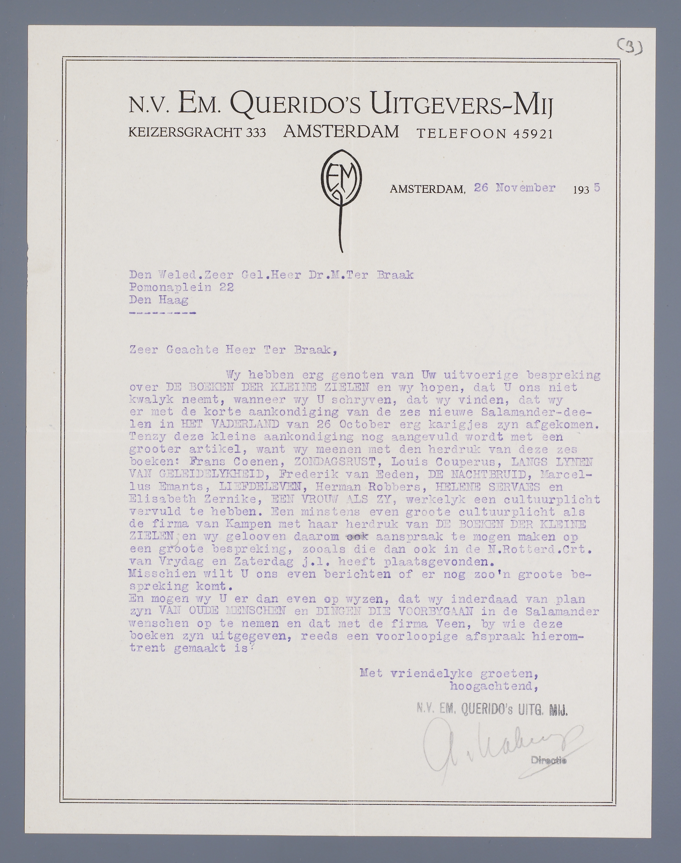 Wy hebben erg genoten van Uw uitvoerige bespreking over De boeken der kleine zielen en wy hopen, dat U ons niet kwalyk neemt, wanneer wy U schryven, dat wy vinden, dat wy er met de korte aankondiging van de zes nieuwe Salamander-deelen in Het Vaderland van 26 October erg karigjes zyn afgekomen. Tenzy deze kleine aankondiging nog aangevuld wordt met een grooter artikel, want wy meenen met den herdruk van deze zes boeken: Frans Coenen, Zondagsrust, Louis Couperus, Langs lynen van geleidelykheid, Frederik van Eeden, De nachtbruid, Marcellus Emants, Liefdeleven, Herman Robbers, Helene Servaes en Elisabeth Zernike, Een vrouw als zy, werkelyk een cultuurplicht vervuld te hebben. Een minstens even groote cultuurplicht als de firma van Kampen met haar herdruk van De boeken der kleine zielen; en wy gelooven daarom aanspraak te mogen maken op een groote bespreking, zooals die dan ook in de N.Rotterd.Crt. van Vrydag en Zaterdag j.l. heeft plaatsgevonden.