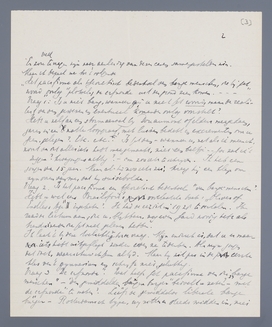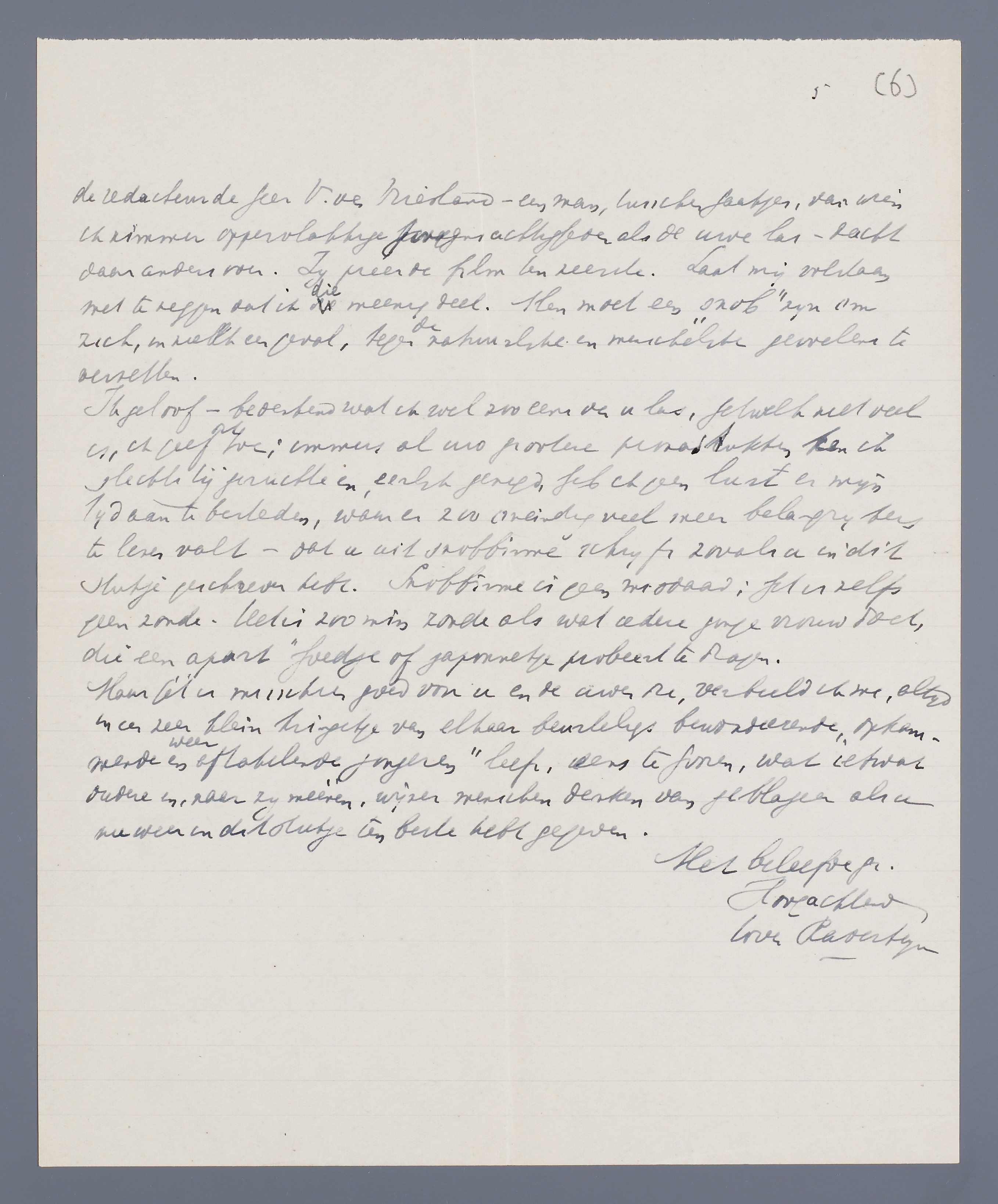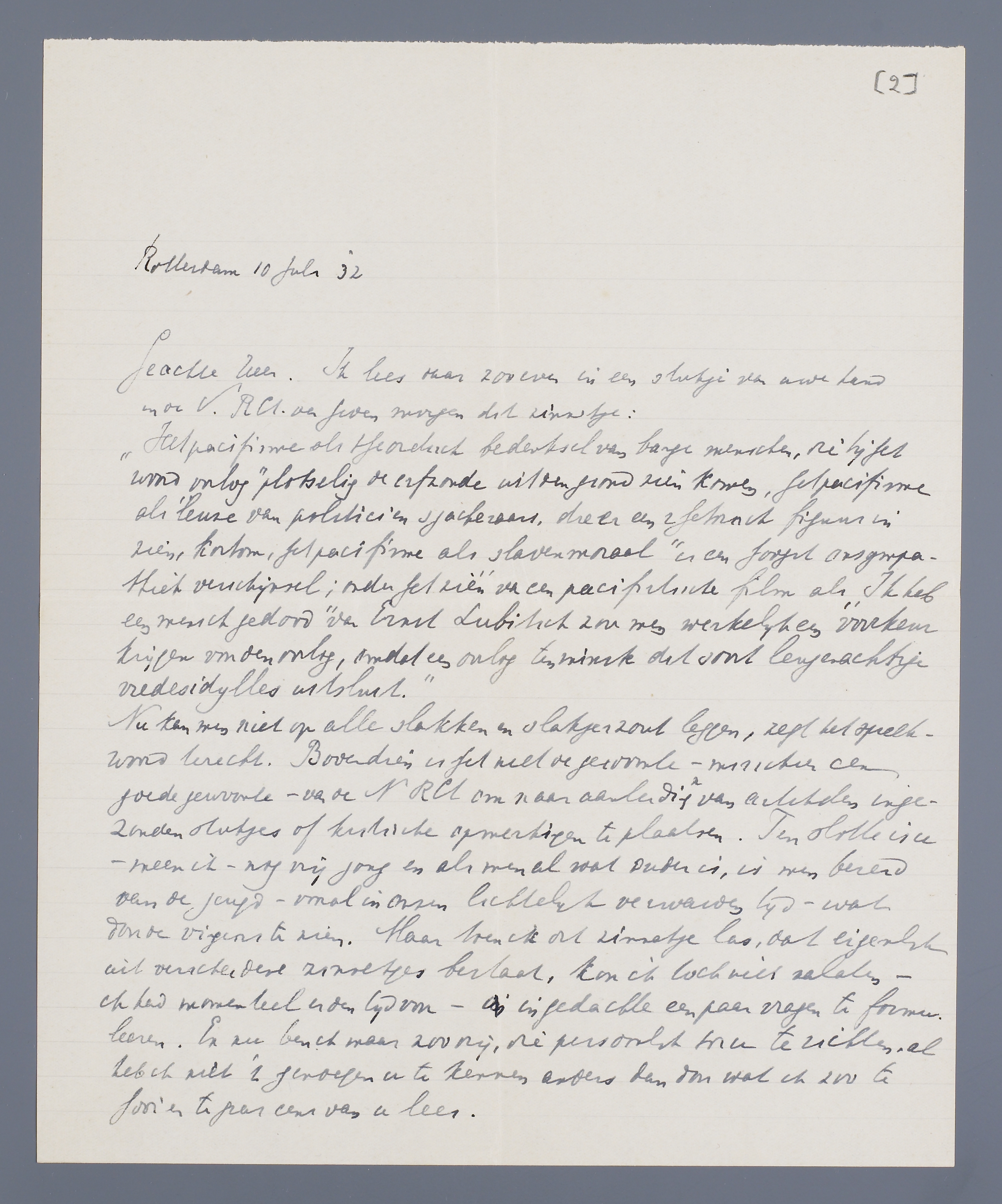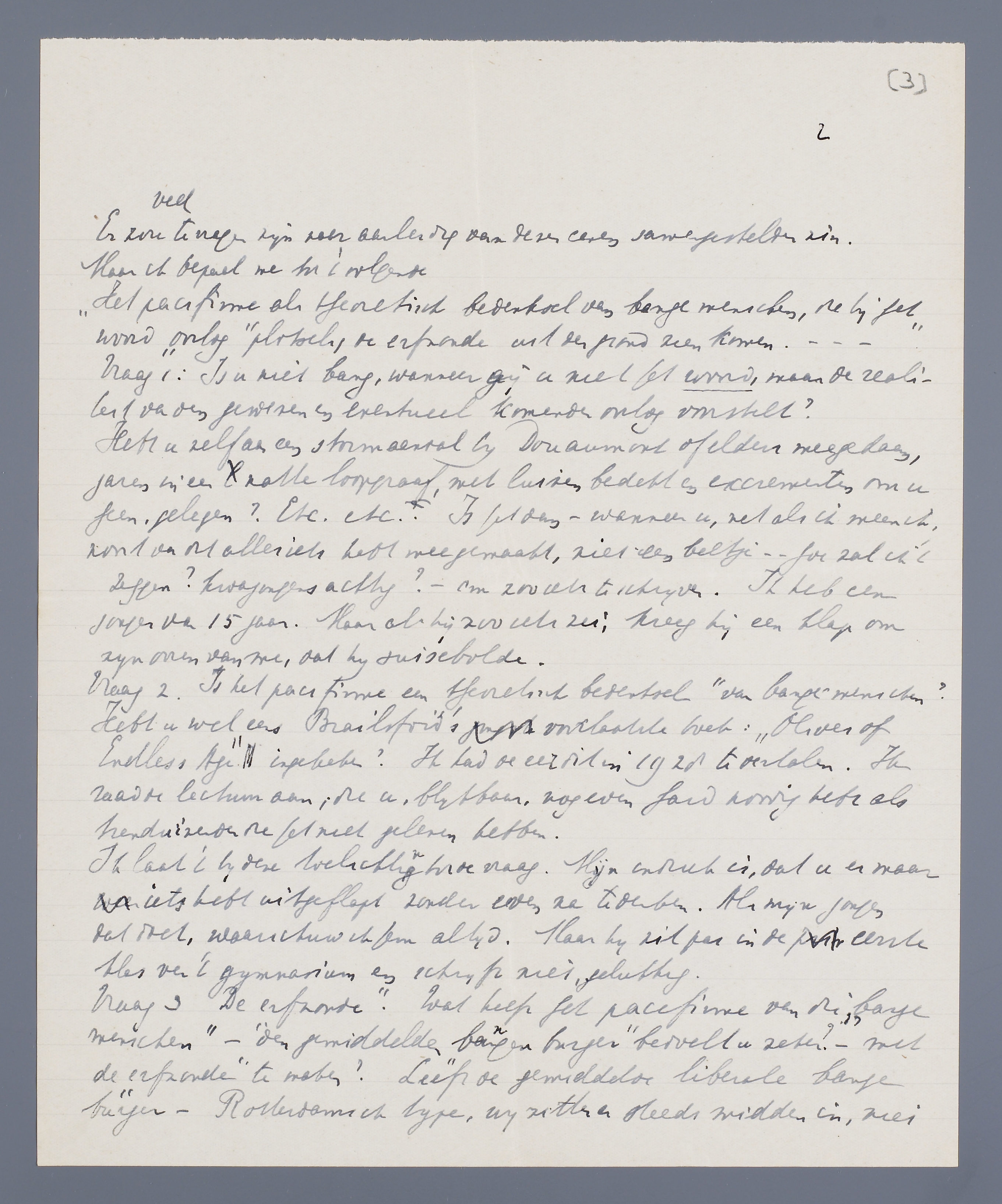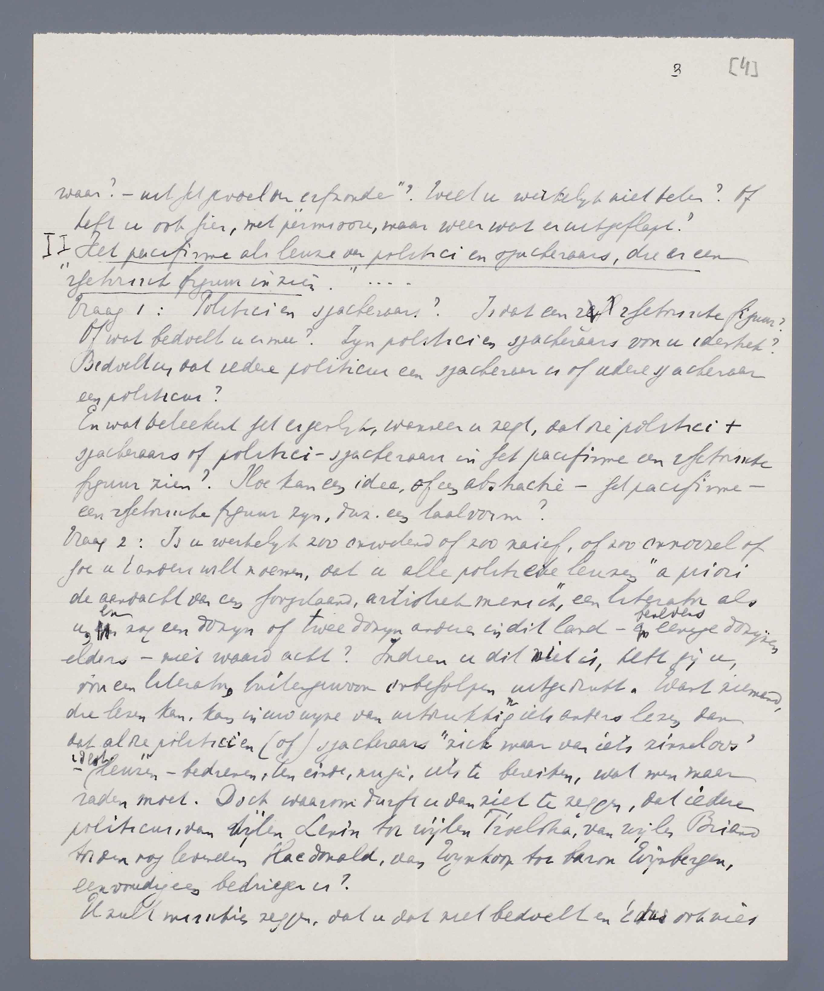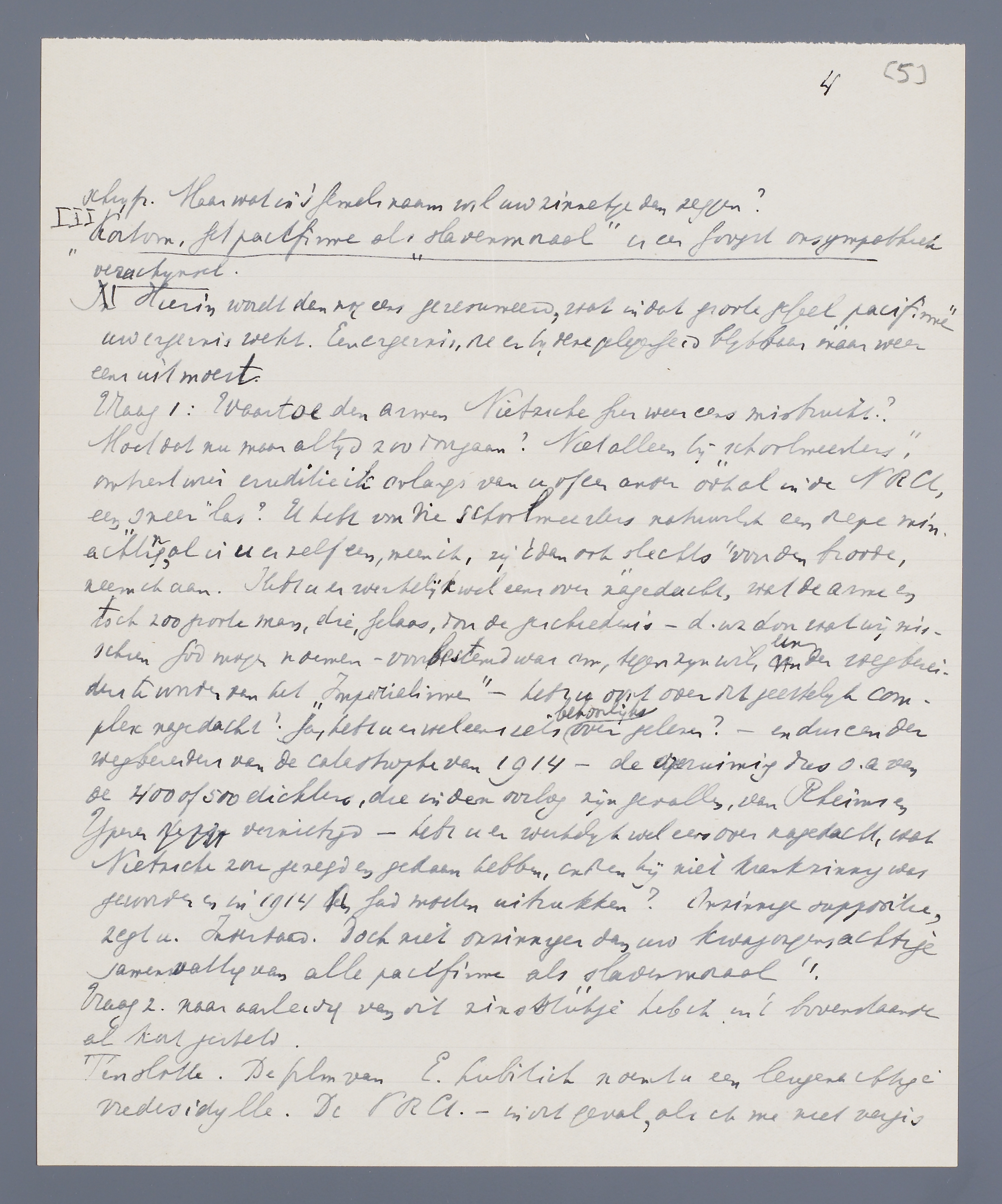 Vraag 1: Waartoe den armen Nietzsche hier weer eens misbruikt? Moet dat nu altijd maar zoo doorgaan? Niet alleen bij ‘schoolmeesters’, omtrent wier eruditie ik onlangs van u of een ander ook al in de NRCt een ‘sneer’ las? U hebt voor die schoolmeesters natuurlijk een diepe minachting, al is u er zelf een, meen ik, zij het dan ook slechts voor den broode, neem ik aan. Hebt u er werkelijk wel eens over nagedacht, wat de arme en toch zoo groote man, die, helaas, door de geschiedenis - d.w.z. door wat wij misschien zoo mogen noemen - voorbestemd was om, tegen zijn wil, een der wegbereiders te worden van het ‘Imperialisme’ - hebt u ook over dit geestelijk complex nagedacht? Ja, hebt u er wel eens iets behoorlijks over gelezen? - en dus een der wegbereiders van de catastrophe van 1914 - de opruiming dus o.a. van de 400 of 500 dichters, die in den oorlog zijn gevallen, [van] Rheims en Yperen vernietigd - hebt u er werkelijk wel eens over nagedacht, wat Nietzsche zou gezegd en gedaan hebben, indien hij niet krankzinnig was geworden en in 1914 zelf had moeten uitrukken? Onzinnige suppositie, zegt u. Inderdaad. Doch niet onzinniger dan uw kwajongensachtige samenvatting van alle pacifisme als ‘slavenmoraal’.
